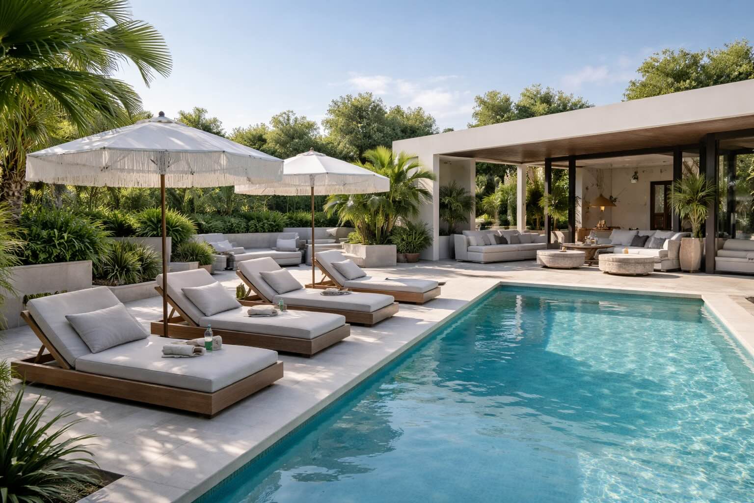 Obrázek 2. Zahradní lehátka u bazénu na exotické zahradě.