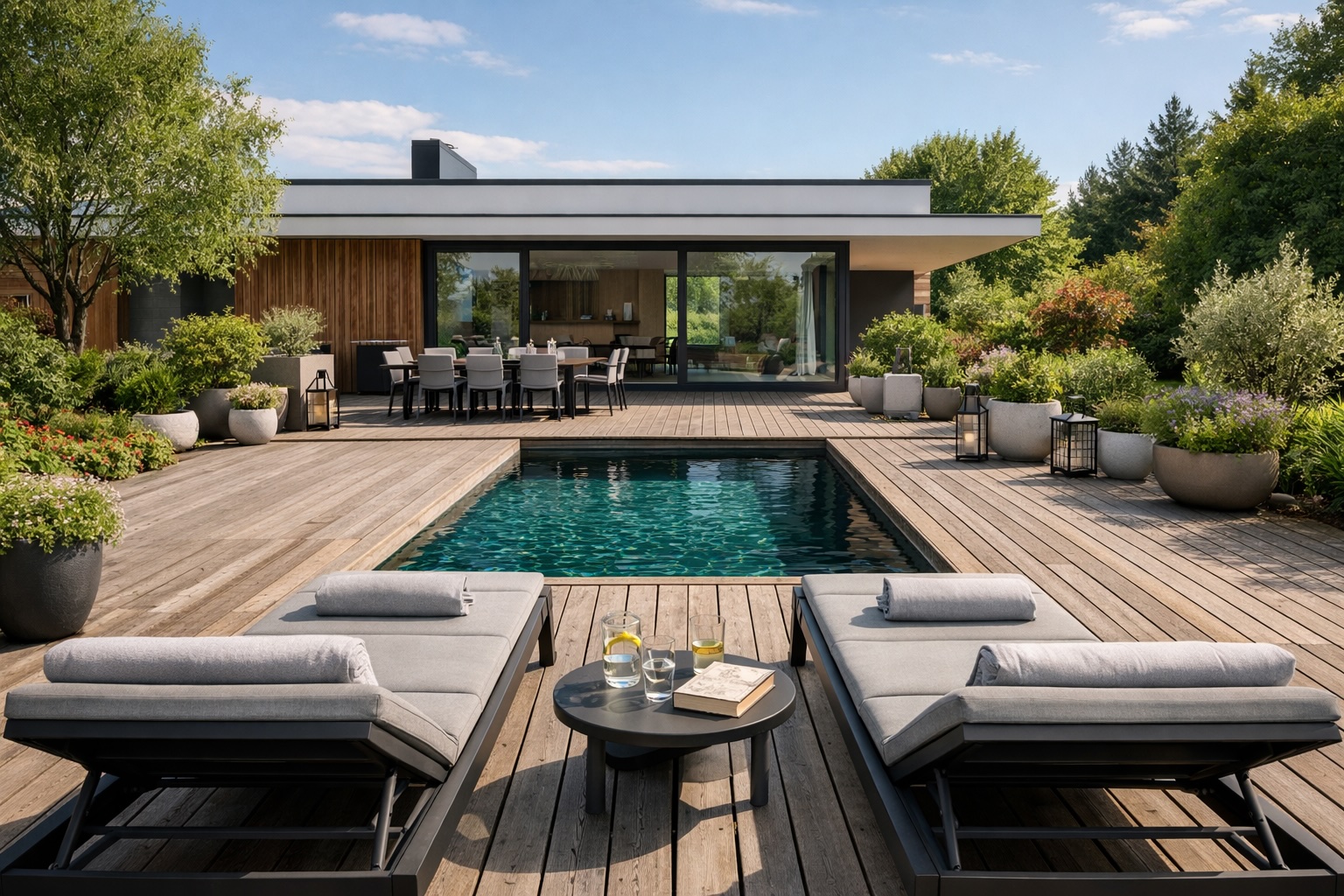 Obrázek 4. Zahradní lehátka u bazénu na terase rodinného domu.