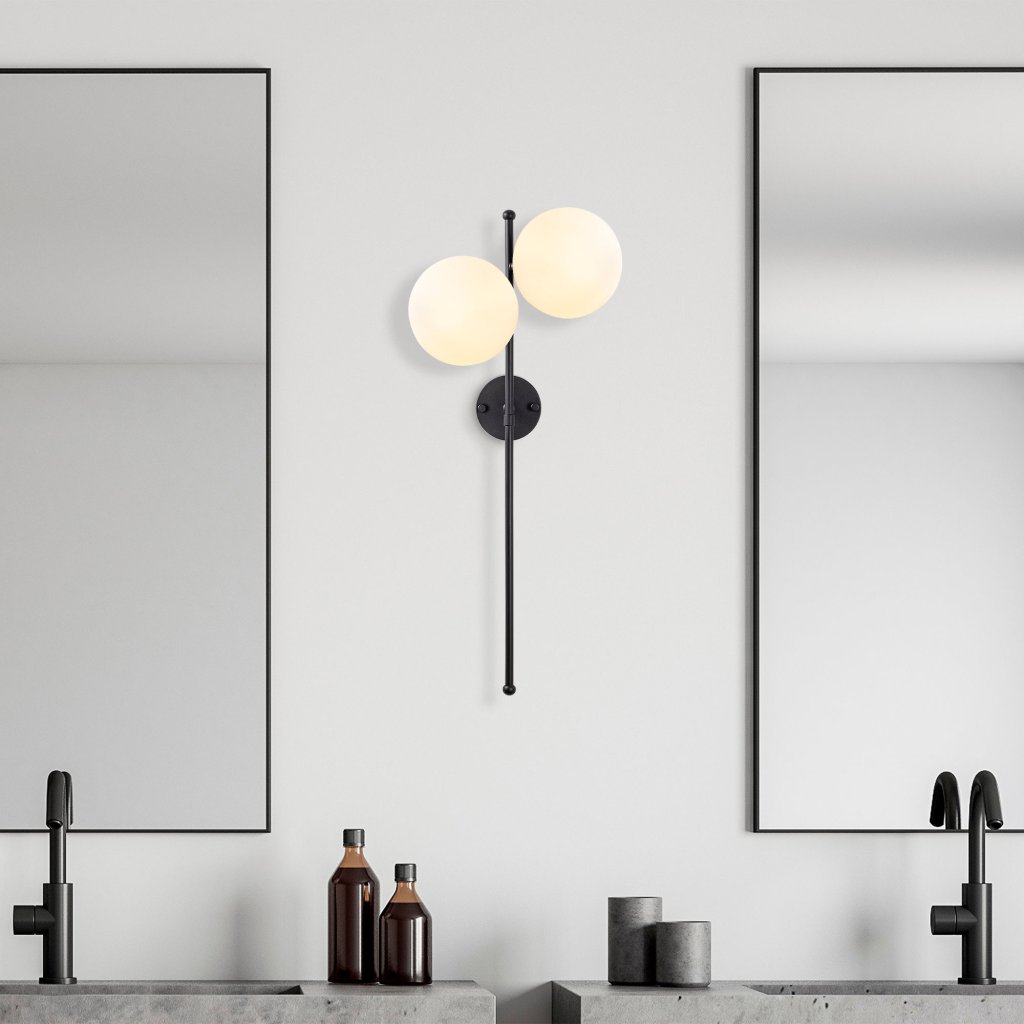 Nádherné nástěnné osvětlení FAZLI od výrobce stylového osvětlení OPVIQ. Svítidlo FAZLI tvoří kovová krytka, ukrývající uchycení a elektrické kabely, ke které je připevněna kovová centrální tyč. V horní části jsou kolmo, kousek pod sebou, přichyceny 2 objímky pro žárovky a koule z mléčného bílého skla. Tyč je na krajích ozdobena kulatým zakončením. Vše vyrobeno v kovovém provedení s elegantní černou barvou.