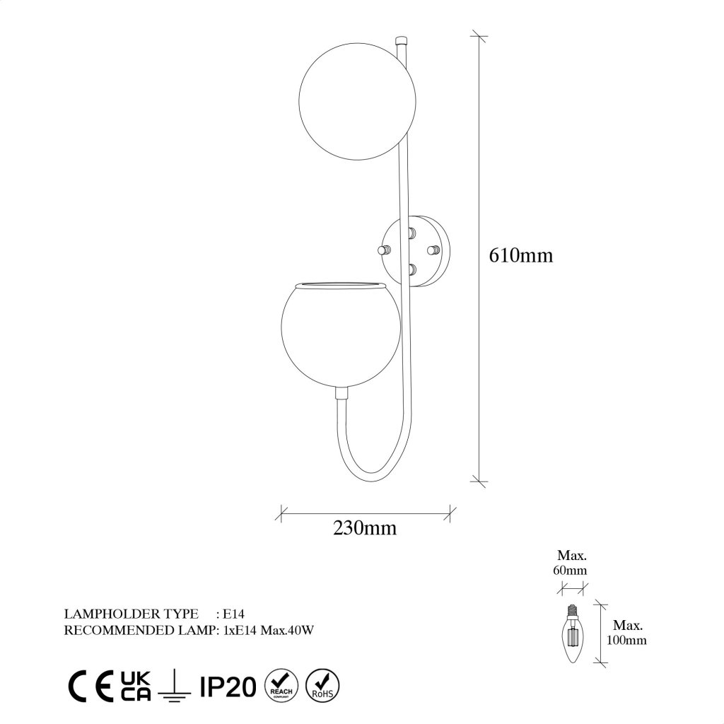 Nádherné nástěnné osvětlení POT od výrobce stylového osvětlení OPVIQ. Svítidlo POT tvoří kovová krytka, ukrývající uchycení a elektrické kabely, ke které je připevněna kovová centrální tyč. Na vrchu je kolmo přichycena objímka pro žárovku a koule z mléčného bílého skla. Tyč je ve spodní části zaoblena a drží tak kalíšek, který můžete využít dle své fantazie. Vše vyrobeno v kovovém provedení s elegantní zlatou barvou.