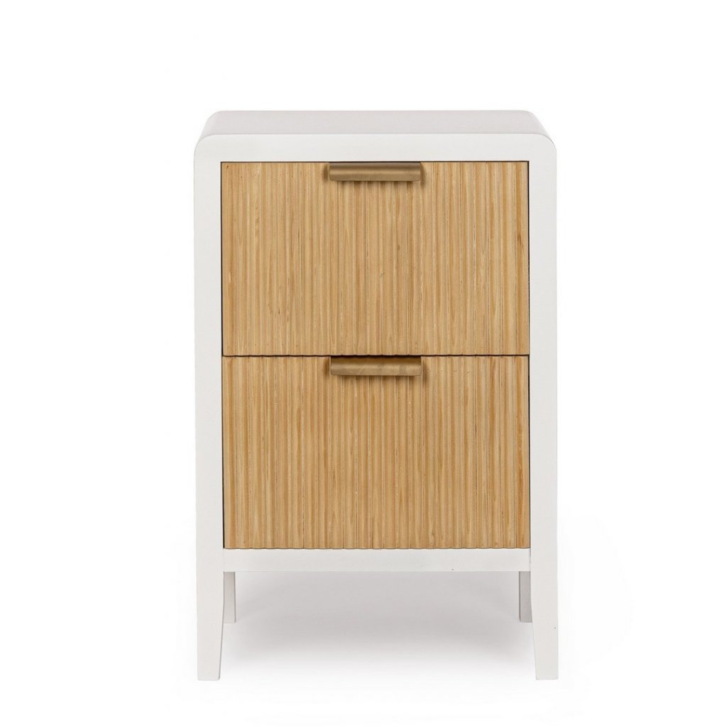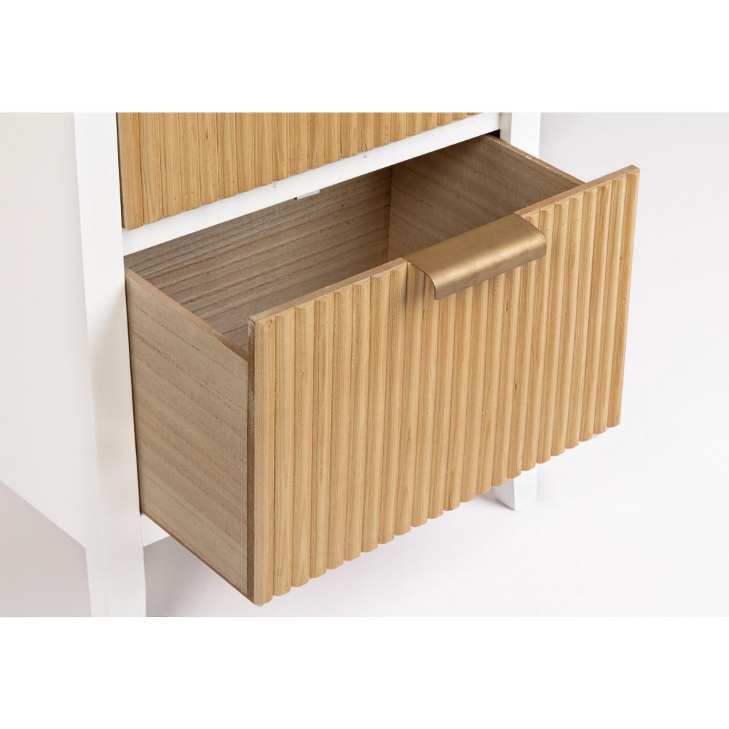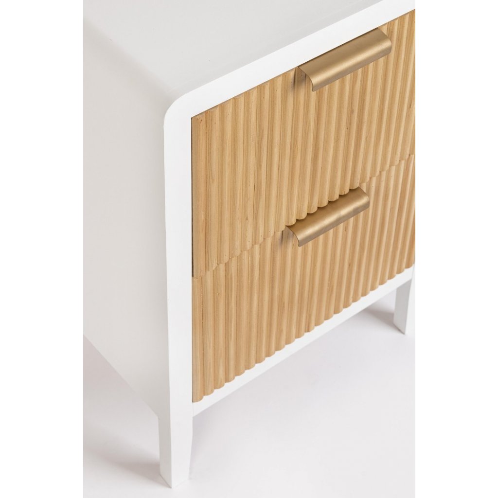 Designový noční stolek CHARLEY od italské firmy stylového nábytku BIZZOTTO. Stolek CHARLEY je vyrobený z mdf desky v bílém provedení se 2 zásuvkami z přírodního dřeva paulovnie, které jsou zdobené vyřezávanými vertikálními liniemi s kovovými úchyty ve zlaté barvě. Velice elegantní noční stolek si opravdu zamilujete.