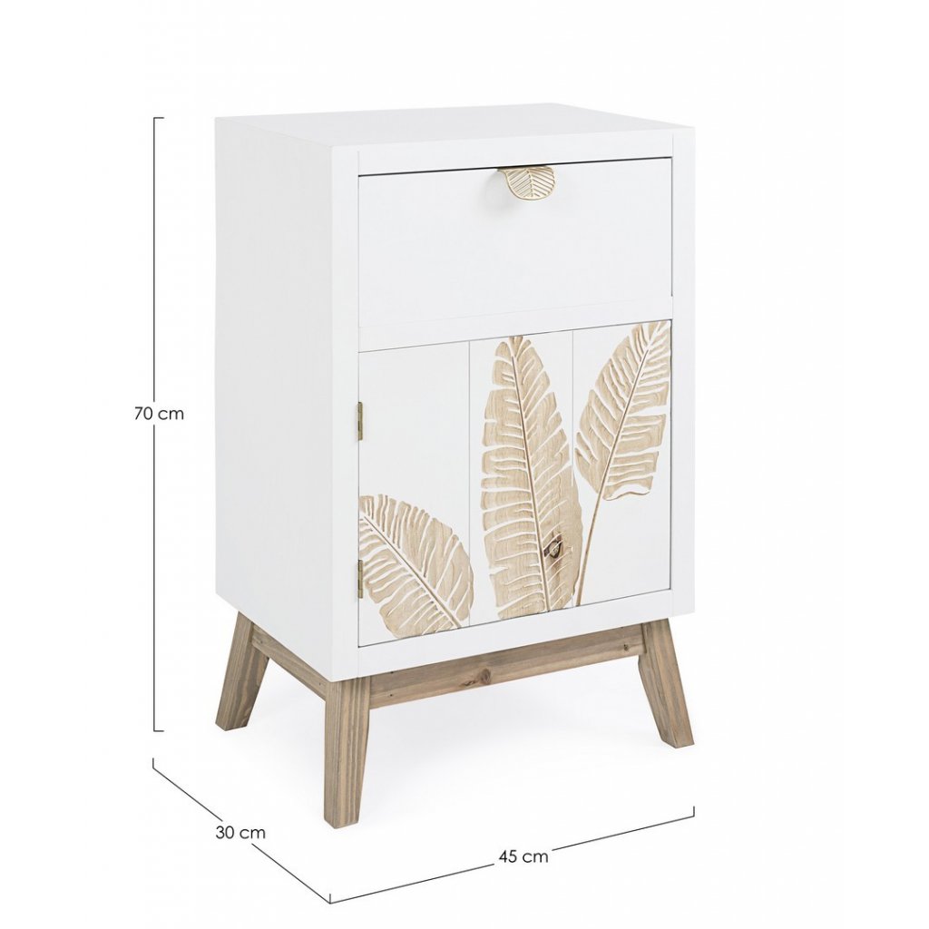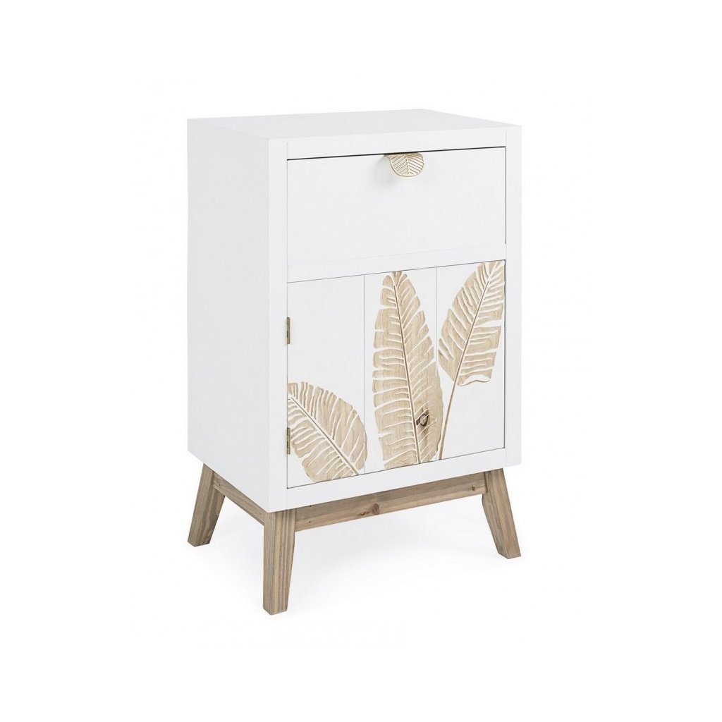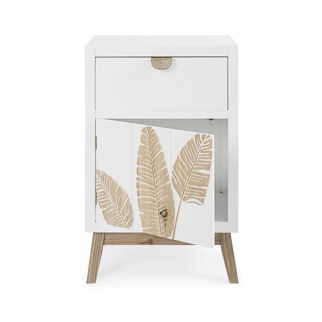 Designový noční stolek FOLIUM od italské firmy stylového nábytku BIZZOTTO. Stolek FOLIUM je vyrobený z jedlového dřeva a mdf desky v krásném čistě bílém provedení. Stolek má 1 zásuvky s ozdobnými kovovými úchyty ve zlaté barvě a jedny uzavíratelná dvířka. Ty se otevírají stisknutím a drží pomocí magnetu. Na dvířkách je půvabné zlaté zdobení, připomínající tvar listu, které je dělané ručně. Velice elegantní noční stolek si opravdu zamilujete.