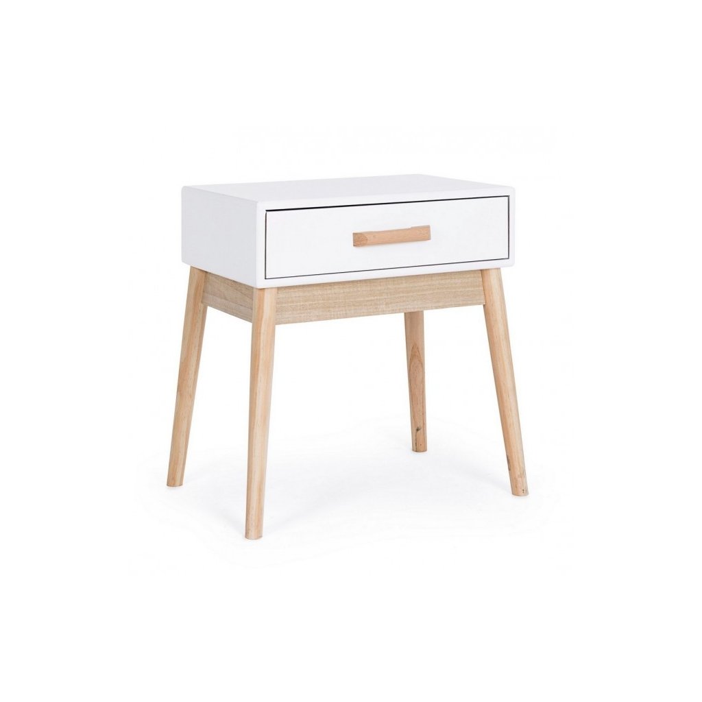 Noční stolek ORDINARY od italského výrobce stylového nábytku BIZZOTTO. ORDINARY je vyráběn v kombinaci mdf dřevovláknitých desek a dřevovláknité mdf desky a masivního dřeva Paulownie. To vše v krásné bílé barvě. Celý stolek s 1 výsuvnou zásuvkou a dřevěnou úchytkou podpírají 4 nohy z masivního dřeva borovice v transparentním laku.