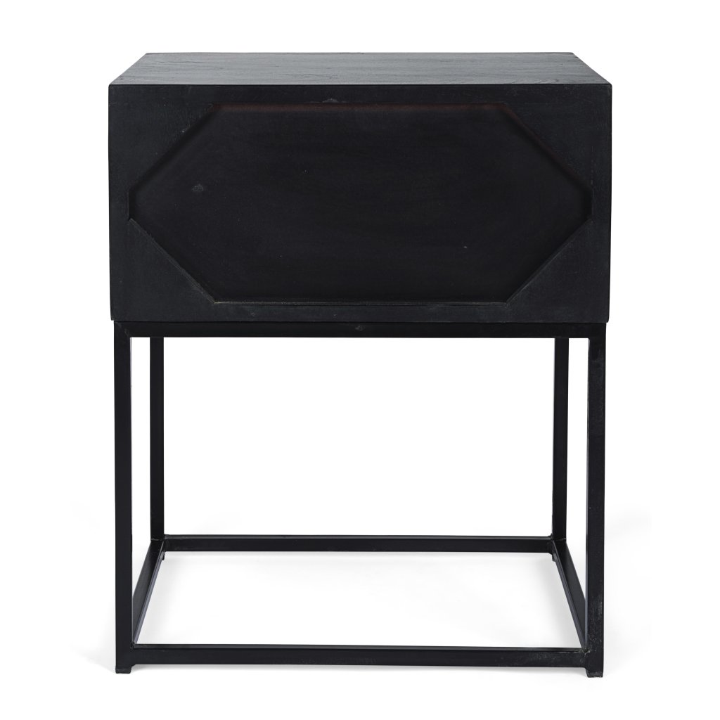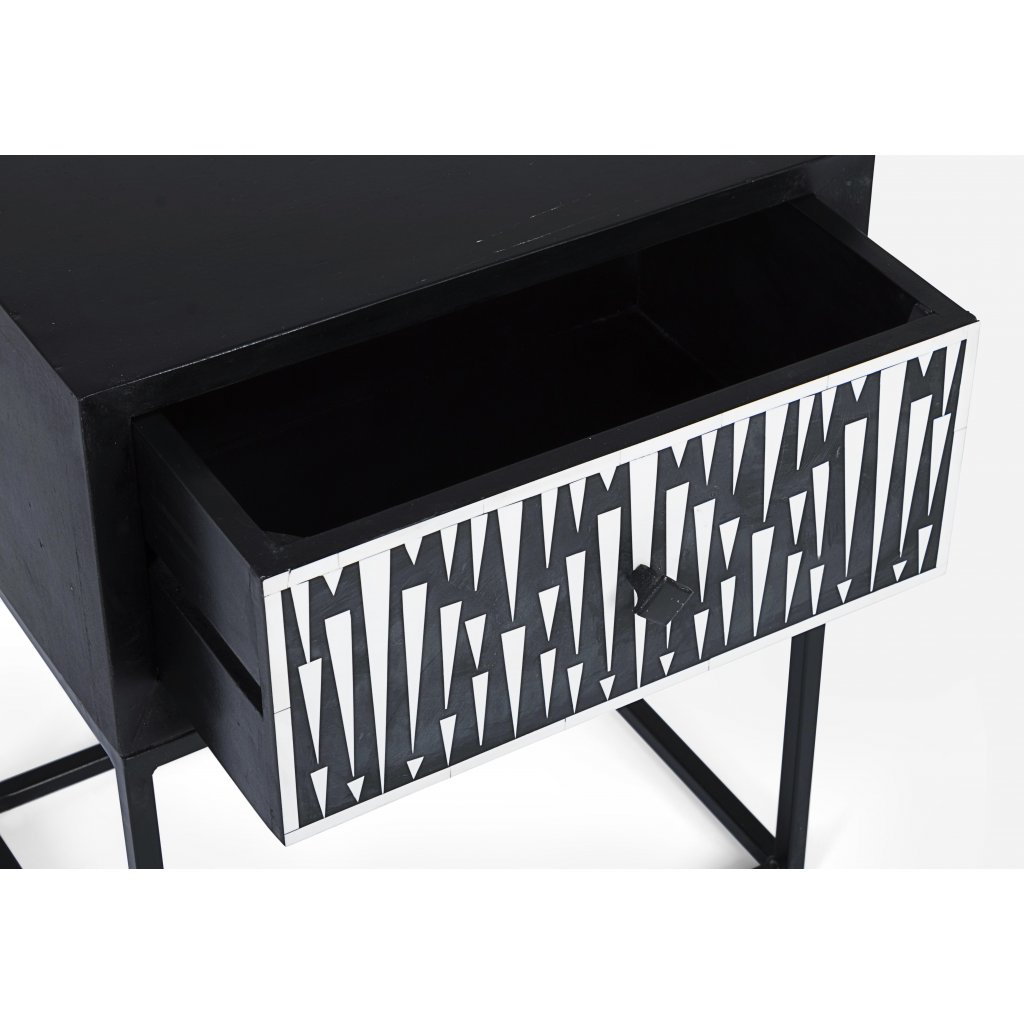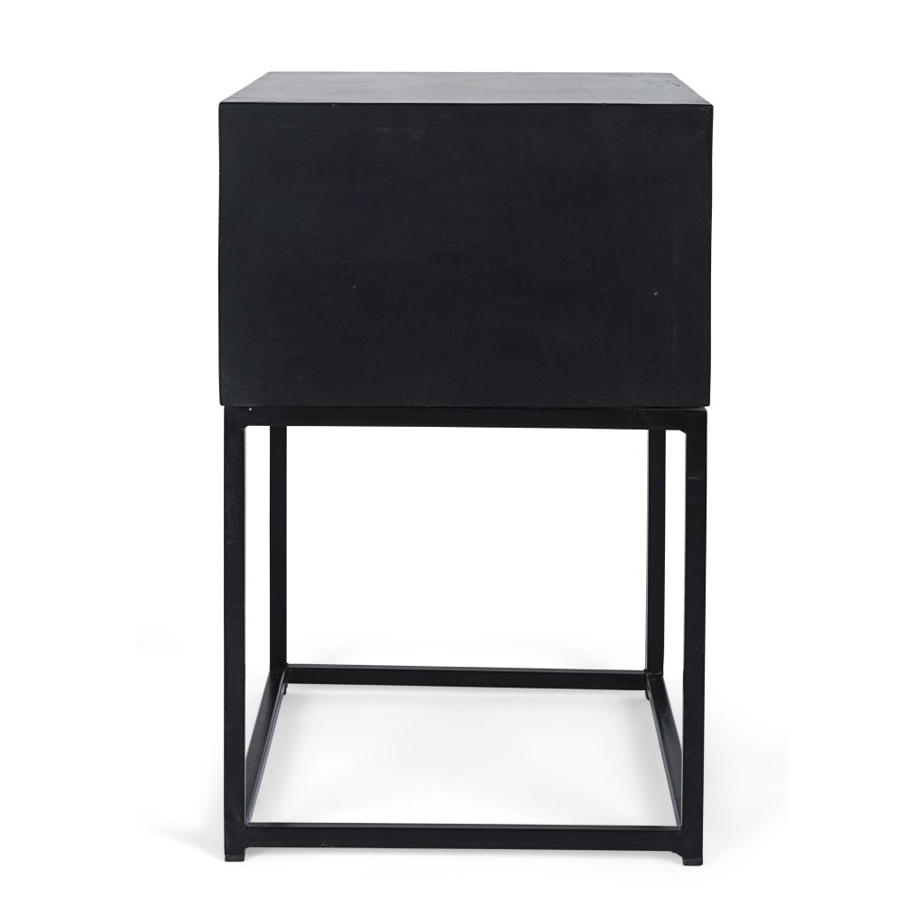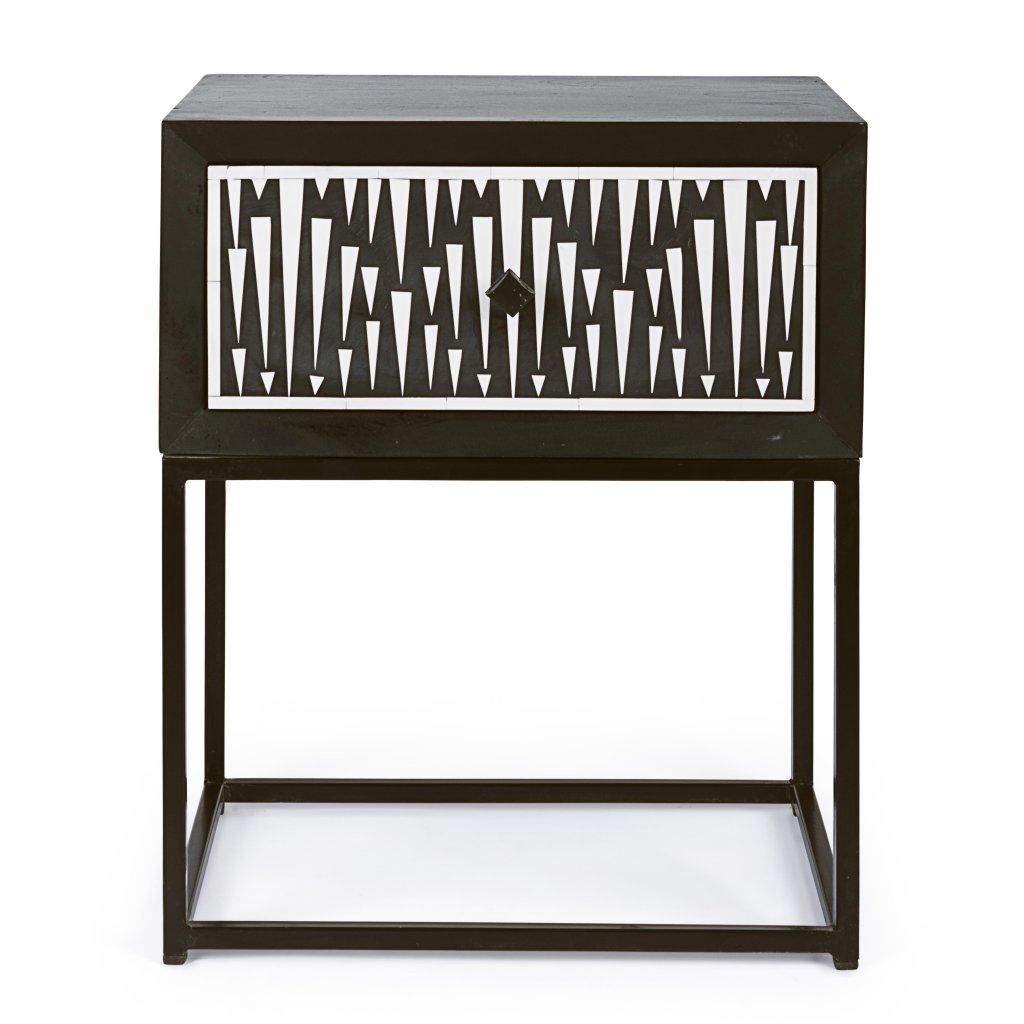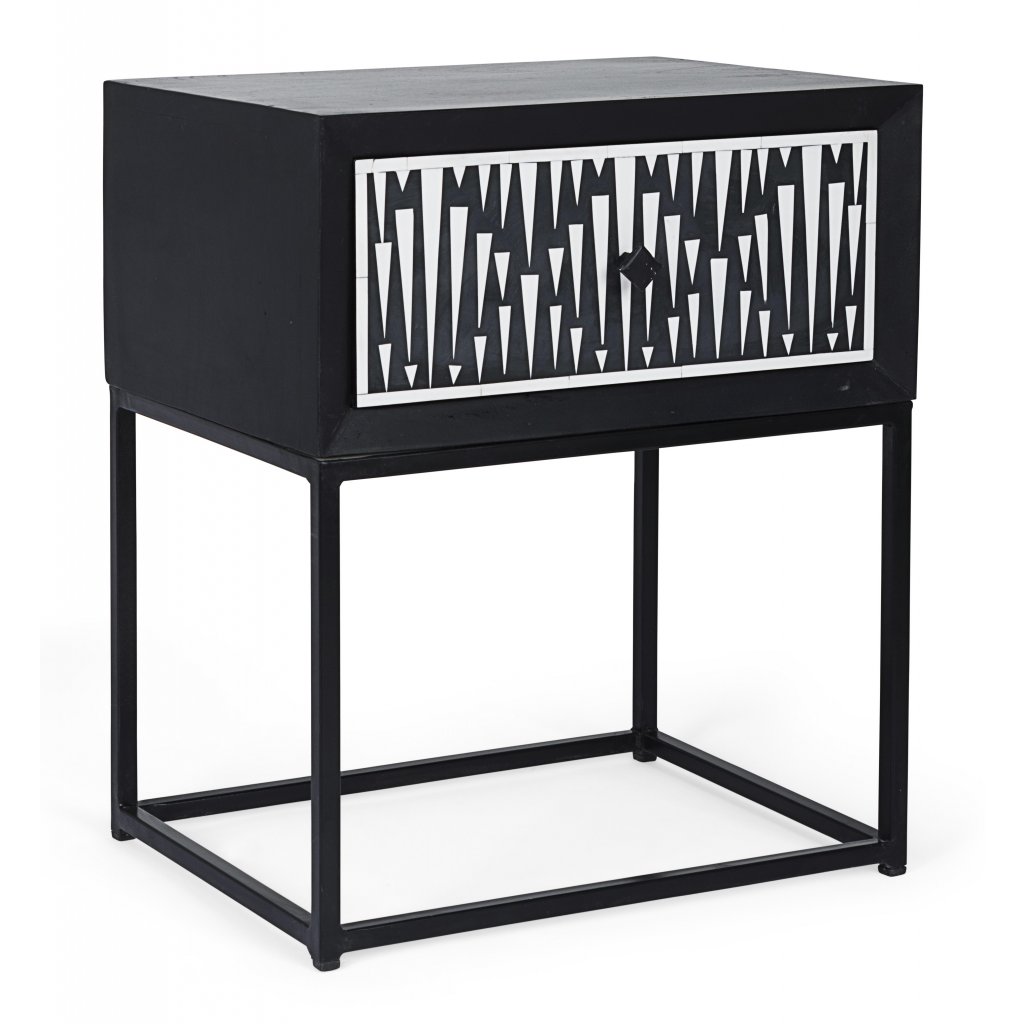 Designový noční stolek JANESH od italské firmy BIZZOTTO vyrobený z dřeva mangovníku, zásuvky z MDF desky, předek s bílo-černou mosaikou a konstrukcí z černě lakované oceli. Doplňuje kovová úchytka. Velice krásný moderní stolek je nejen stylovým doplňkem, ale i praktickým pomocníkem, do kterého si můžete odložit drobnosti. Krásně se hodí do moderních interiérů.