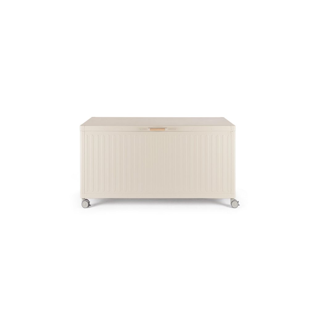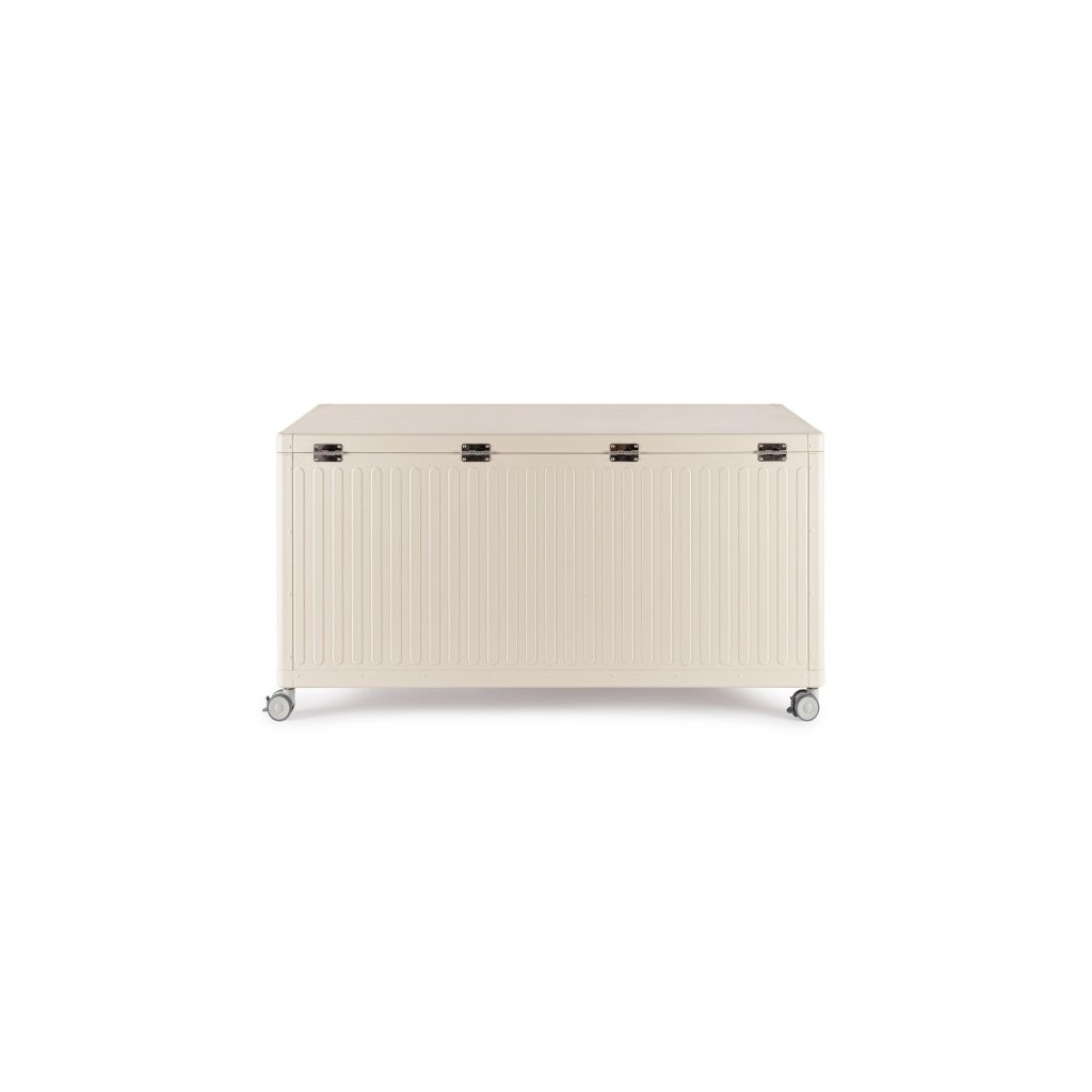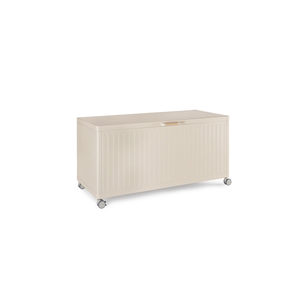 Zahradní úložný box OCEAN od italského výrobce stylového nábytku BIZZOTTO. Tento parádní kovový box v béžové barvě, má spoustu úložného prostoru pod víkem s rukojetí, jehož otevírání usnadňují dva plynové písty. Rukojeť je hliníková s aplikací PVC fólií s 3D efektem dřeva. Box můžete jednoduše přemisťovat díky praktickým uzamykatelným kolečkům. Perfektně sladíte s dalšími prvky z řady OCEAN, například ve stylové pergole. K dostání i v dalších barvách a velikostech.