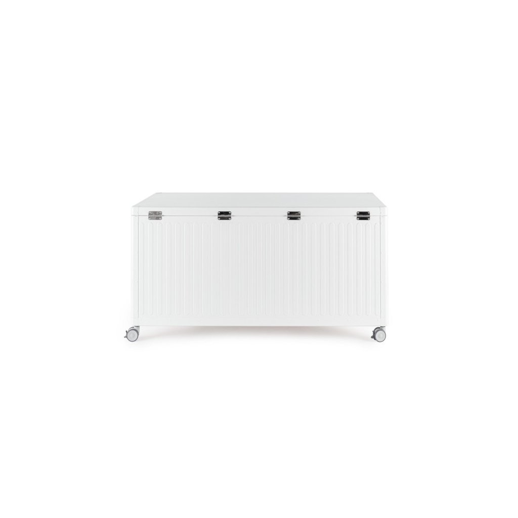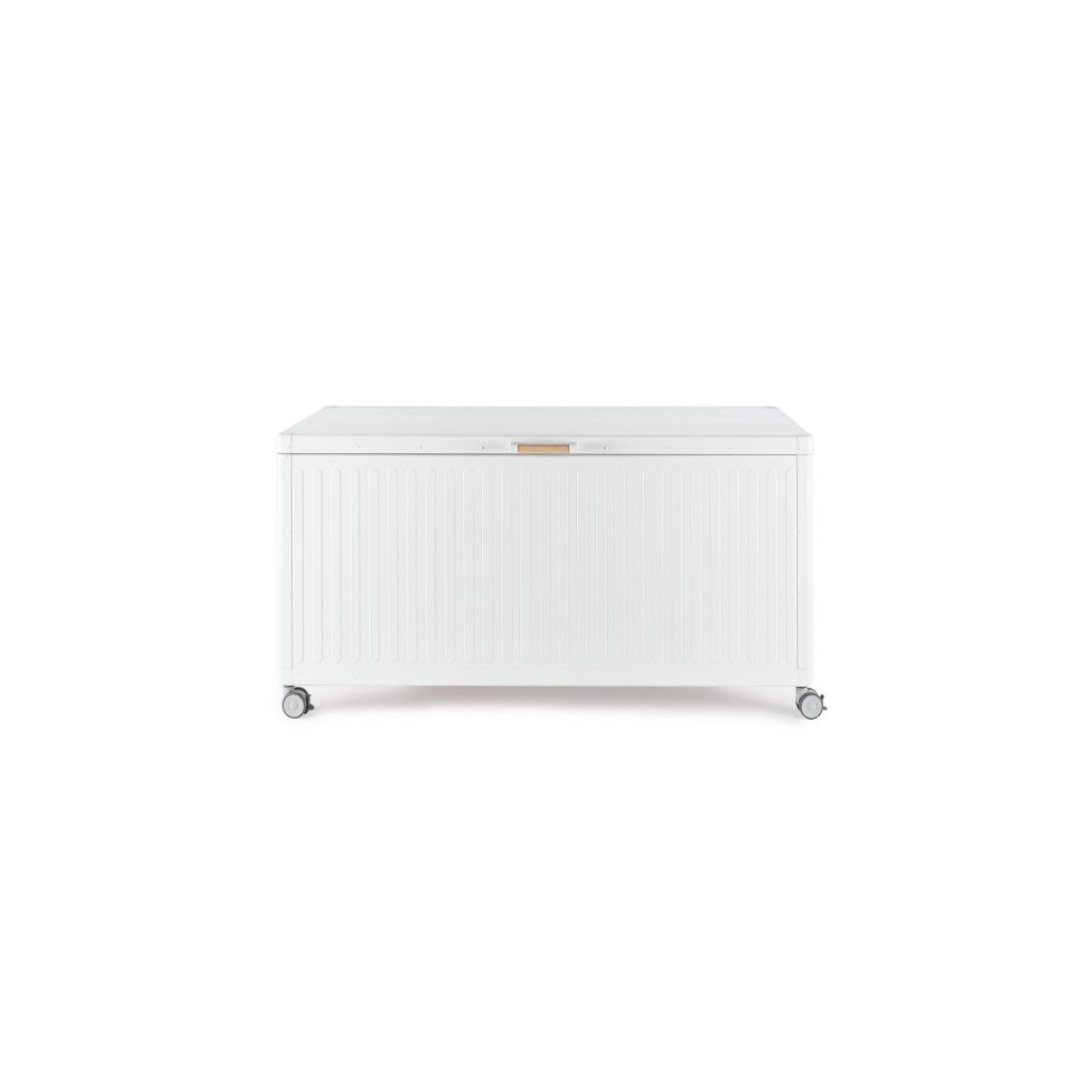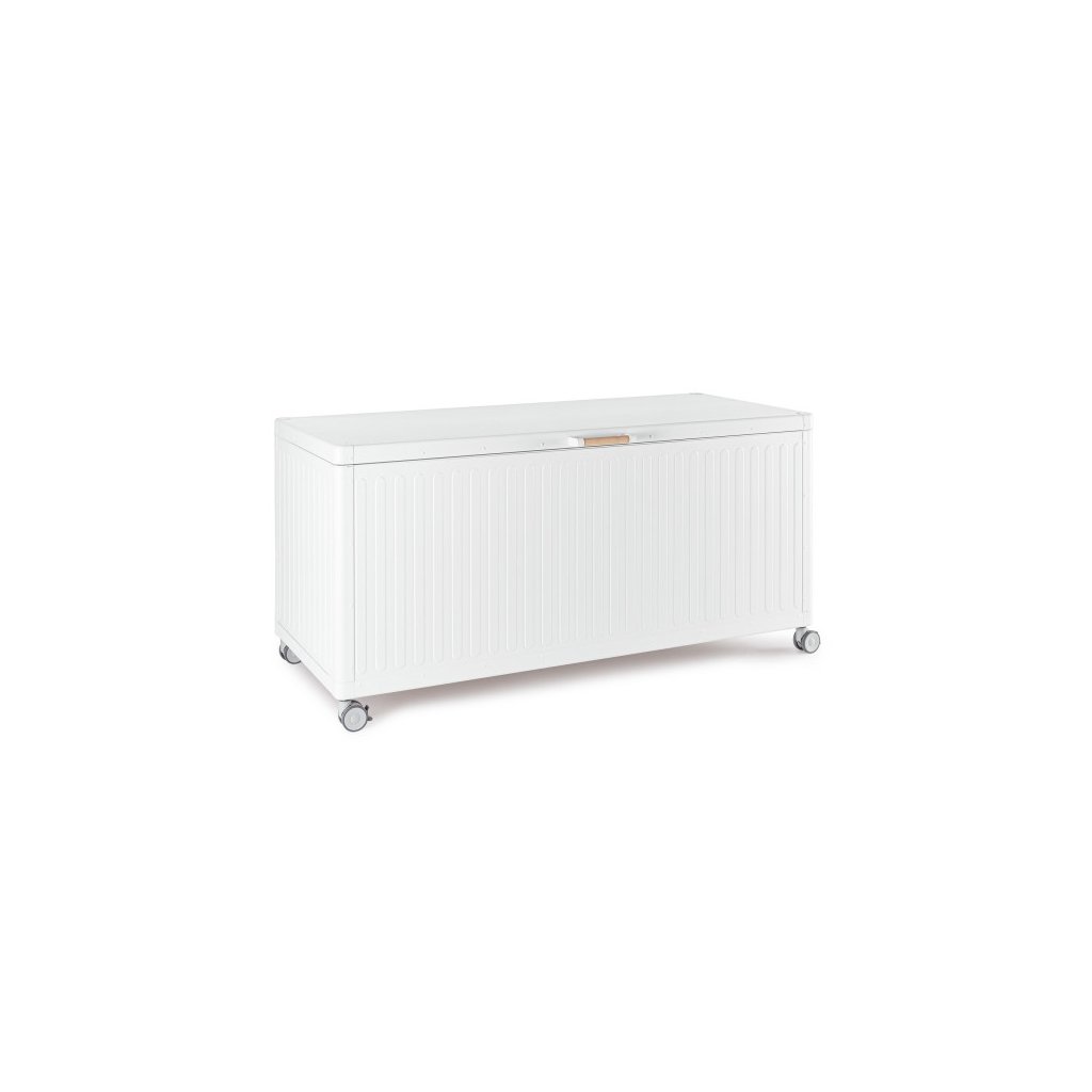 Zahradní úložný box OCEAN od italského výrobce stylového nábytku BIZZOTTO. Tento parádní kovový box v bílé barvě, má spoustu úložného prostoru pod víkem s rukojetí, jehož otevírání usnadňují dva plynové písty. Rukojeť je hliníková s aplikací PVC fólií s 3D efektem dřeva. Box můžete jednoduše přemisťovat díky praktickým uzamykatelným kolečkům. Perfektně sladíte s dalšími prvky z řady OCEAN, například ve stylové pergole. K dostání i v dalších barvách a velikostech.