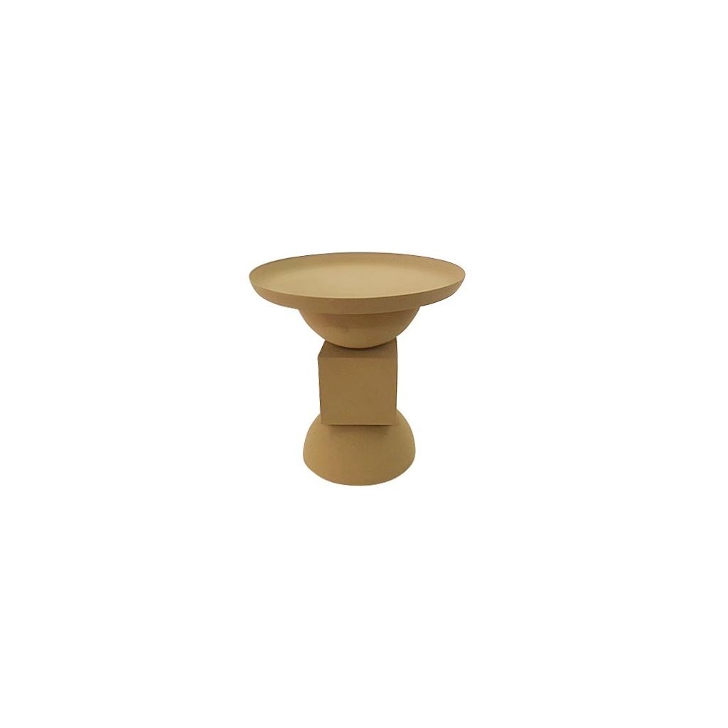 Designový odkládací stolek ALKA od italského výrobce stylového nábytku BIZZOTTOStolek ALKA má jednu centrální nohu složenou ze 3 geometrických těles a vrchní desku s průměrem 40,5 cm. ALKA je vyroben z oceli a je práškovaný ve žluté barvě. Ideální do vašeho obývacího pokoje hned vedle pohovky pro odložení kávy nebo čaje.