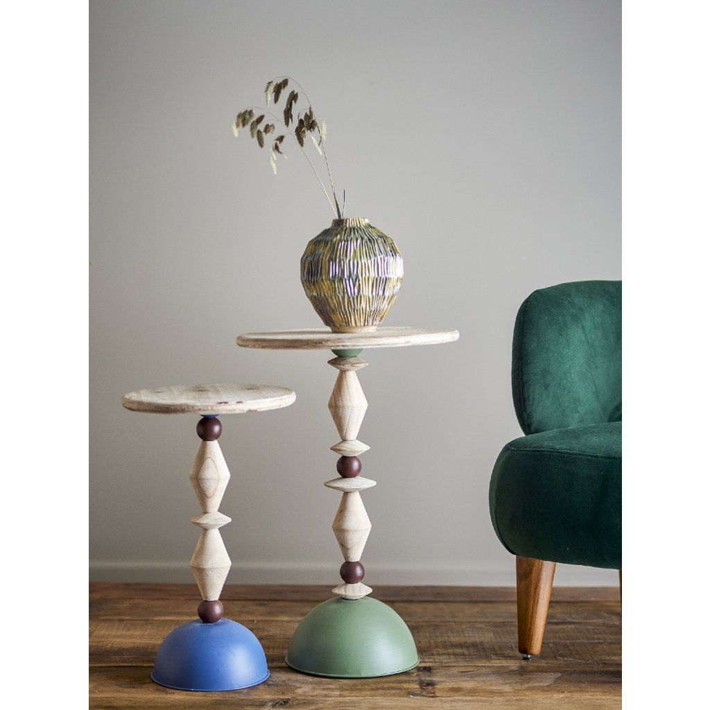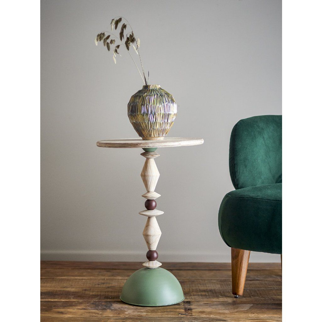 Designový odkládací stolek MANNELLI od dánské značky stylového nábytku BLOOMINGVILLE. Stolek zaujme svým osobitým a dekorativním vzhledem. Stolek tvoří kulatá deska o průměru 40 cm. Je vyroben z jedlového dřeva a železa a jeho design stojí na výrazné podstavcové konstrukci. Zelené provedení s patinovaným běleným efektem spolu s jemnými geometrickými detaily dodává stolku originalitu, hloubku a lehce rustikální charakter. Díky použití přírodních materiálů se mohou jednotlivé kusy mírně lišit barevností, což podtrhuje jejich jedinečnost.