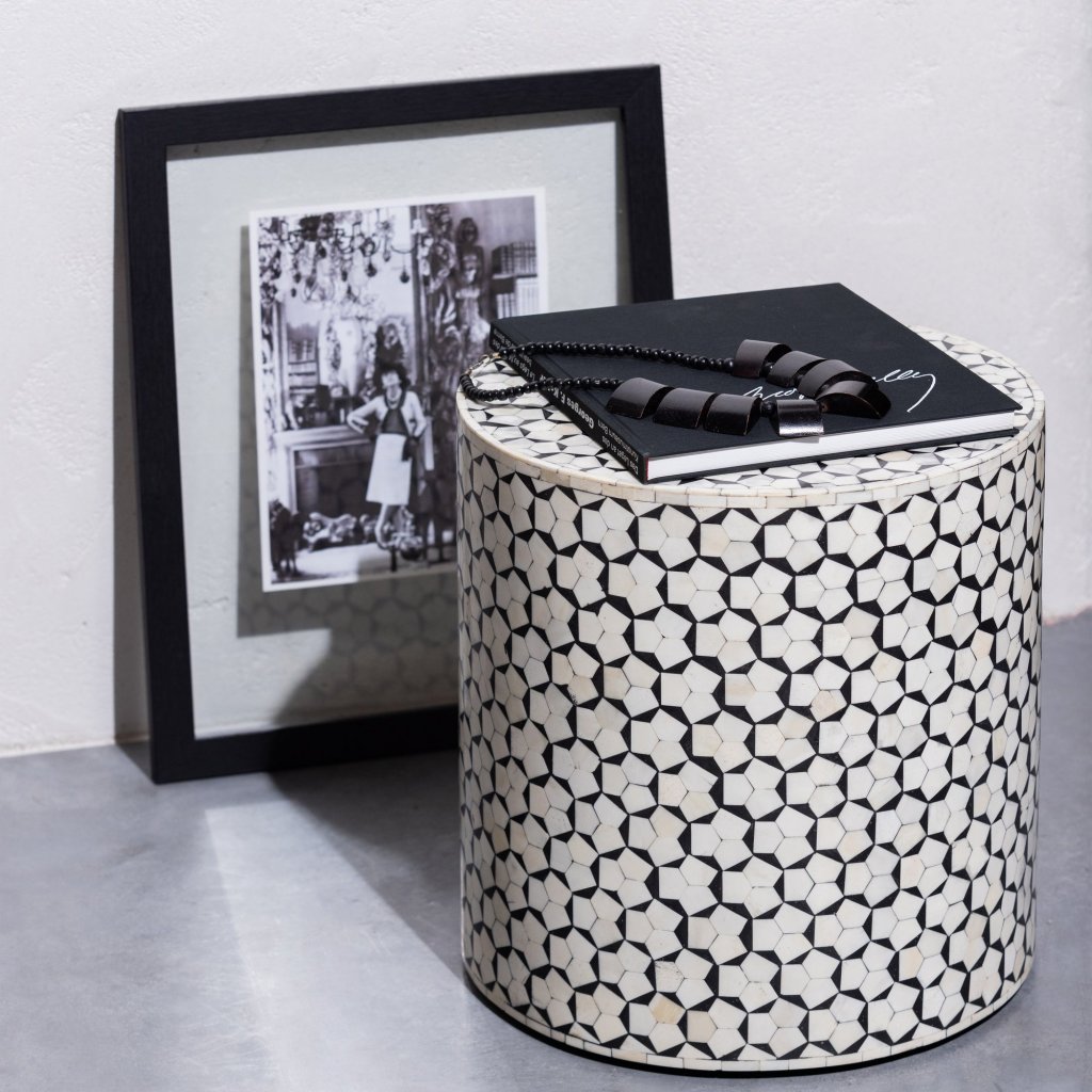 Kulatý odkládací stolek NEVA od holandského výrobce kvalitního nábytku WOOOD. Základna stolku je tvořena matným černým mangovým dřevem a mdf dřevovláknitou deskou. Vnějšek je zdoben kostěnou vložkou. Díky mdf desce je povrch stolku velmi hladký. Stolek má krásný černobílý design, který skvěle zapadne do moderních obývacích pokojů.