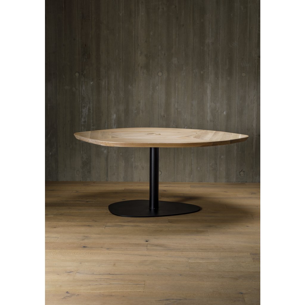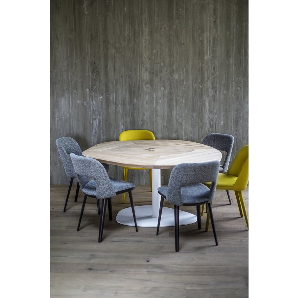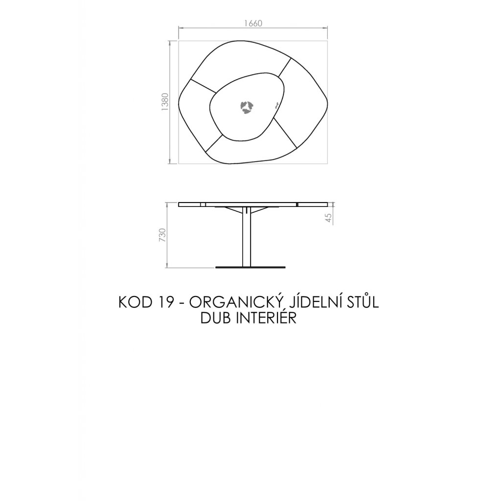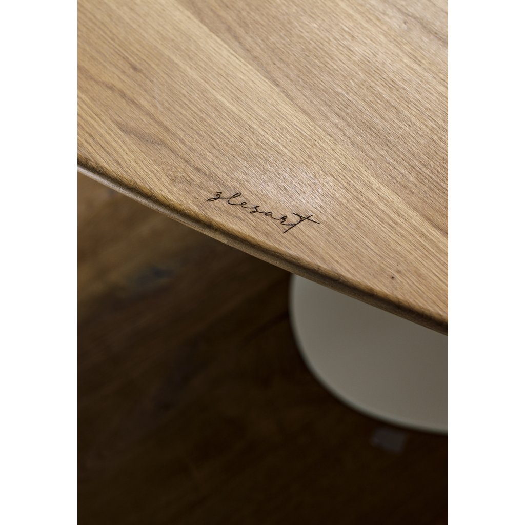 Unikátní organický jídelní stůl ZLESART od českého výrobce unikátních produktů ZLESART. Deska stolu má nepravidelný tvar a je složena z 5 kusů masivního dřeva dubu ve formě dvouvrstvé dubové spárovky. Její průměr tvoří zhruba 170 cm a pyšní se vypáleným logem a motivem 3 nádherných kapradin uprostřed stolu. Finálně je dřevo stolu napuštěno kvalitním olejem pro zajištění odolnosti vůči venkovním povětrnostním podmínkám. Samotná deska je pak položena na 1 centrální kovové noze v bílém, černém či jiném práškovaném laku. K dodání tedy v rozdílných barvách centrální nohy nebo jiného dřeva na jídelní desce.