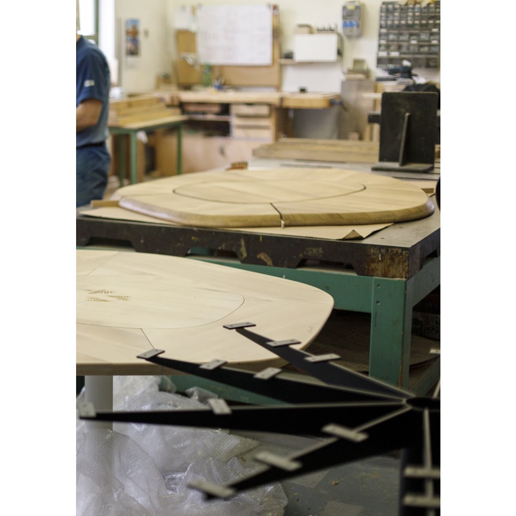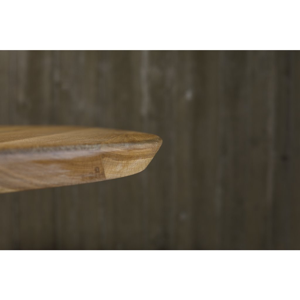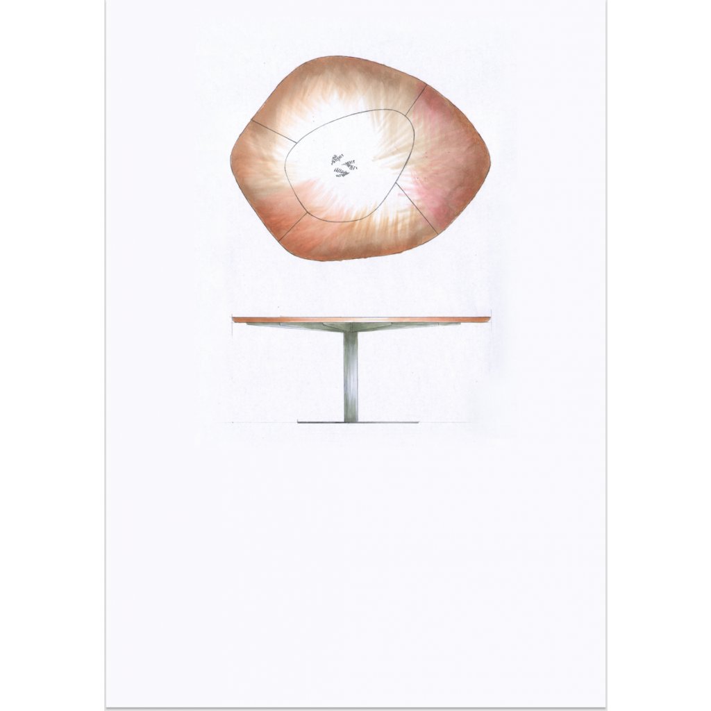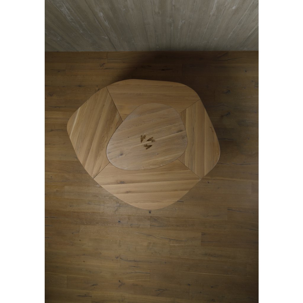 Unikátní organický jídelní stůl ZLESART od českého výrobce unikátních produktů ZLESART. Deska stolu má nepravidelný tvar a je složena z 5 kusů masivního dřeva dubu ve formě dvouvrstvé dubové spárovky. Její průměr tvoří zhruba 170 cm a pyšní se vypáleným logem a motivem 3 nádherných kapradin uprostřed stolu. Finálně je dřevo stolu napuštěno kvalitním olejem pro zajištění odolnosti vůči venkovním povětrnostním podmínkám. Samotná deska je pak položena na 1 centrální kovové noze v bílém, černém či jiném práškovaném laku. K dodání tedy v rozdílných barvách centrální nohy nebo jiného dřeva na jídelní desce.