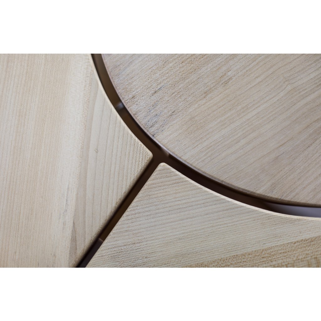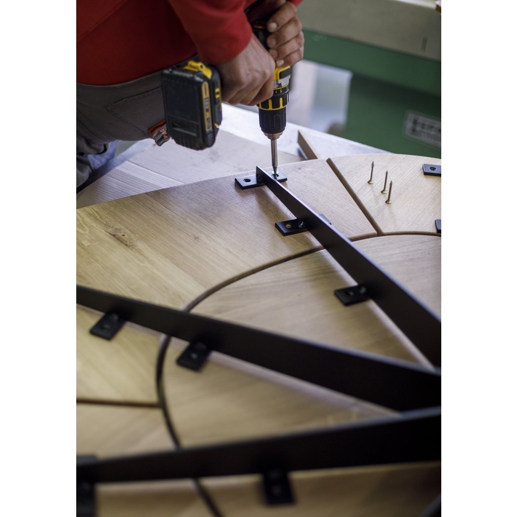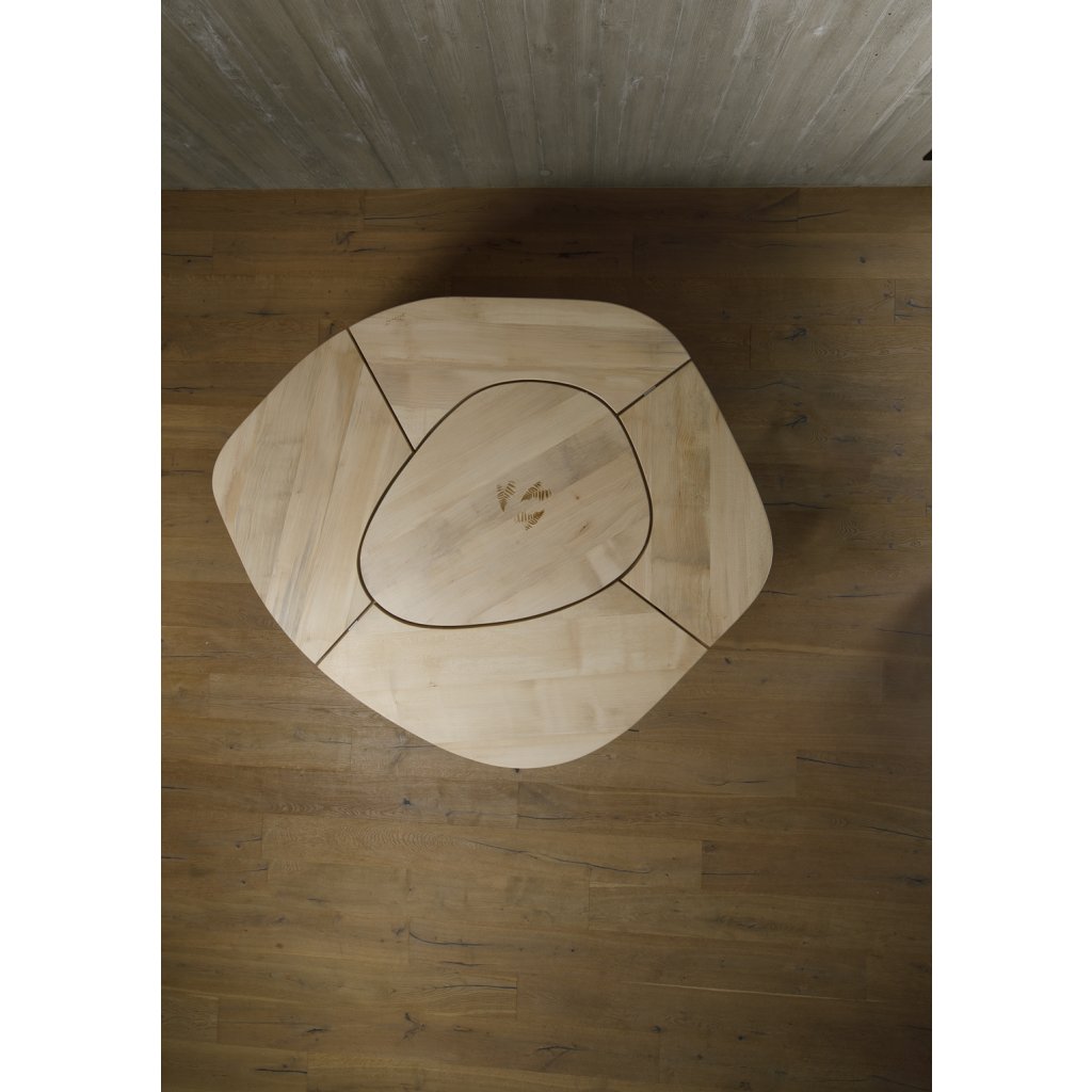 Unikátní organický jídelní stůl ZLESART od českého výrobce unikátních produktů ZLESART. Deska stolu má nepravidelný tvar a je složena z 5 kusů masivního dřeva javoru ve formě dvouvrstvé javorové spárovky. Její průměr tvoří zhruba 170 cm a pyšní se vypáleným logem a motivem 3 nádherných kapradin uprostřed stolu. Finálně je dřevo stolu napuštěno kvalitním olejem pro zajištění maximální odolnosti dřevěné desky. Ta je pak položena na 1 centrální kovové noze v bílém, černém či jiném práškovaném laku. K dodání tedy v rozdílných barvách centrální nohy nebo jiného dřeva na jídelní desce.