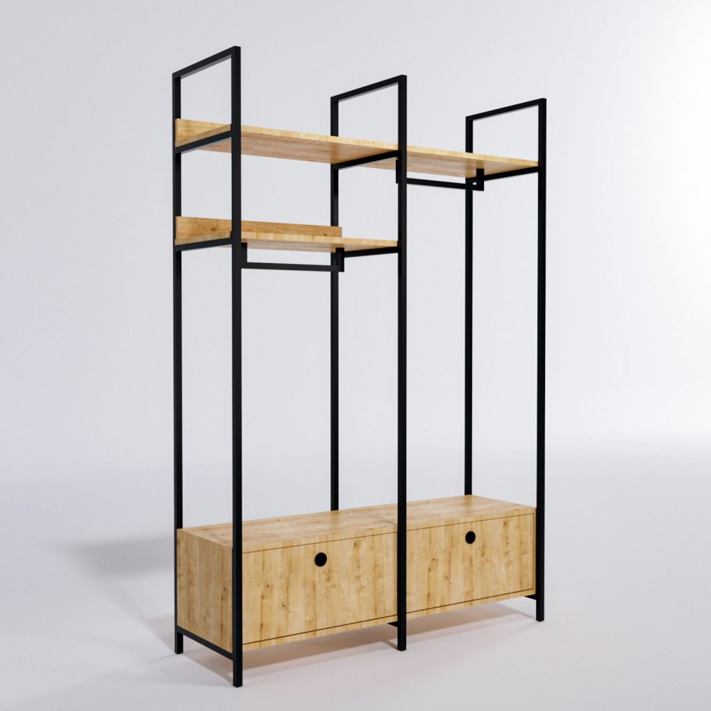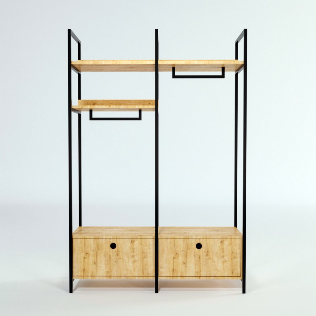 Otevřená šatní skříň PERM od výrobce designového nábytku KALUNE DESIGN. Tento stylový a krásný produkt kombinuje kovovou konstrukci v černé barvě a jednotlivé police a šuplíky z dřevotřísky s melaminovou fólií v krásném a stylovém odstínu světlého dřeva. Skříň má 1 dlouhou vrchní polici pro odložení věcí a jednu kratší polici. Pod nimi se nachází prostor pro pověšení košil, sak či kabátů. Spodní část pak nabízí 2 výsuvné šuplíky pro uložení poskládaných věcí či dalších potřeb.