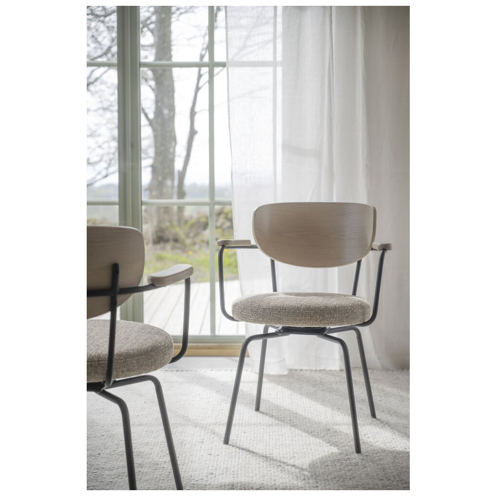 Designová jídelní židle s područkami MERRICK od švédského designového výrobce kvalitního dřevěného nábytku ROWICO. MERRICK je stylovým spojením industriální estetiky a komfortního provedení. Její štíhlý černý kovový rám vytváří elegantní siluetu, kterou doplňuje čalouněný sedák a dřevěné opěradlo. Díky automatickému otočnému mechanismu, který židli vrací zpět do výchozí pozice, si zachovává prostor vždy čistý a uspořádaný. Další praktickou vlastností je možnost stohování až tří židlí na sebe. Certifikace FSC potvrzuje šetrný přístup k přírodním zdrojům a odpovědnost ve výrobě.