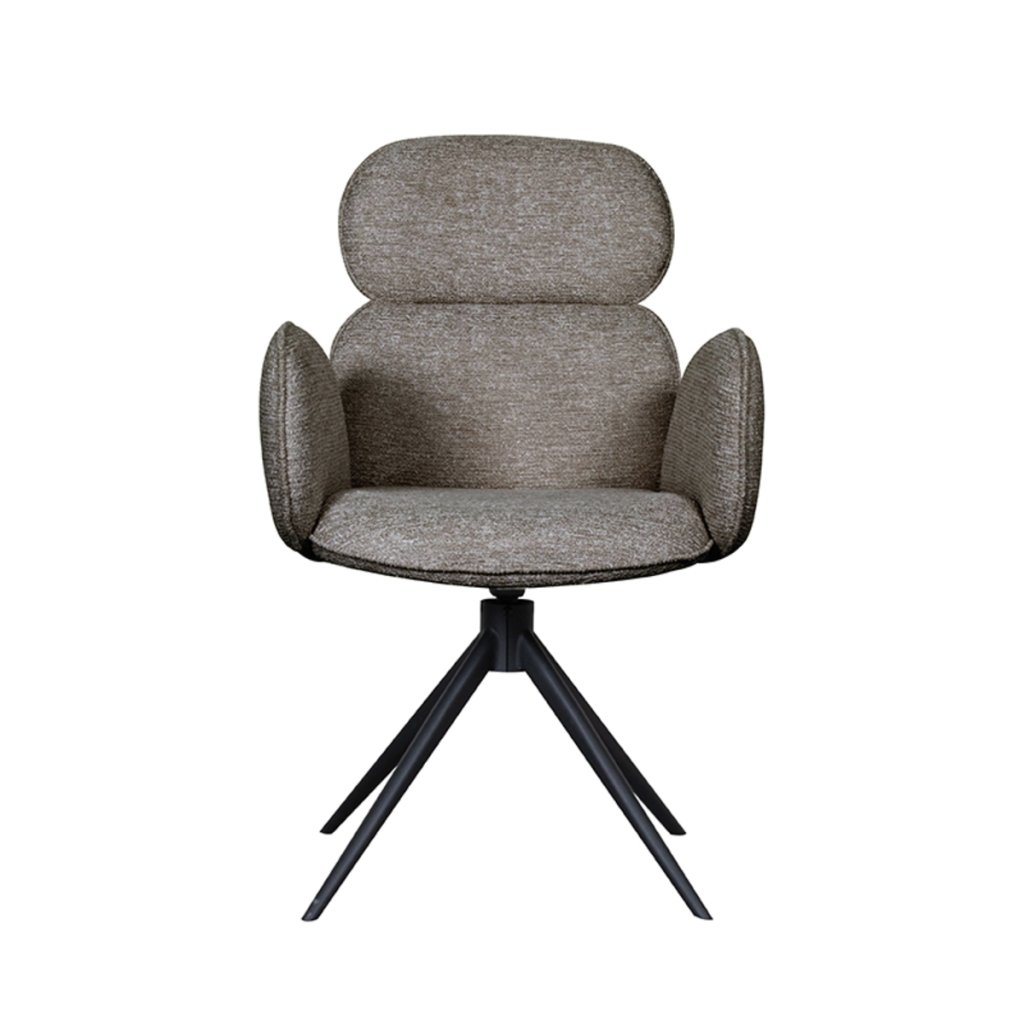 Designová otočná jídelní židle VIDAR od holandského výrobce industriálního nábytku LABEL51. Židle má konstrukci 4 kovových nohou propojených do sebe a spojených pod sedákem, což židli zaručuje maximální pevnost, stabilitu a odolnost. Na kovovou konstrukci je připevněn sedák. Sedák i opěrka jsou následně potaženy jemným buklé v hnědozelené barvě. Jednou z výhod židle je její otočná vlastnost. Díky tomu je velmi praktickým doplňkem do kuchyně, jídelny či pracovny. Automatický systém návratu také zajišťuje, že se křeslo vždy otočí zpět do výchozí polohy. Další výhodou jsou také područky, díky kterým získáte ještě větší pohodlí.