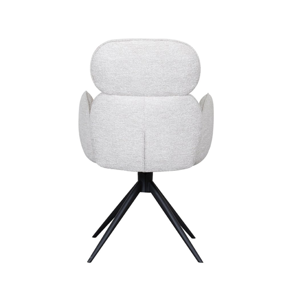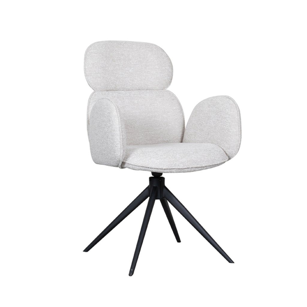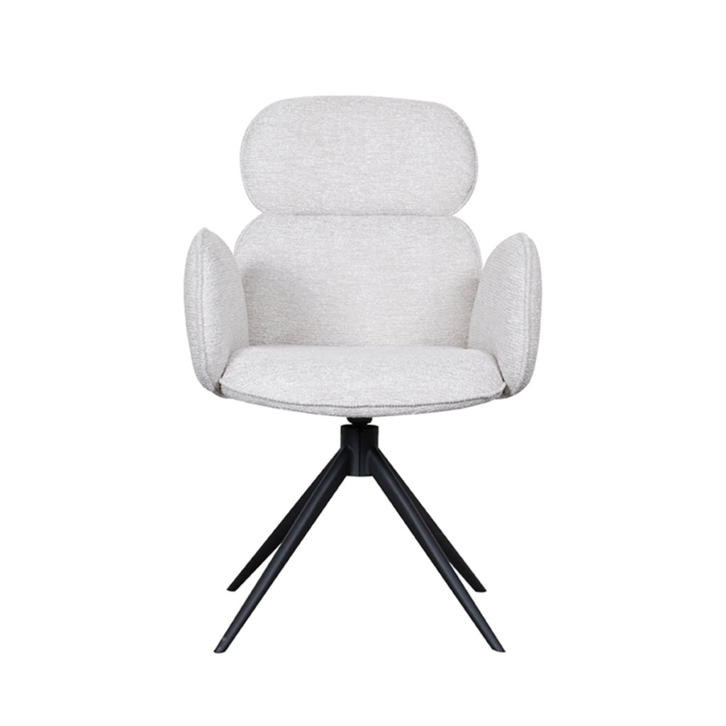 Designová otočná jídelní židle VIDAR od holandského výrobce industriálního nábytku LABEL51. Židle má konstrukci 4 kovových nohou propojených do sebe a spojených pod sedákem, což židli zaručuje maximální pevnost, stabilitu a odolnost. Na kovovou konstrukci je připevněn sedák. Sedák i opěrka jsou následně potaženy jemným buklé ve světlé barvě. Jednou z výhod židle je její otočná vlastnost. Díky tomu je velmi praktickým doplňkem do kuchyně, jídelny či pracovny. Automatický systém návratu také zajišťuje, že se křeslo vždy otočí zpět do výchozí polohy. Další výhodou jsou také područky, díky kterým získáte ještě větší pohodlí.