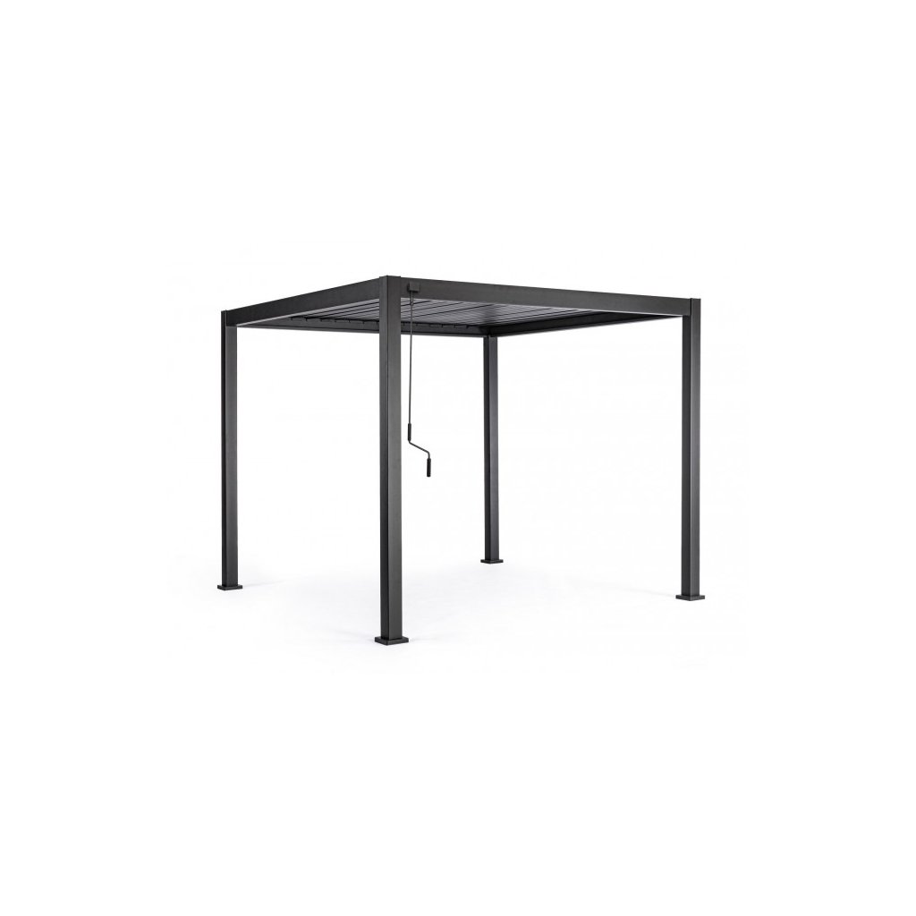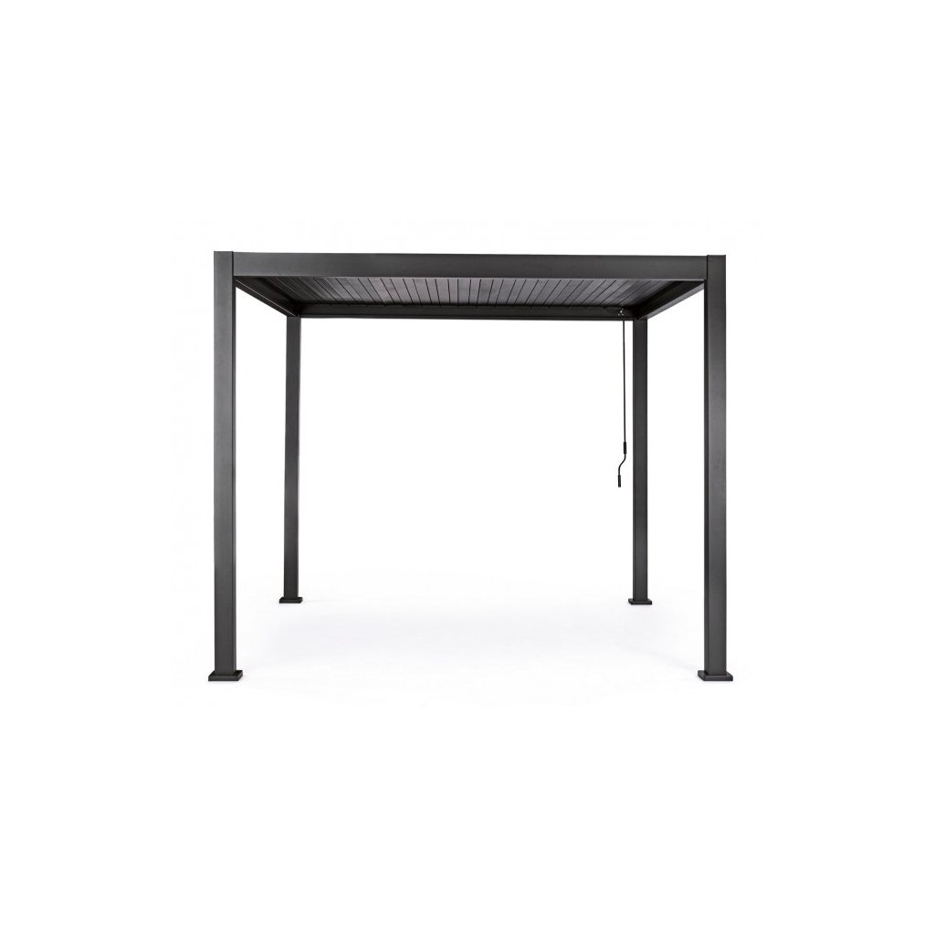 Stylová zahradní černá hliníková pergola OCEAN od italského výrobce stylového nábytku BIZZOTTO. Pergolu tvoří spodní 6 hliníkových nohou s rozměry 11x11cm, které sahají do výšky 250cm a je nutné je přivrtat k betonovému základu pro maximální stabilitu a odolnost. Na nohy navazuje samotná střecha, kterou tvoří kolmo umístěné hliníkové tyče s rozměry 14x7,5cm a vnitřní sklápěcí lamely, se kterými pohybujete manuálně za pomoci přiložené kličky. Díky nim si můžete vpustit denního světla dle vaší libosti a v případě deště zamezit tomu, aby vám pod ni pršelo. Je vybavena přilehlými kanálky podél střechy pro odvod dešťové vody. K dostání i ve větší velikosti nebo v bílé barvě.