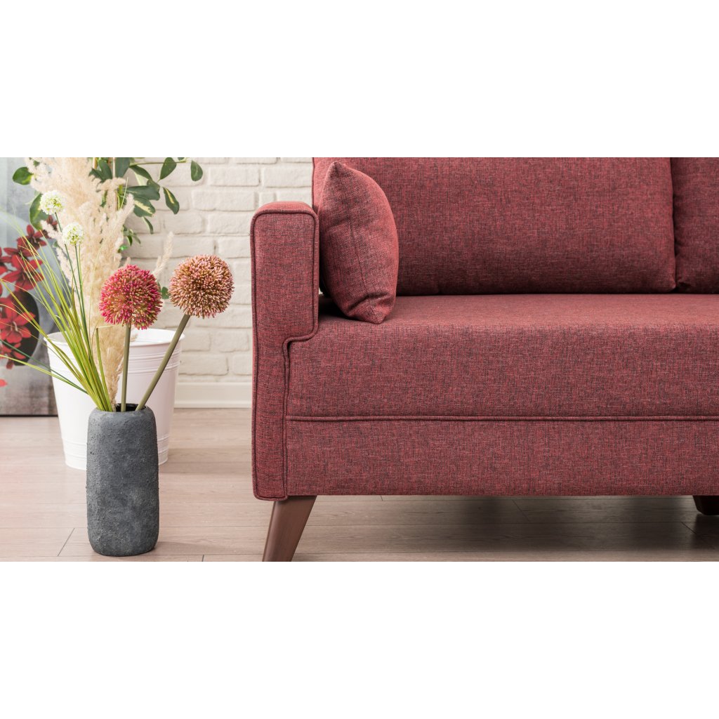 Designová pohovka BELLA od výrobce nábytku a pohovek Hanah Home. BELLA je opravdu krásná sedačka, která má 5 malých nohou, přecházejících do rámu sedačky z bukového dřeva. Rám je potažen kvalitními pěnami díky nimž je sezení velmi příjemné a komfortní. Vaše pohodlí vám zajistí krásný a odolný látkový potah z polyesterových vláken v bordó barvě. Na sedačku se pohodlně vejdou minimálně 3 osoby. Pohovka je opatřena 2 velkými polštáři za zády a 2 menšími polštářky na bocích.
