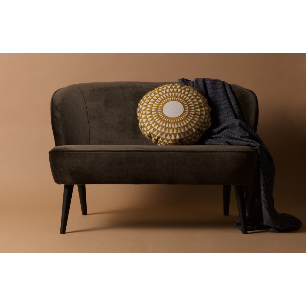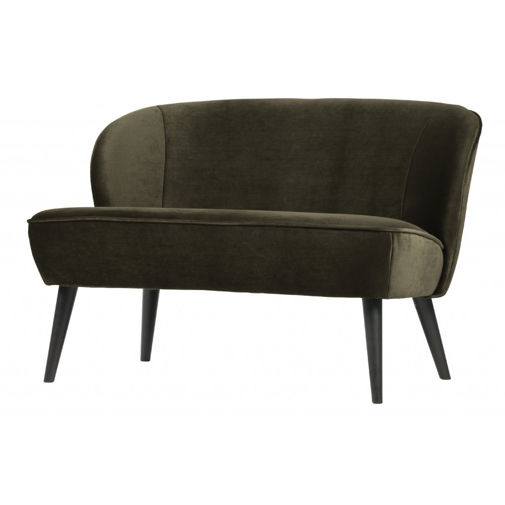 Stylová malá pohovka SARA od holandského výrobce kvalitního nábytku WOOOD. Skládá se z dřevěných nohou v černě lakované barvě a sedáku s krásnou polyesterovou sametovou tkaninou, na které bude radost sedět. Pohovka je pohodlná a příjemná na dotyk.