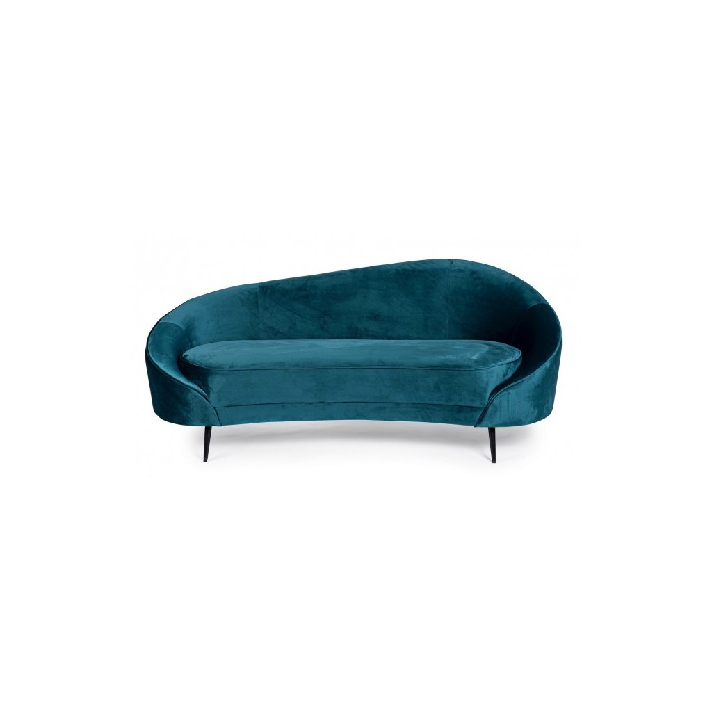 Krásná pohovka SERAPHIN od italského výrobce kvalitního nábytku BIZZOTTO s konstrukcí z překližky a borovicového dřeva doplněné o kovové nohy. Tyrkysový sametový potah je překryt přes pevnou polyuretanovou pěnu. Krásně nerovnou linií vrchní opěrku doplňují dva klesající zakulacené opěrky po stranách. Velmi krásná a stylová pohovka.