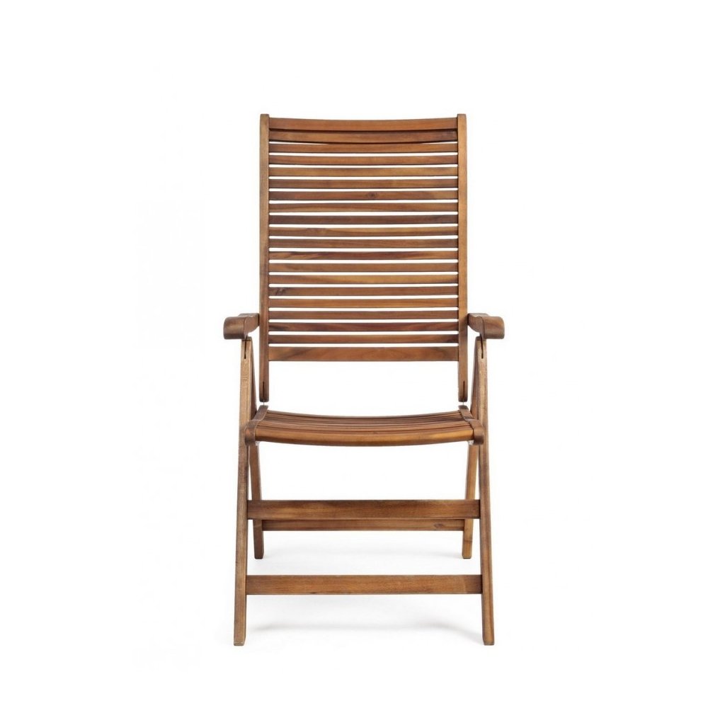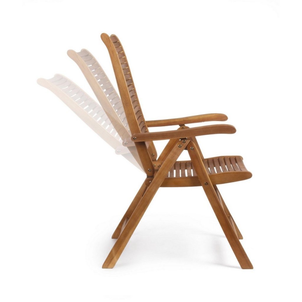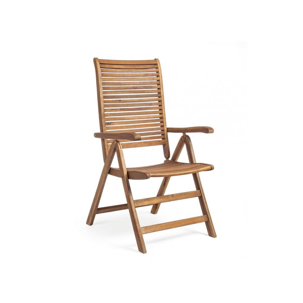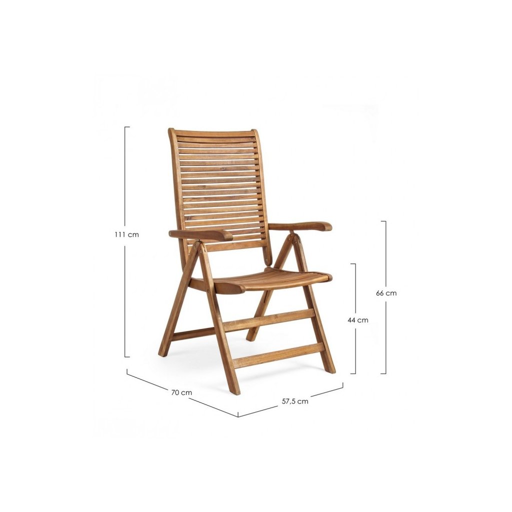 Designové dřevěné venkovní křeslo NOEMI od italských kolegů z firmy BIZZOTTO. Křeslo je kompletně vyrobeno z akáciového dřeva. Materiál je velmi odolným vůči nepřiznivým vlivům vnějšího počasí díky své olejové úpravě. Křeslo tvoří 4 propojené nohy nohy. Přední nohy zajímavě přechází v opěradlo židle a jsou zároveň oporou o područky. Křeslo NOEMI je nastavitelné do pěti poloh, respektive její opěradlo.