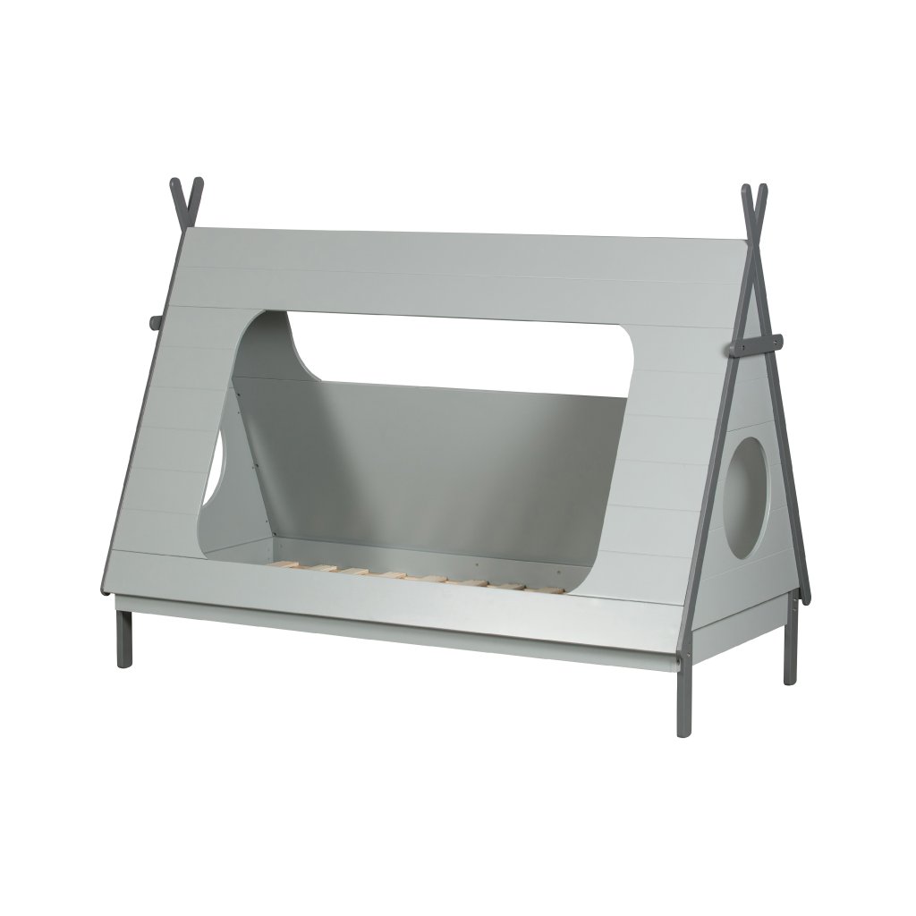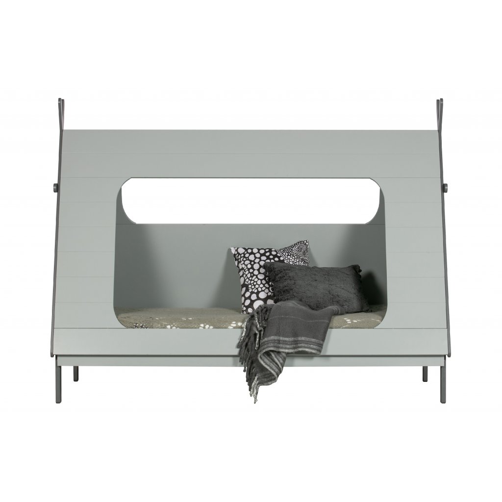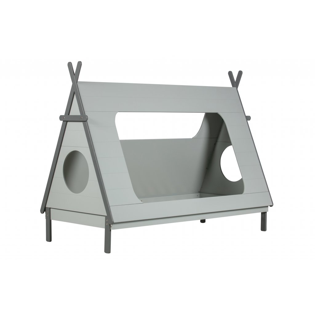 Stylová postel TIPI od holandského výrobce kvalitního nábytku WOOOD. TIPI má rám ze šedě lakovaného masivního dřeva borovice a šedých dřevovláknitých mdf desek. Na samotnou postel navazuje vrchní deska tvořící stan, která je z šedě lakované borovicové dýhy. Postel TIPI má 4 otvory, 2 kulaté ve předu a vzádu, jeden velký, kudy dítě může ven a dovnitř a jeden menší na protější straně. Krásná a designová postel, která nezklame žádného spáče a díky materiálu vydrží spoustu prosněných nocí. Matrace není součástí objednávky, nutno dokoupit. Lamelový rošt však ano. Produkt je vyroben z masivního dřeva a může obsahovat suky či jiné nedokonalosti přírodního dřeva, které není vadou výrobku.