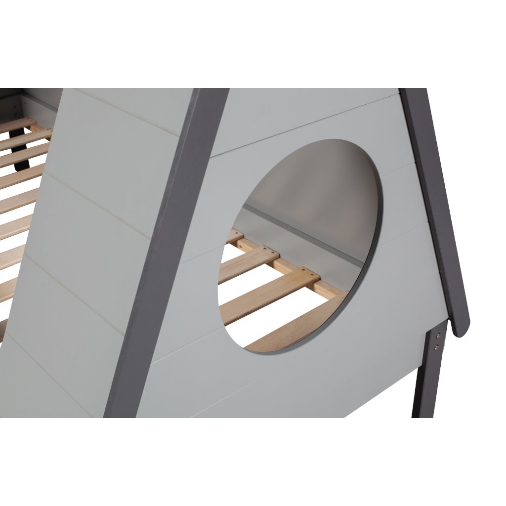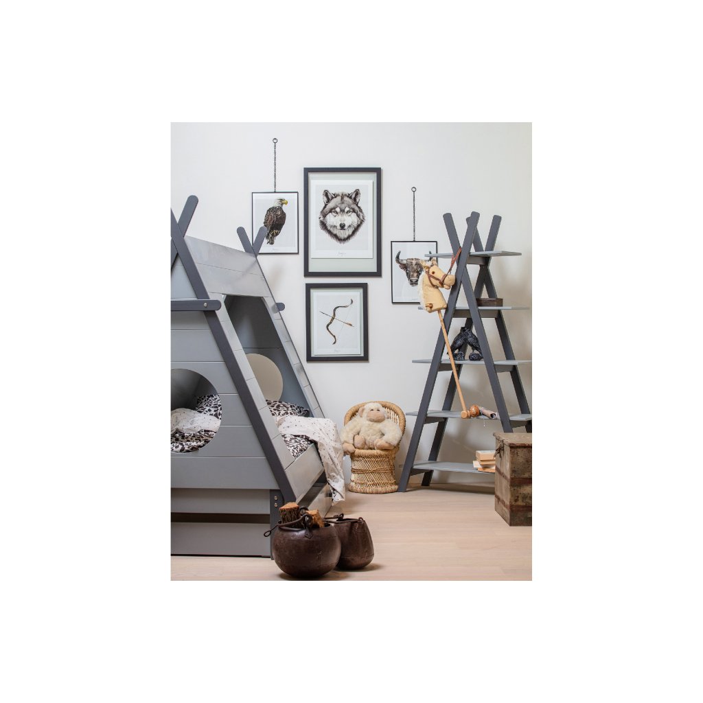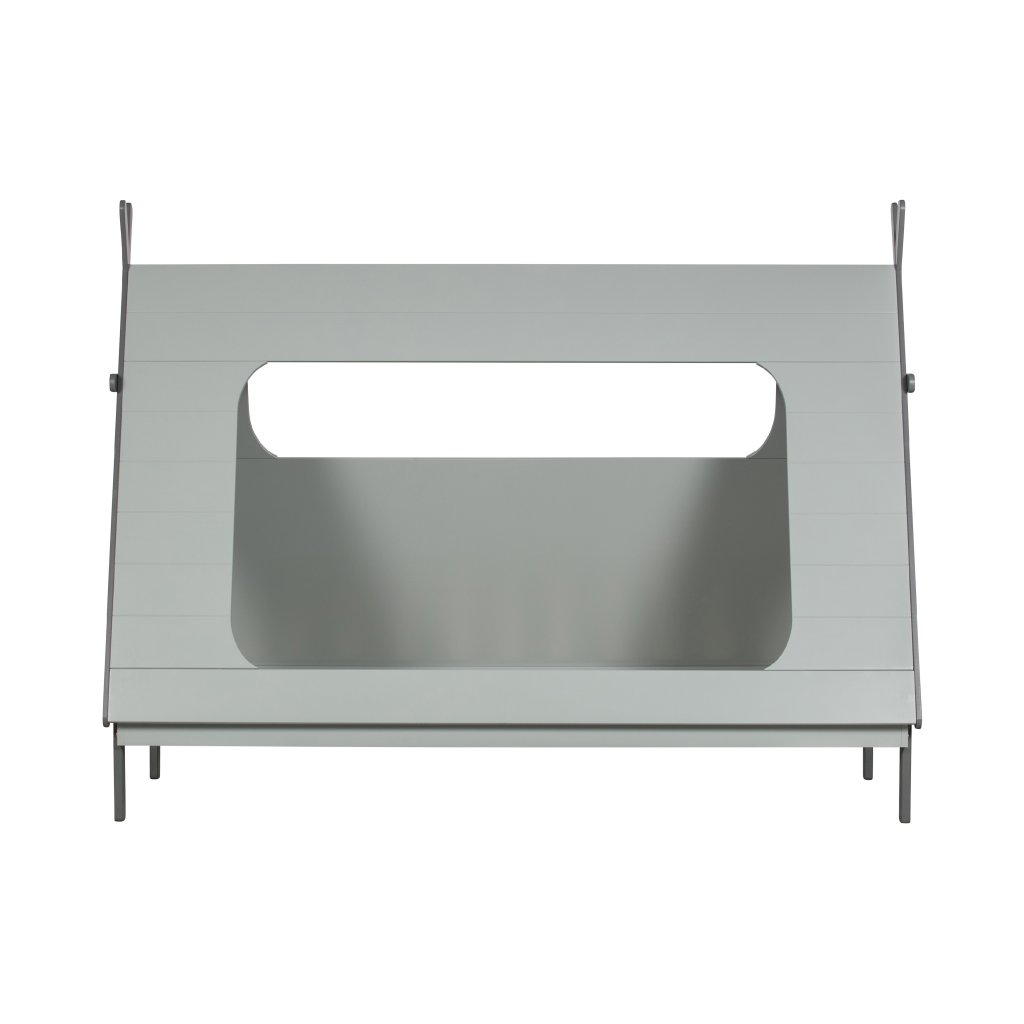 Stylová postel TIPI od holandského výrobce kvalitního nábytku WOOOD. TIPI má rám ze šedě lakovaného masivního dřeva borovice a šedých dřevovláknitých mdf desek. Na samotnou postel navazuje vrchní deska tvořící stan, která je z šedě lakované borovicové dýhy. Postel TIPI má 4 otvory, 2 kulaté ve předu a vzádu, jeden velký, kudy dítě může ven a dovnitř a jeden menší na protější straně. Krásná a designová postel, která nezklame žádného spáče a díky materiálu vydrží spoustu prosněných nocí. Matrace není součástí objednávky, nutno dokoupit. Lamelový rošt však ano. Produkt je vyroben z masivního dřeva a může obsahovat suky či jiné nedokonalosti přírodního dřeva, které není vadou výrobku.