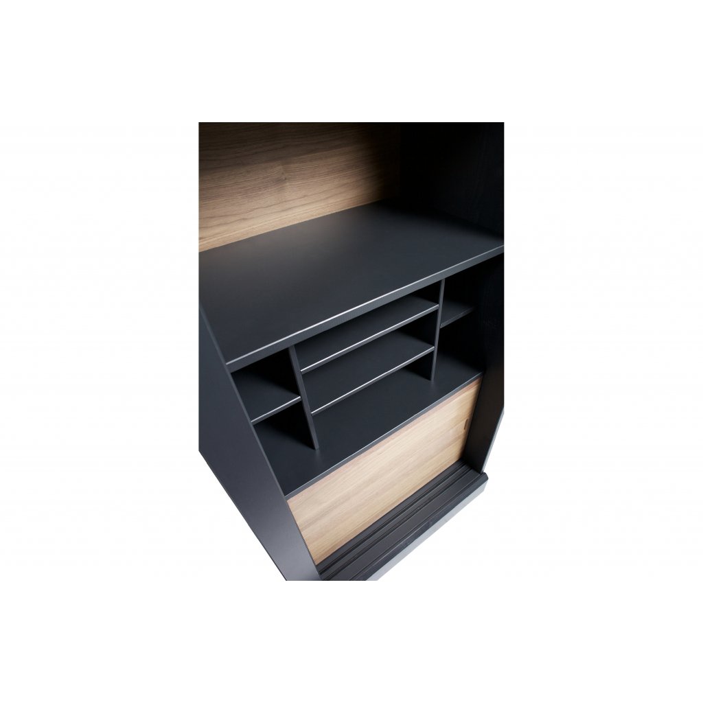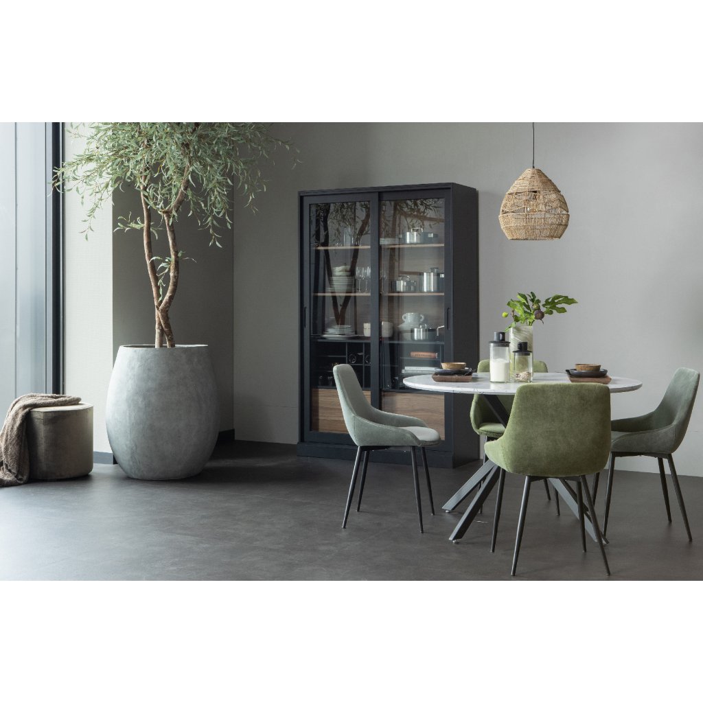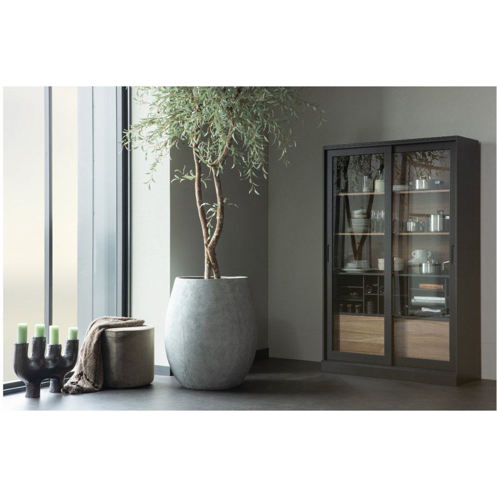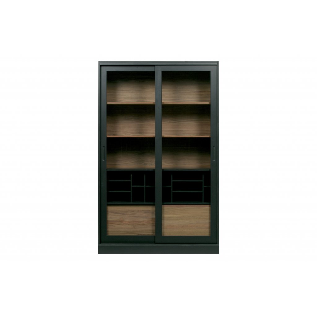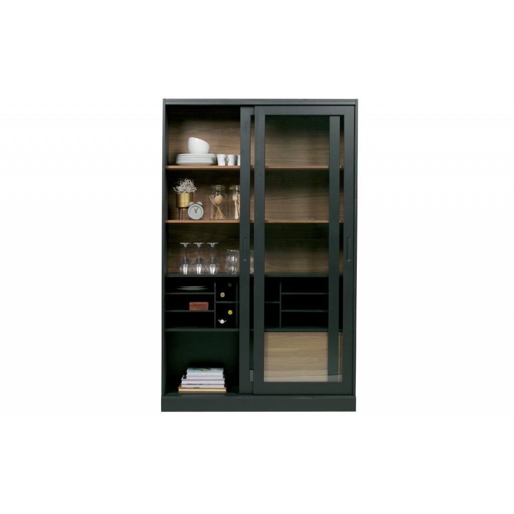 Krásná a stylová vitrínka JAMES od holandského výrobce kvalitního nábytku WOOOD. JAMES má konstrukci a venkovní desky vyrobeny z černě lakovaného masivního dřeva borovice, které se pyšní certifikátem FSC, což značí ekologicky získané a k přírodě šetrné dřevo. Přední část tvoří 2 posuvné dveře s černým rámem a 4mm tlustým sklem. Uvnitř na vás čekají 3 police a spodní posuvné dveře z dřevotřísky s dekorem kaštanu. Uprostřed jsou menší přihrádky třeba na víno a to v černé barvě. Spojení hnědé a černé působí velmi elegantně a krásně.