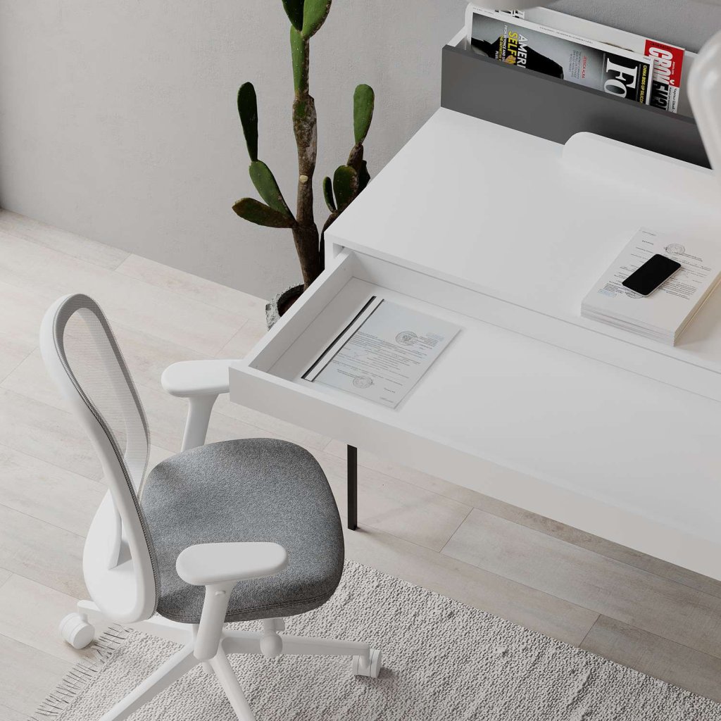 Nádherný psací stůl LEILA od výrobce designového nábytku KALUNE DESIGN. Stůl tvoří robustní konstrukce z černě lakovaného kovu, což dělá ze stolu maximálně stabilní a pevný výrobek. Vrchní psací část je dodávána v bílém provedení s psací deskou, 1 výsuvnou zásuvkou a 2 nádherně odskočenými odkládacími poličkami pro dokumenty a tiskoviny v bílé a šedé barvě. Velmi nádherný a unikátní psací stůl.