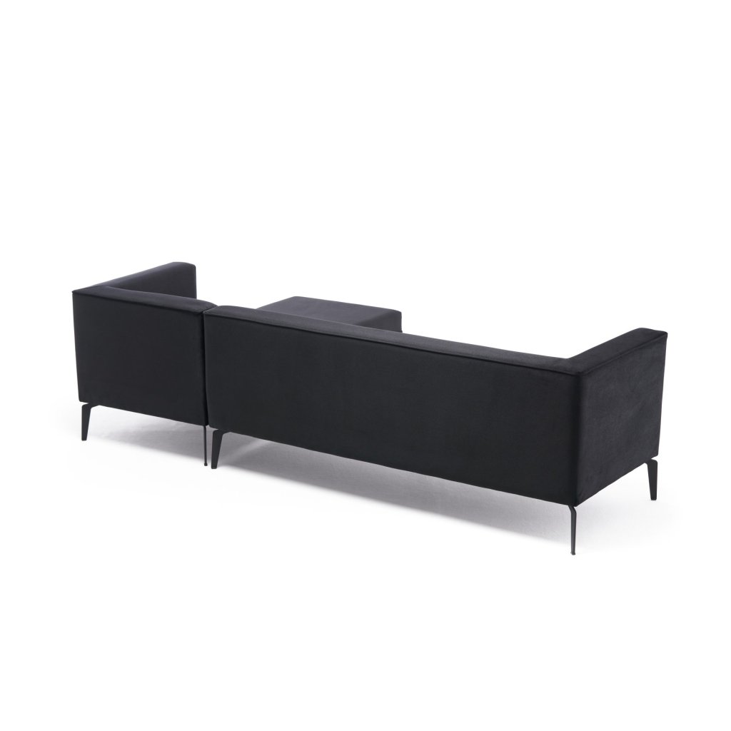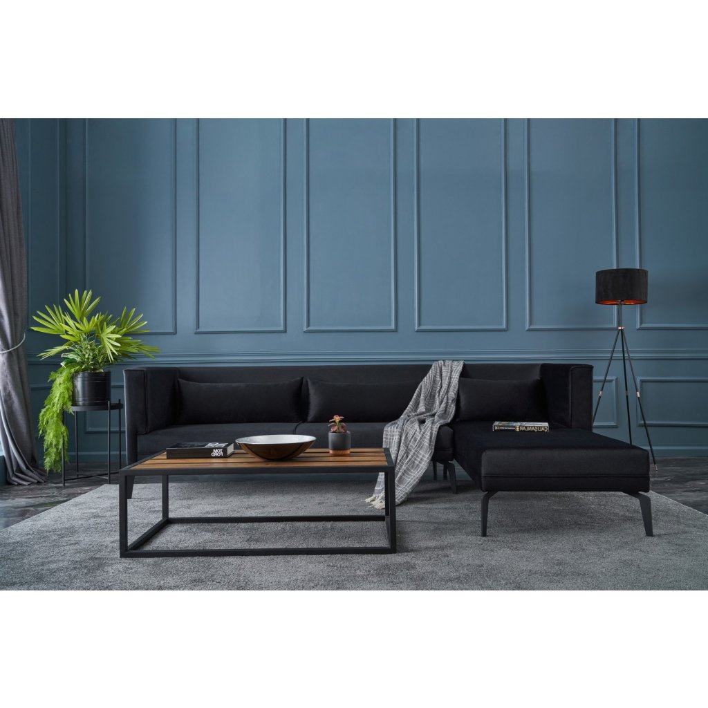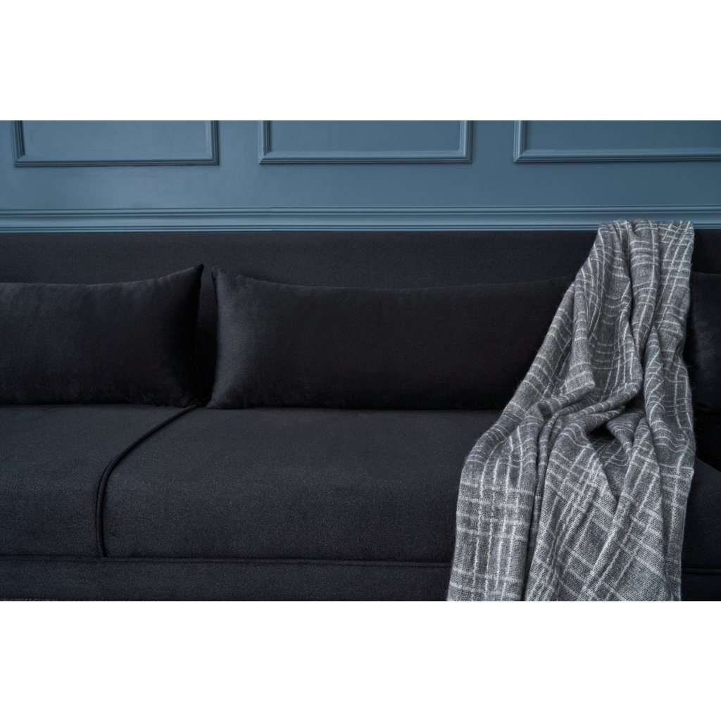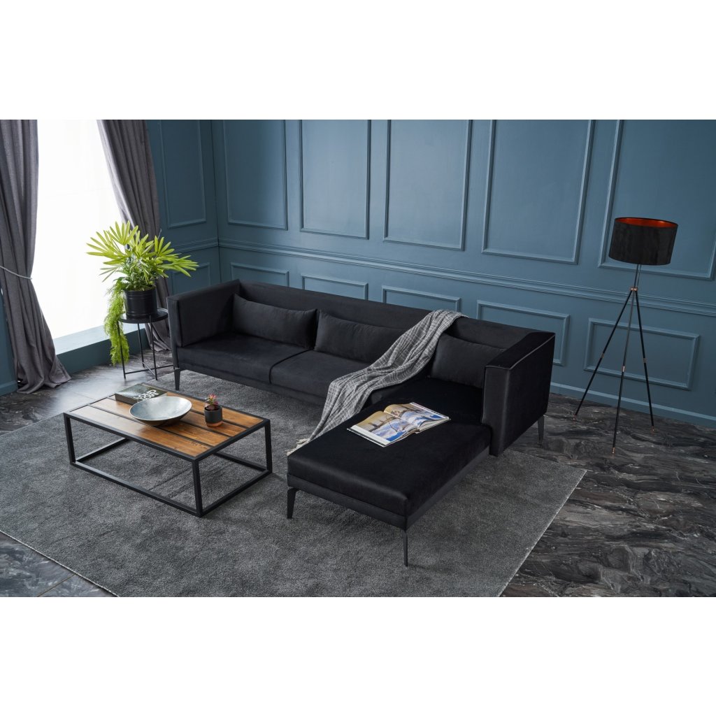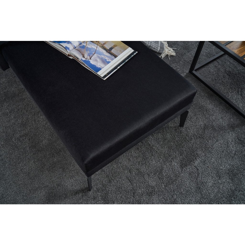 Krásná rohová pohovka ARDOSA od výrobce nábytku a pohovek HANAH HOME. Pohovka ARDOSA má konstrukci v kombinaci dřeva a desek, na níž je připevněna pěna a následně sametový potah v černé barvě. Pohovka má lenošku s rozměry 176x72cm na pravé straně pro váš maximální komfort. Díky délce 244cm se na pohovku vejdou minimálně 3 lidé. Pohovka je pak opatřena 3 podlouhlými polštářky ve stejné barvě.