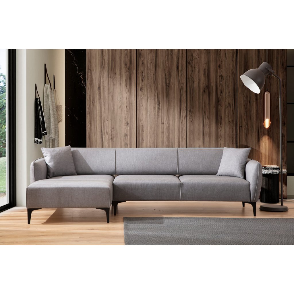 Rozkládací rohová BELISSIMO od výrobce nábytku a pohovek Hanah Home. BELISSIMO má konstrukci z bukového dřeva potaženou polyuretanovou pěnou a krásným potahem ve světle barvě. Pohovka BELISSIMO je se svou délkou 270 cm dostatečně prostorná pro pohodlné sezení 3 až 4 osob. Moderní vzhled, krásné provedení a elegantní černé nohy společně dodávají pohovce BELISSIMO vše, co od pohovky očekáváte. Díky sklapovací zadní opěrce, lze využít jako postel pro přespání vaší návštěvy.