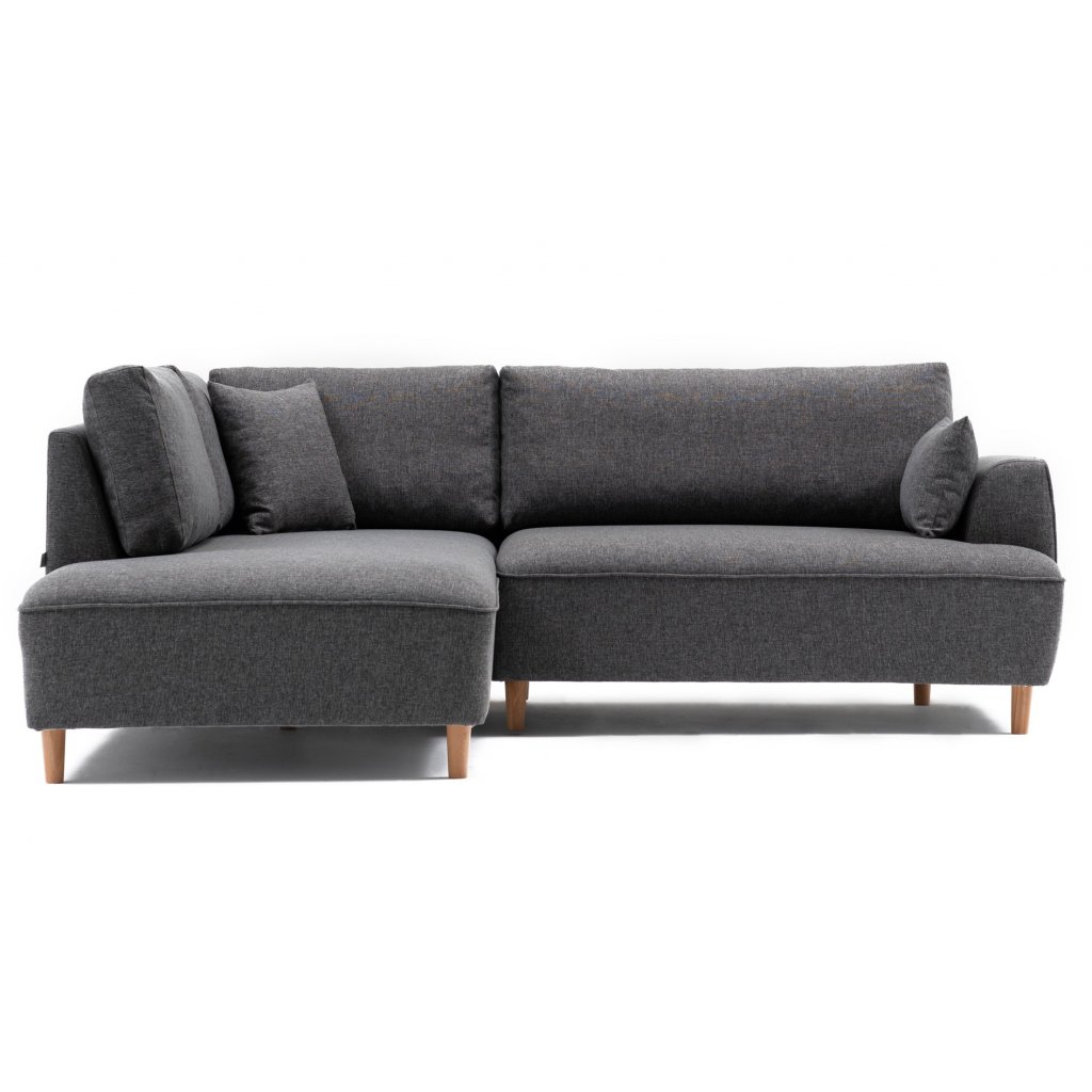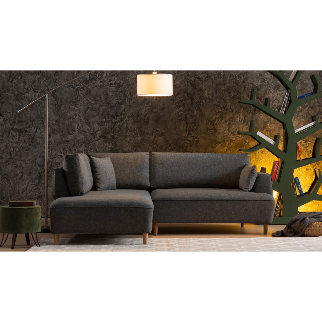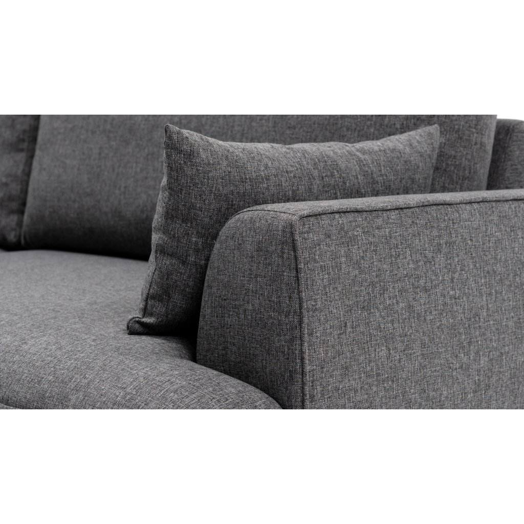 Designová pohovka FELIX od výrobce nábytku a pohovek Hanah Home. Krásná elegantní sedačka má 9 malých nohou, které přechází do rámu sedačky z bukového dřeva. Rám je potažen kvalitními pěnami díky nimž je sezení velmi příjemné a komfortní. Celé zakončuje krásný a odolný látkových potah z polyesterových vláken v tmavě šedé barvě. Lenoška se nachází v levé části, nicméně dostupná je pohovka FELIX i v pravém provedení. Na sedačku se pohodlně vejdou minimálně 3 osoby. Pohovka je opatřena 4 velkými a 2 malými polštáři.