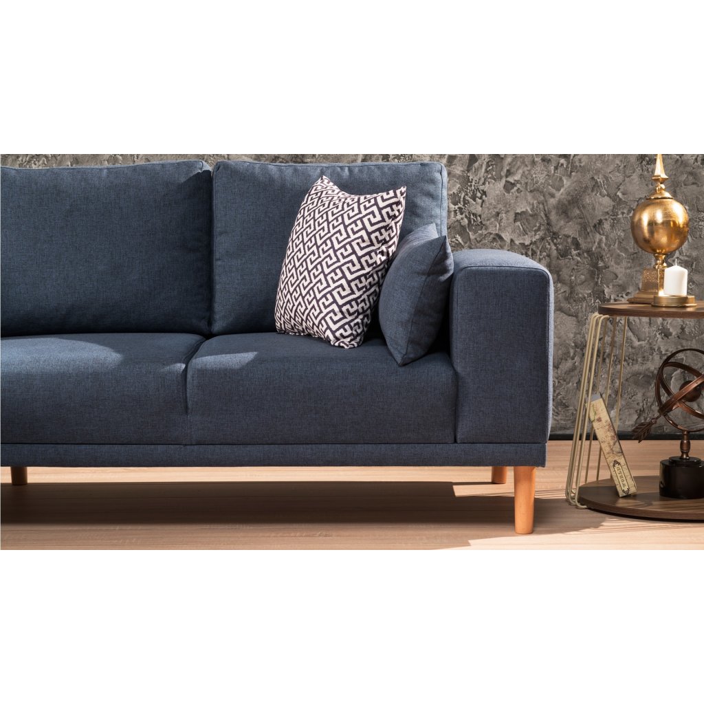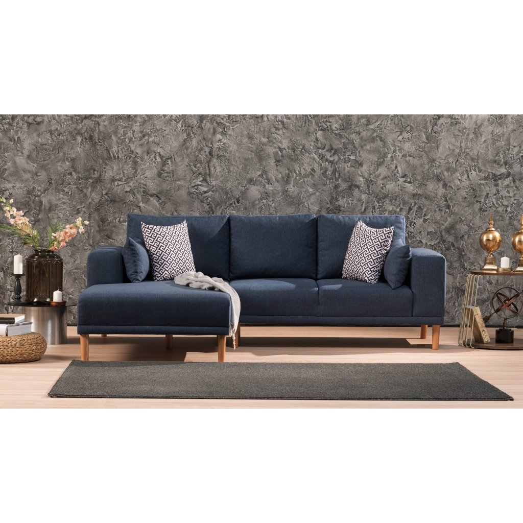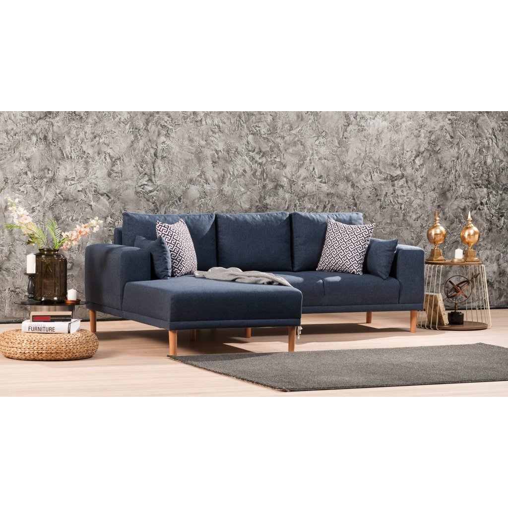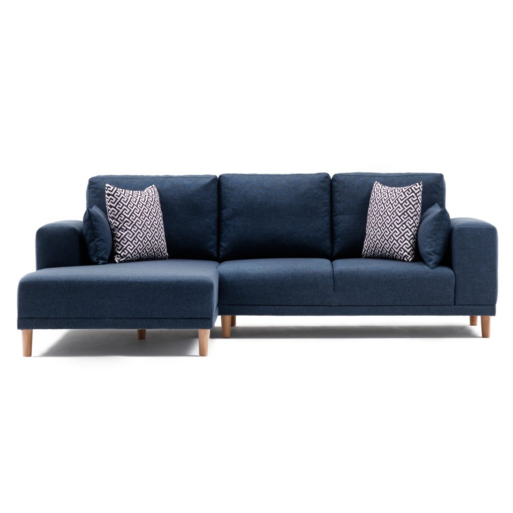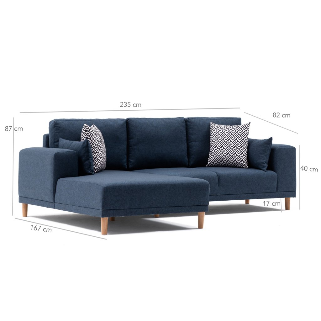 Designová rohová pohovka s lenoškou FRANZ od výrobce nábytku a pohovek Hanah Home. Pohovka je dodávána s bukovými dřevěnými nohami, polyuretanovou výplní a povlakem ze 100% polyesteru v tmavě modré barvě. Lenoška o délce 167cm je umístěna na levé straně pohovky. Rohová pohovka FRANZ je k dostání i v dalších barevných variantách. Na sedačku se pohodlně vejde celá vaše rodina. Obsahuje dva malé polštářky ve stejné barvě a dva větší polštářky se vzorem.
