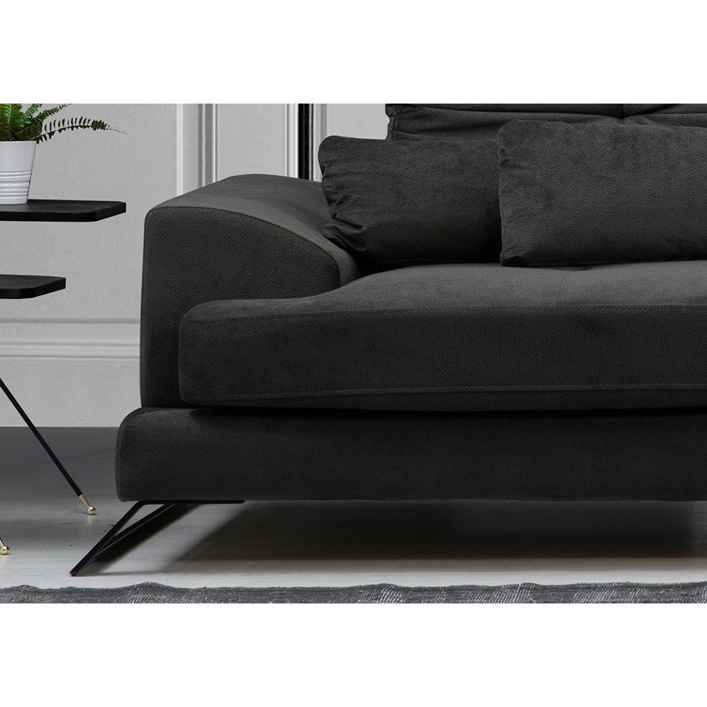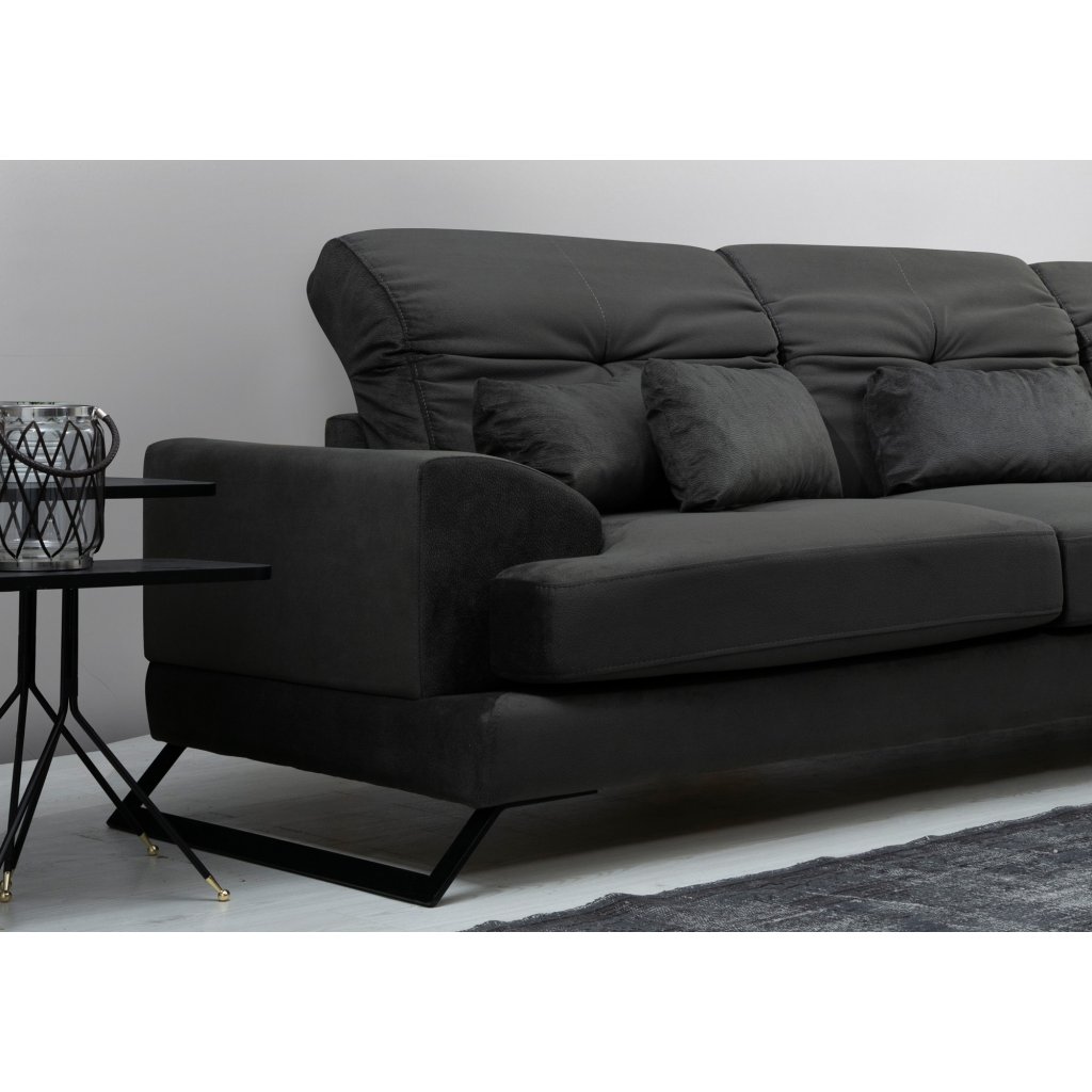 Designová rohová pohovka FRIDO od výrobce nábytku a pohovek Hanah Home. FRIDO má konstrukci z bukového dřeva potaženou polyuretanovou pěnou a krásným černým potahem z polyesteru s decentním prošíváním. Stabilitu, nosnost a pevnost zajišťují designové kovové nohy v matně černém provedení. Jedná se o prostornou rohovou pohovku, která má celkovou délku 308 cm a díky pravé lenošce se na ni vejde celá vaše rodina. Součástí balení je i 5 polštářků, se kterými lze libovolně manipulovat. Dva s rozměry 50 cm x 50 cm a tři s rozměry 65 cm x 30 cm. V dostání i v pravé variantě a jiných barvách.
