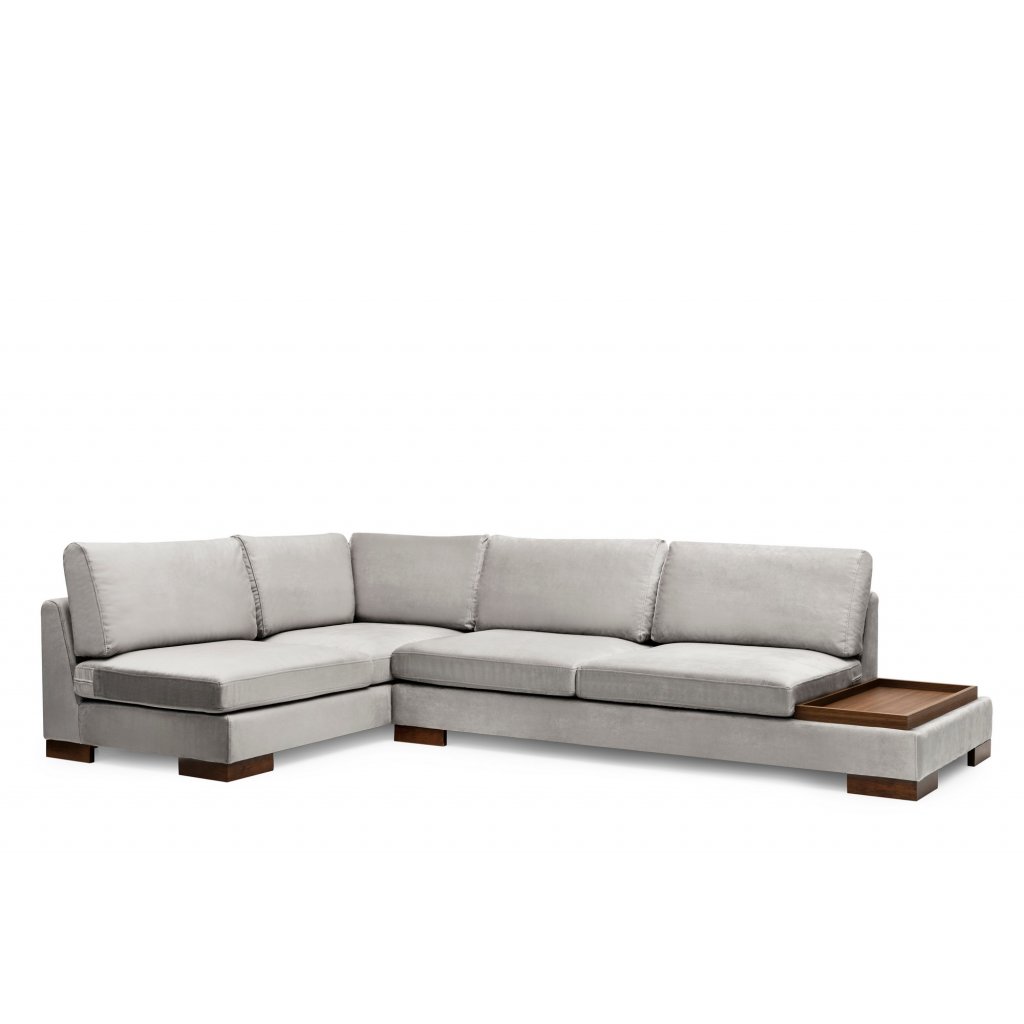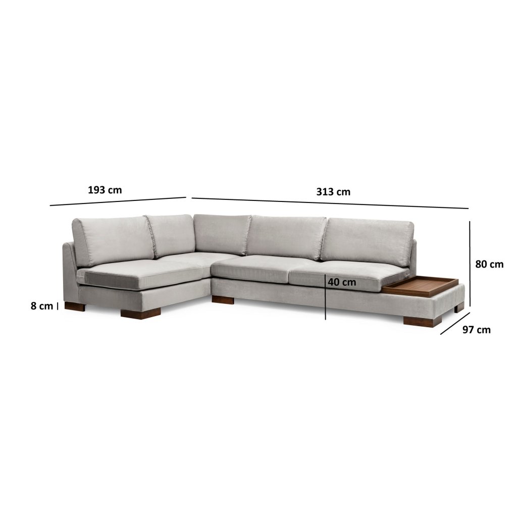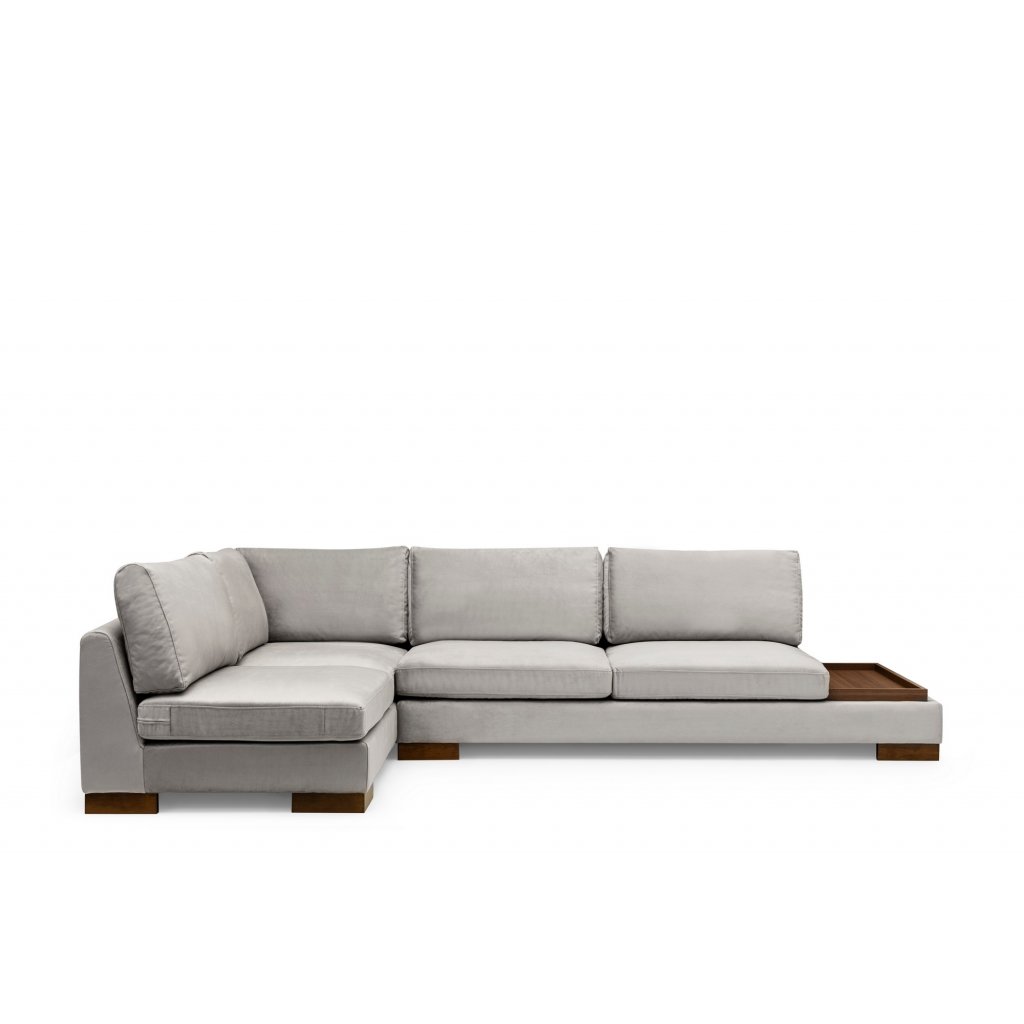 Nádherná rohová pohovka TULIP od výrobce nábytku a pohovek Hanah Home. Pohovka TULIP je dodávána s dřevěnými nohami v hnědé barvě, polyuretanovou výplní a povlakem ze 100% polyesteru ve světle šedé barvě. Lenoška o délce 193cm je umístěna na levé straně pohovky. V pravé části se nachází velice praktická odkládací deska. Součástí pohovky je také krásný kvalitní puf ve stejném provedení. Rohová pohovka TULIP je k dostání i v dalších barevných variantách a pravém provedení.