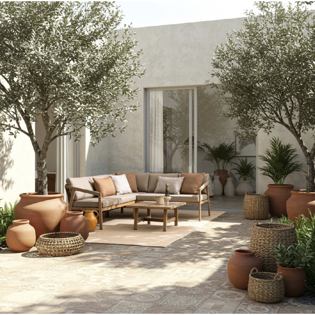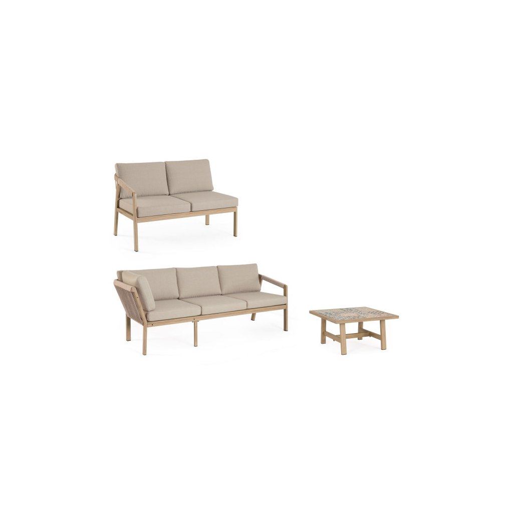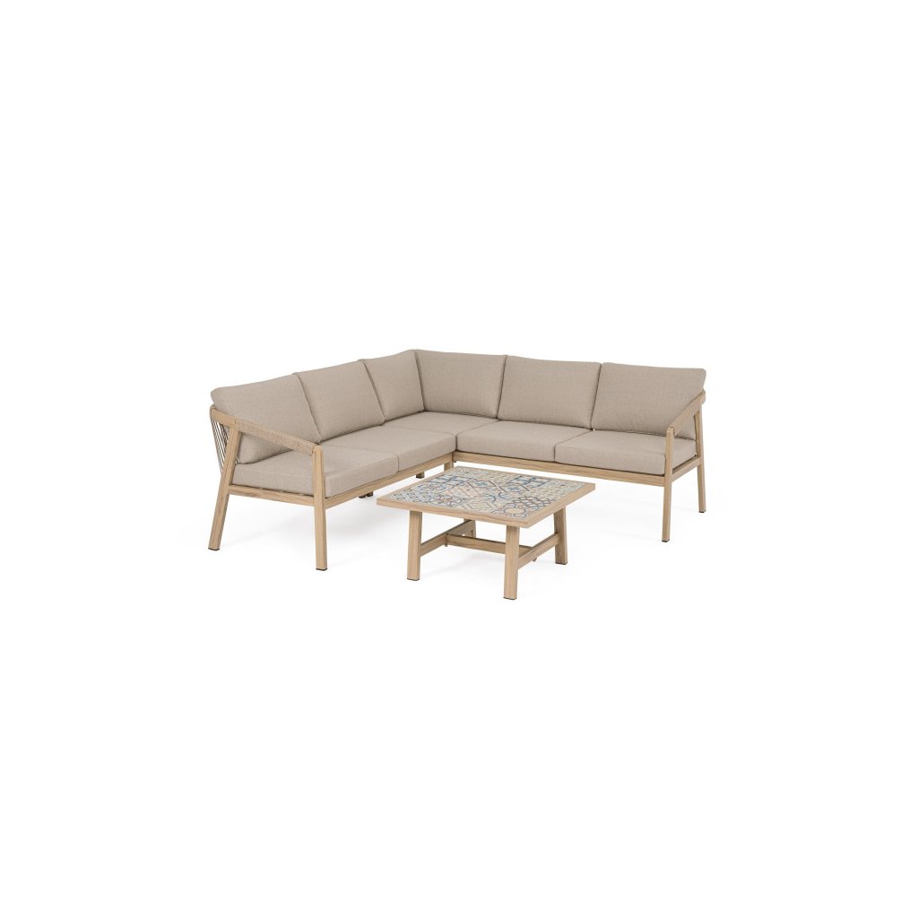 Designový zahradní set KALIMERA od italského výrobce stylového nábytku BIZZOTTO. Zahradní sestavu tvoří rohová pohovka a konferenční stolek. Celá sestava je vyrobena především z lehkého hliníku s jemným efektem dřeva v teplé hnědé barvě. Pohovka má pak sedací a opěrné polštářky ze šedého olefinu, který je odolný UV záření a vodě. Příjemné vám budou i boční područky u obou. Díky materiálu hliníku jsou odolné a lehké na manipulaci. Konferenční stolek má stylové španělské keramické kachličky a dodává jedinečnost.