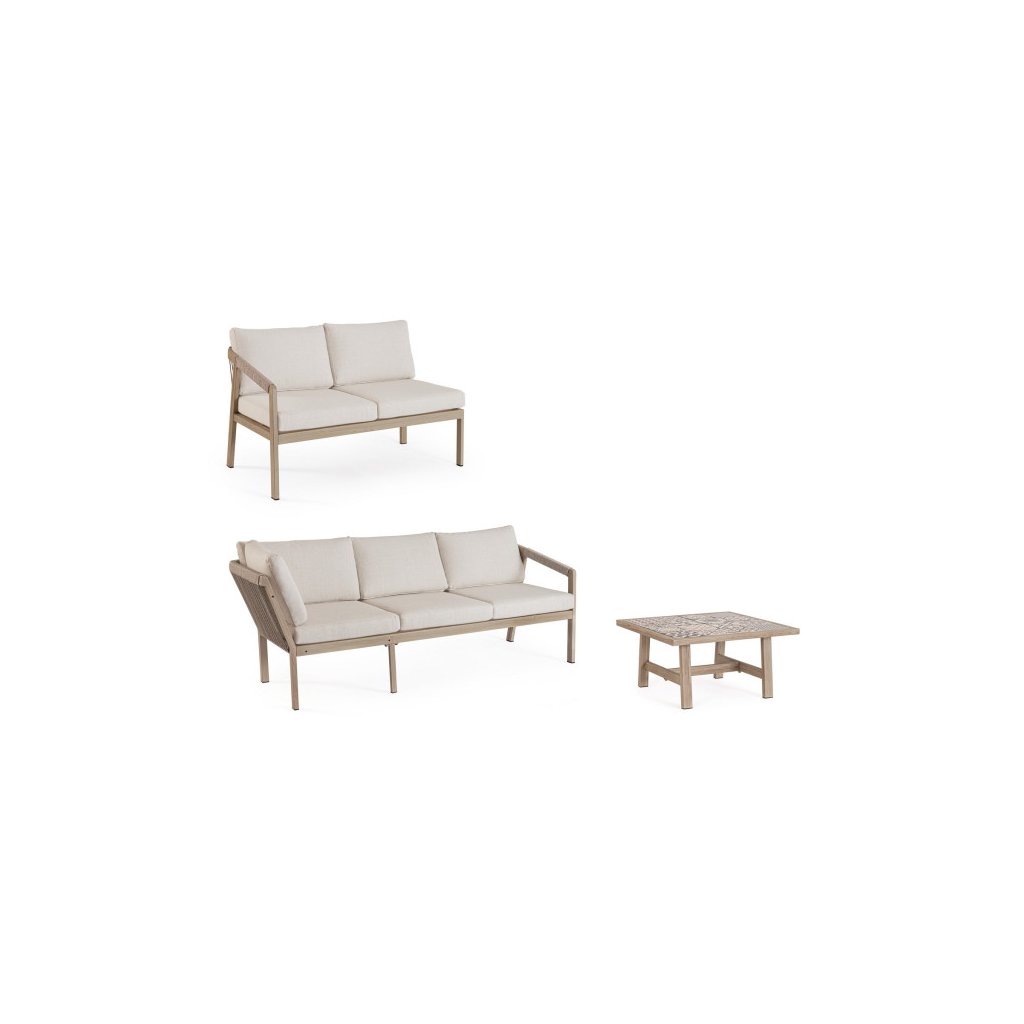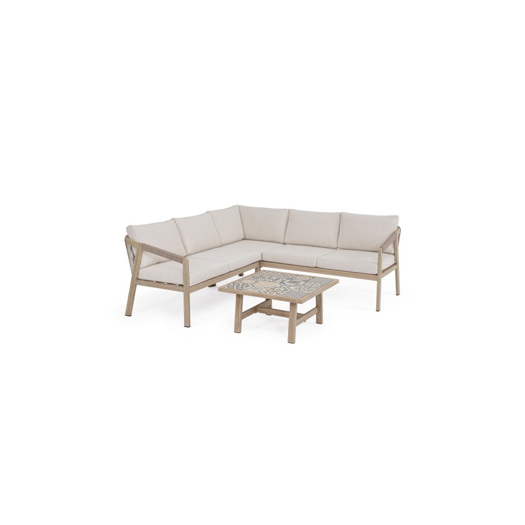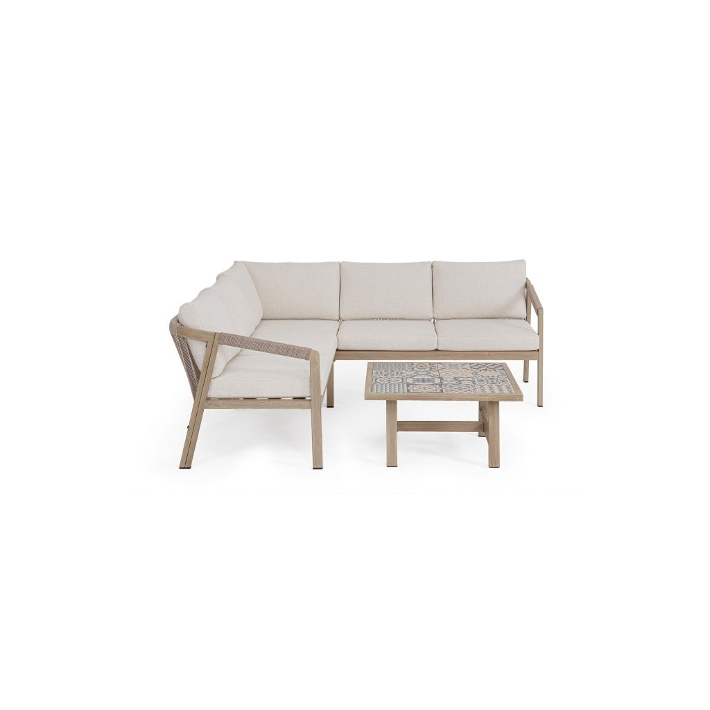 Designový zahradní set KALIMERA od italského výrobce stylového nábytku BIZZOTTO. Zahradní sestavu tvoří rohová pohovka a konferenční stolek. Celá sestava je vyrobena především z lehkého hliníku s jemným efektem dřeva ve světlé barvě. Pohovka má pak sedací a opěrné polštářky ze světlého olefinu, který je odolný UV záření a vodě. Příjemné vám budou i boční područky u obou. Díky materiálu hliníku jsou odolné a lehké na manipulaci. Konferenční stolek má stylové španělské keramické kachličky a dodává jedinečnost.