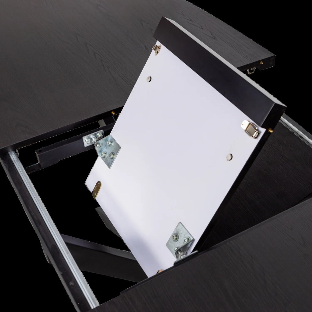 Stylový rozkládací jídelní stůl ARROS od holandské značky moderního nábytku WOOOD. Stůl je kompletně vyroben z překližky v černém provedení. MDF desky jsou povrchově upraveny a zároveň ošetřeny silným základním nátěrem. Stůl se skládá z oválné desky a čtyř navzájem zkřížených masivních nohou, což stolu dodává maximální stabilitu a poskytuje prostor k sezení u okrajů stolu.