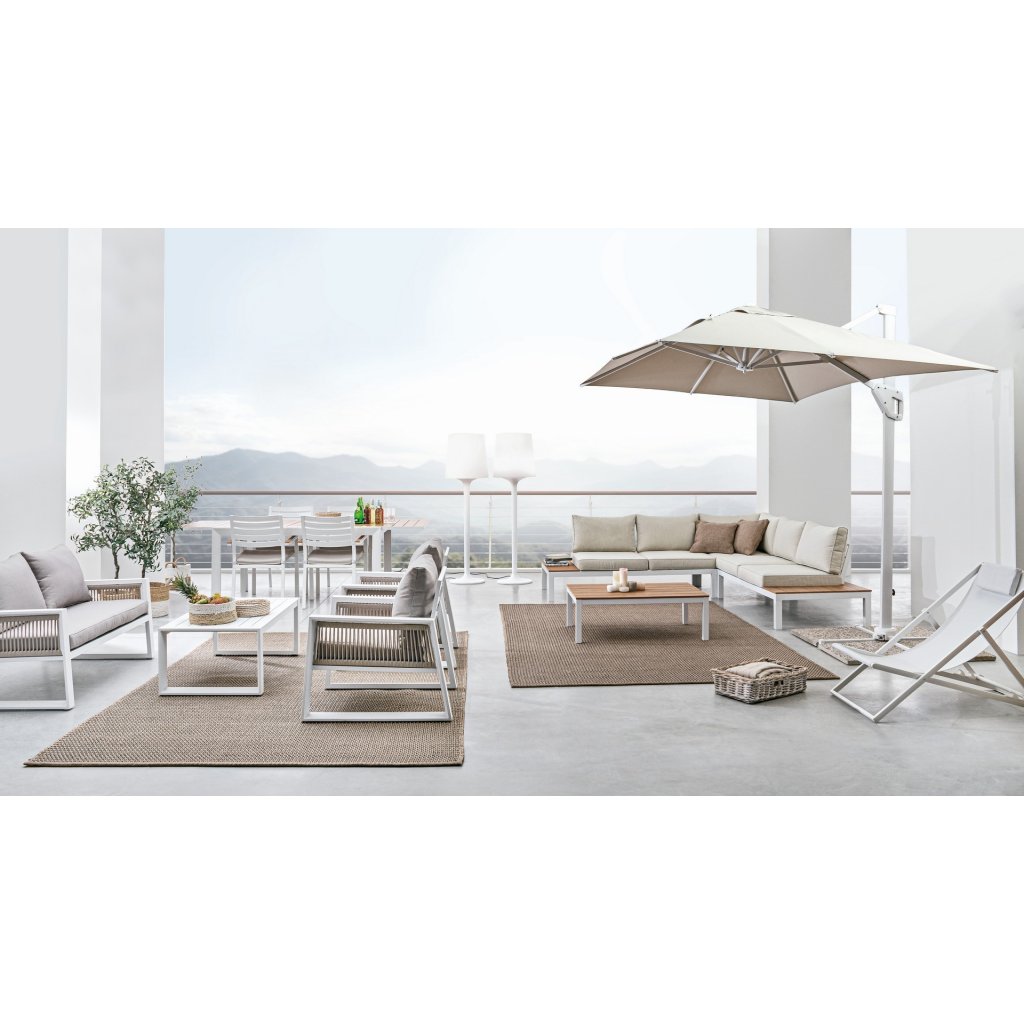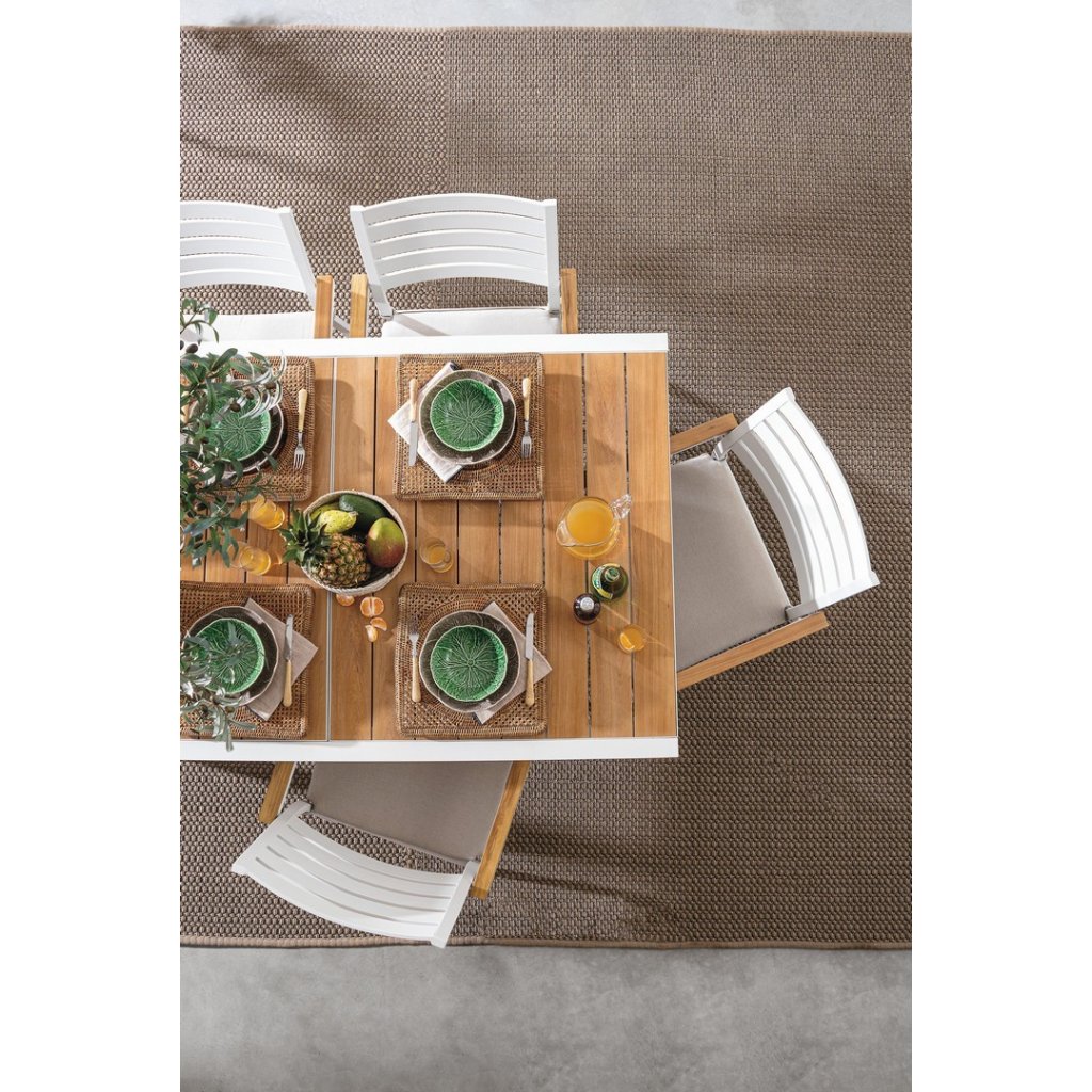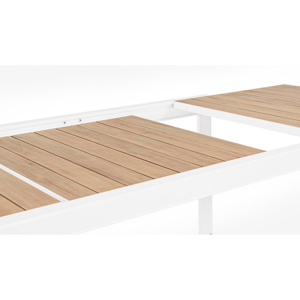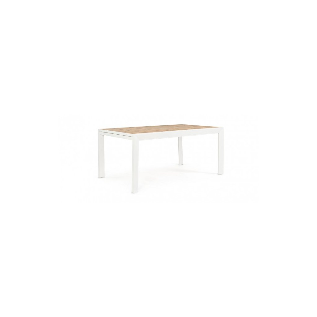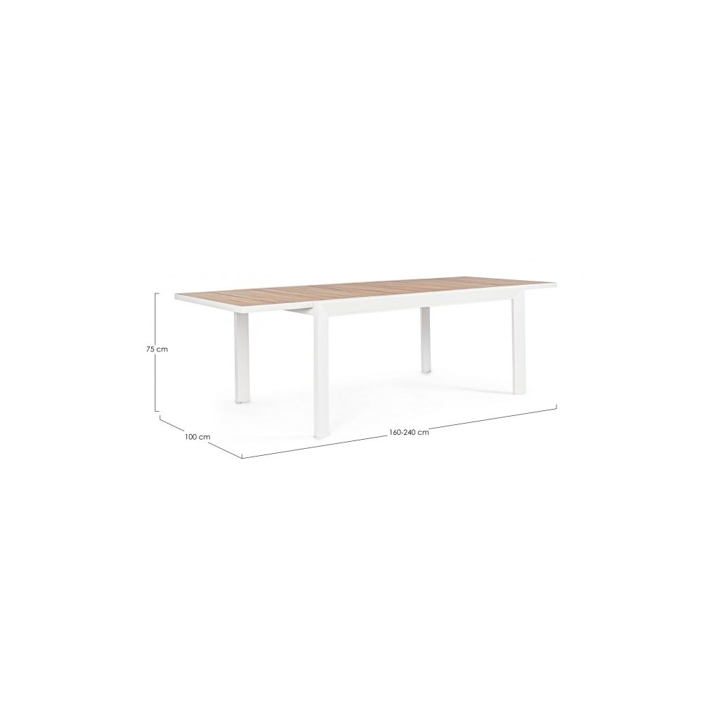 Stylový rozkládací zahradní stůl BELMAR od italského výrobce stylového nábytku BIZZOTTO. Stůl má 4 masivní nohy, které jsou vyrobeny z bíle lakovaného hliníku, což dodává stolu stabilitu, odolnost proti povětrnostním podmínkám a nízkou váhu. Vrchní deska má primární rozměry 160x100 cm, díky vnitřním dílu ji rozložíte na délku 240 cm. Deska je vyrobena z lišt s dřevěným efektem lakování. Díky tomu stůl můžete nechat téměř bez jakékoliv péče a obavy.