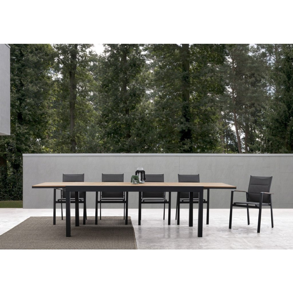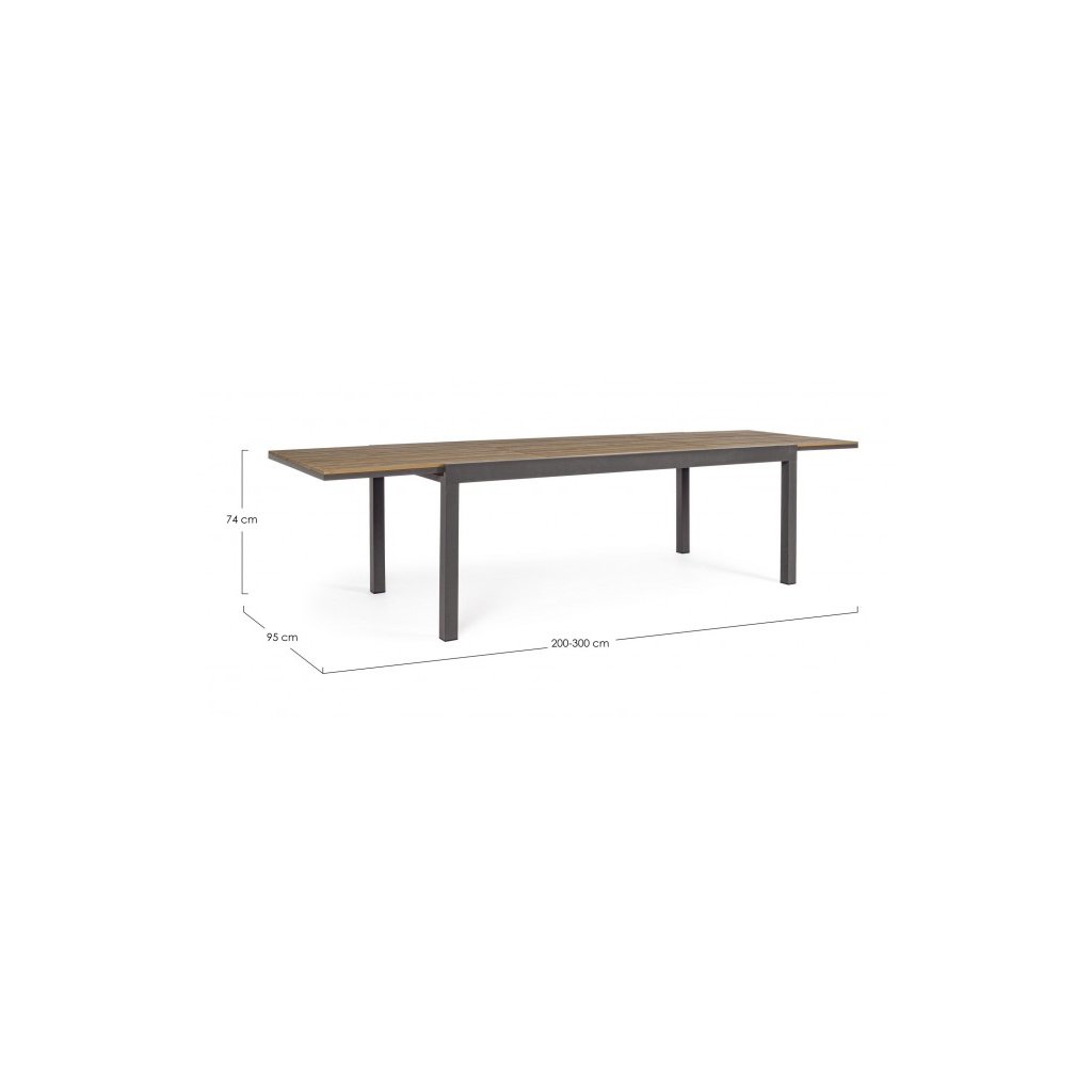 Stylový rozkládací zahradní stůl ELIAS od italského výrobce stylového nábytku BIZZOTTO. Stůl má 4 masivní nohy, které jsou vyrobeny z antracitově lakovaného hliníku, což dodává stolu stabilitu, odolnost proti povětrnostním podmínkám a nízkou váhu. Vrchní deska má primární rozměry 200x95 cm, díky vnitřním dílu ji rozložíte na délku 300 cm. Deska je tvořena z jednotlivých desek umělého dřeva POLYWOOD v barvě indického teaku. Díky tomu stůl můžete nechat téměř bez jakékoliv péče a obavy.