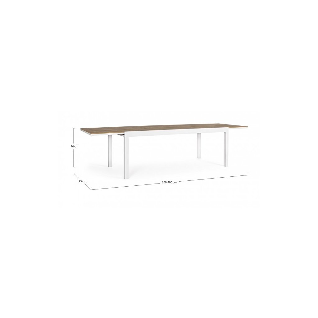 Stylový rozkládací zahradní stůl ELIAS od italského výrobce stylového nábytku BIZZOTTO. Stůl má 4 masivní nohy, které jsou vyrobeny z bíle lakovaného hliníku, což dodává stolu stabilitu, odolnost proti povětrnostním podmínkám a nízkou váhu. Vrchní deska má primární rozměry 200x95 cm, díky vnitřním dílu ji rozložíte na délku 300 cm. Deska je tvořena z jednotlivých desek umělého dřeva POLYWOOD v barvě indického teaku. Díky tomu stůl můžete nechat téměř bez jakékoliv péče a obavy.