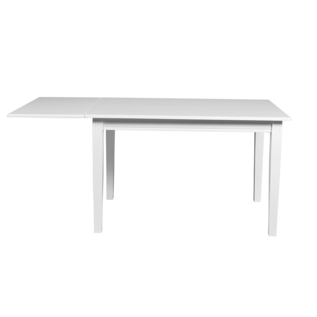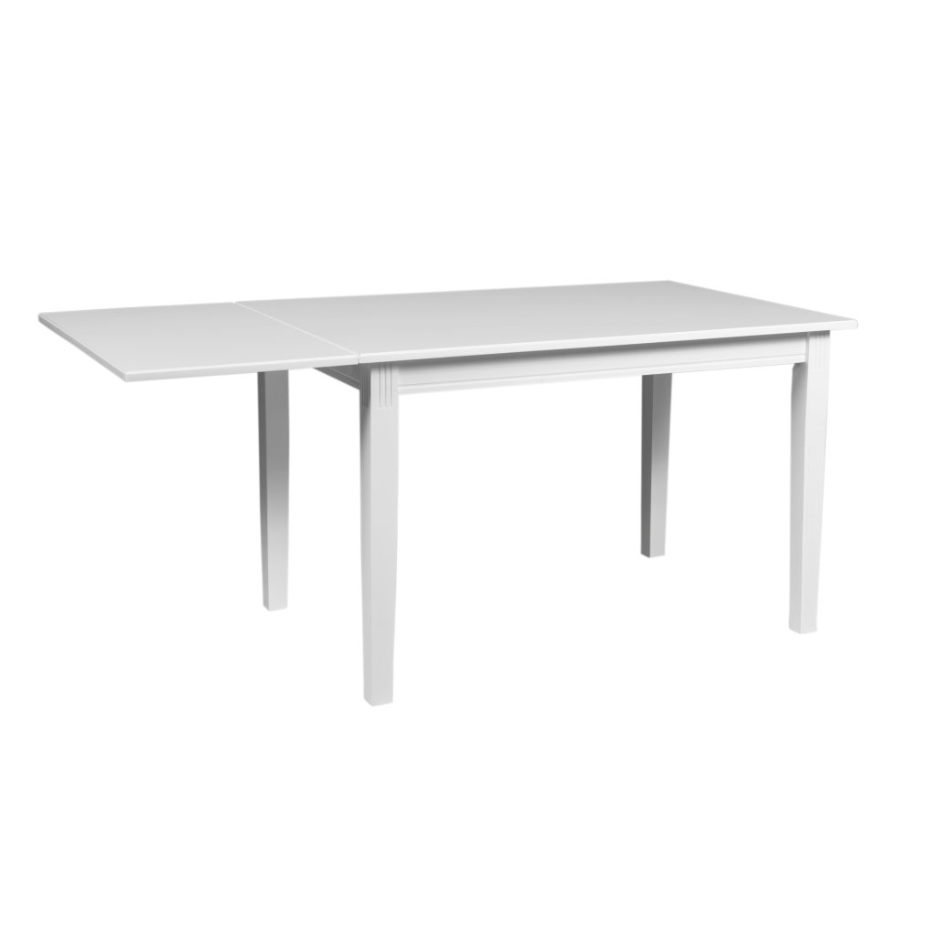 Rozkládací jídelní stůl WITTSKAR od švédského výrobce kvalitního nábytku ROWICO. Stůl tvoří 4 masivní nohy z dřeva kaučukovníku v bílém laku, které plynule přecházejí do vrchní rámu s deskou. Deska je skládací, hlavní část s rozměry 120x80 cm je vyrobena z bíle lakované dřevovláknité mdf desky. Na jedné straně lze vytažením povislé části zvětšit jídelní prostor až na 165x80 cm, což uvítají zejména ti, co mají malý prostor, ale rádi často hostí rodinu či přátele.