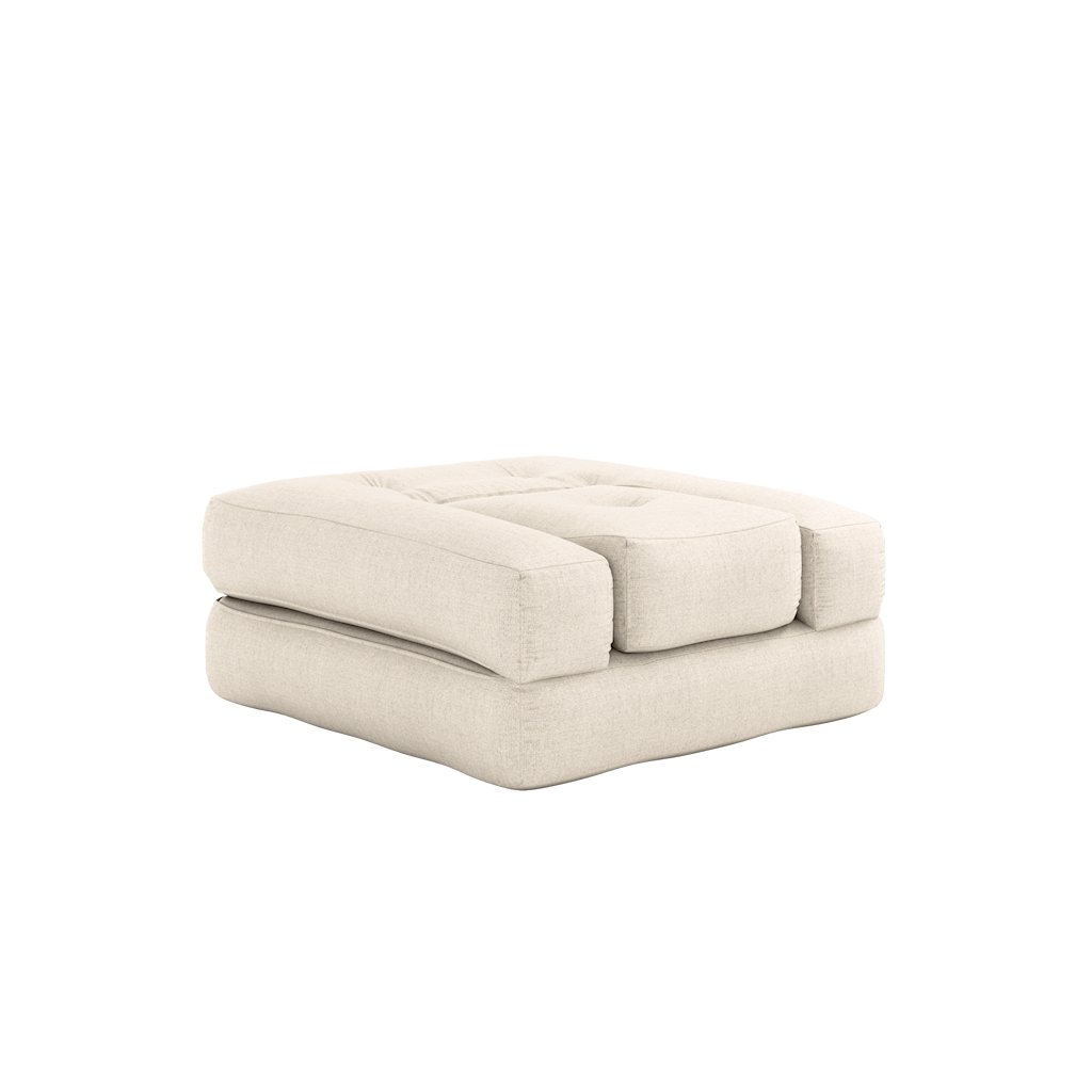 Rozkládací futonové křeslo CUBE 3v1 od výrobce nábytku a pohovek KARUP DESIGN. Křeslo představuje multifunkční kus nábytku, který se pouhým překlopením CUBE snadno přemění do celkem tří tvarů. Nízké křeslo s odpovídající podnožkou, pohodlná matrace pro přenocování hostů, nebo pěkný taburet. Vysoký komfort zajišťuje kvalitní pěna potažená povlakem z bavlny a lnu, který je mimořádně pohodlný a hebký na dotek. Jednoduchým způsobem křeslo rozložíte a dostanete lůžko s rozměry 90x190 cm.
