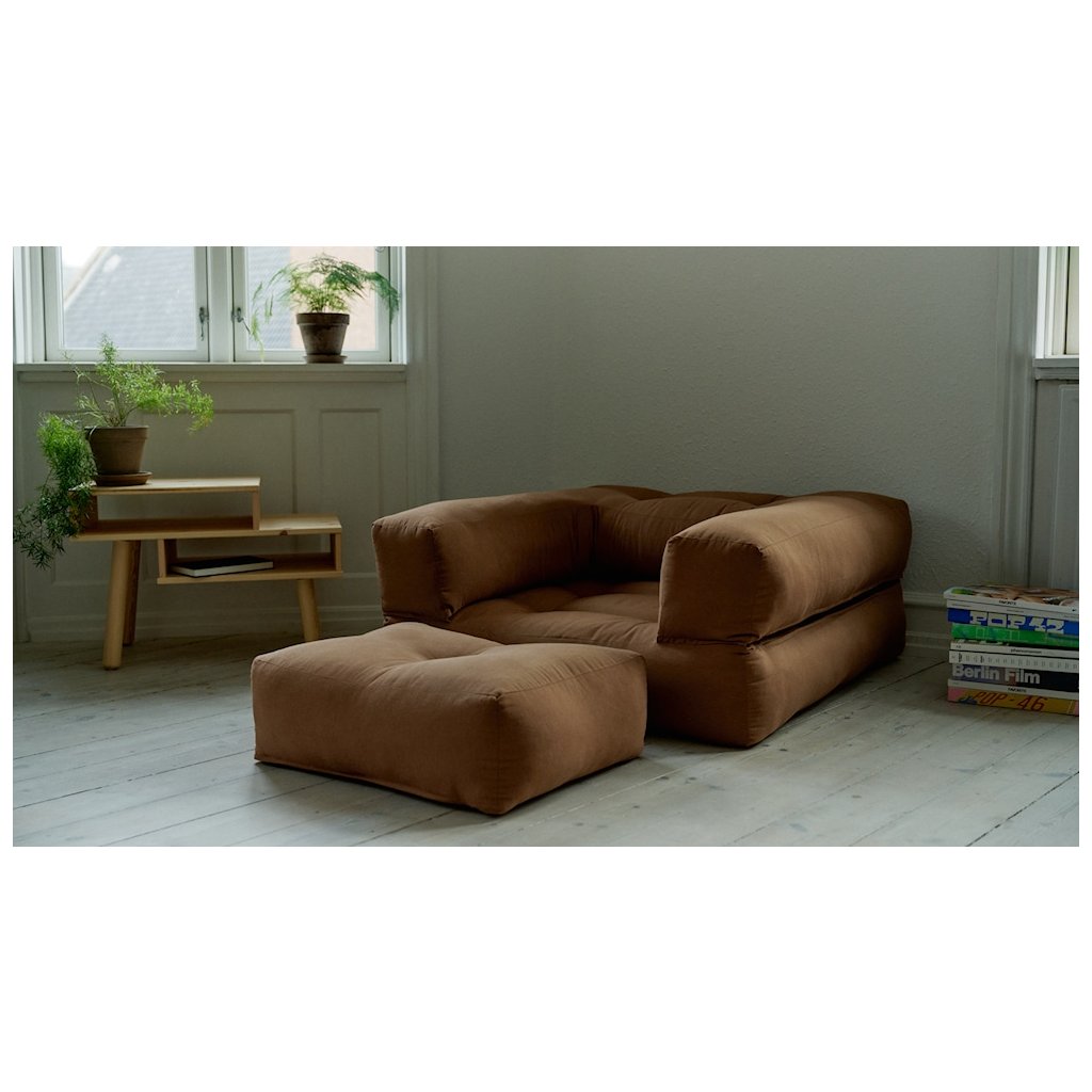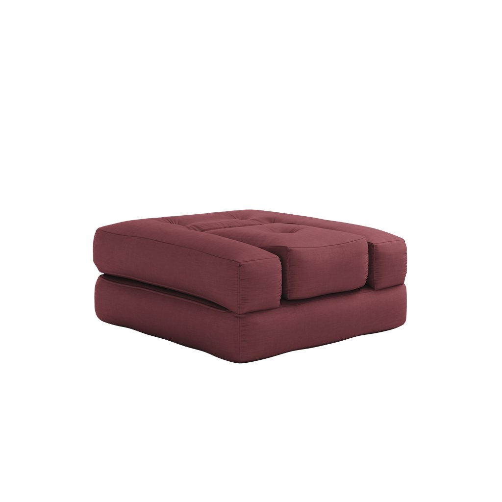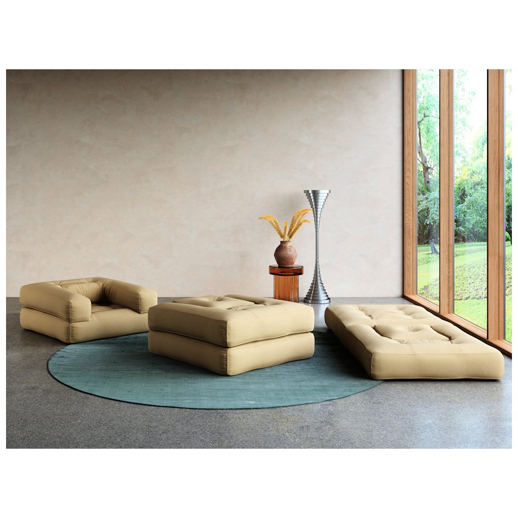 Rozkládací futonové křeslo CUBE 3v1 od výrobce nábytku a pohovek KARUP DESIGN. Křeslo představuje multifunkční kus nábytku, který se pouhým překlopením CUBE snadno přemění do celkem tří tvarů. Nízké křeslo s odpovídající podnožkou, pohodlná matrace pro přenocování hostů, nebo pěkný taburet. Vysoký komfort zajišťuje kvalitní pěna potažená povlakem z bavlny a lnu, který je mimořádně pohodlný a hebký na dotek. Jednoduchým způsobem křeslo rozložíte a dostanete lůžko s rozměry 90x190 cm.