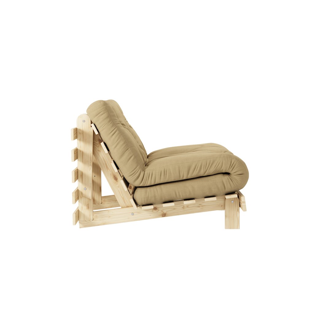 Stylové rozkládací křeslo ROOTS od stylového výrobce nábytku a pohovek KARUP DESIGN. Křeslo je dodávané z vysoce kvalitního borovicového dřeva s certifikací FSC ve světlém provedení a výplní matrace z pěny, kterou pokrývá bavlněný a polyesterový povlak v hořčičné barvě. Moderní vzhled, krásné provedení a elegantní nohy společně dodávají vše, co od rozkládacího křesla očekáváte. Představuje multifunkční kus nábytku, který může sloužit jako křeslo, lehátko či lůžko na spaní. Při snadném rozložení získáte místo na spaní s rozměry až 200x90 cm, což zajistí dostatečný prostor pro přespání vaší návštěvy.