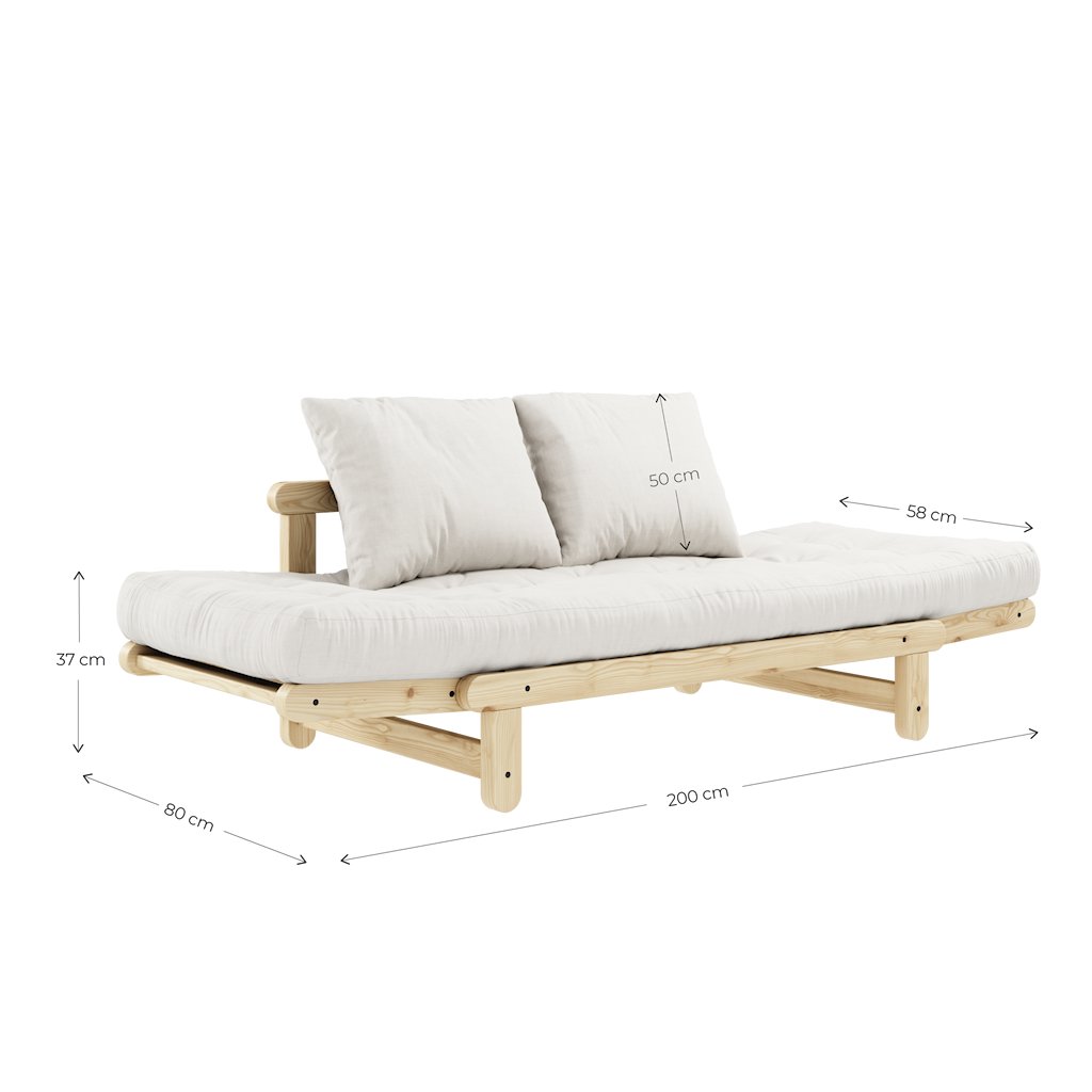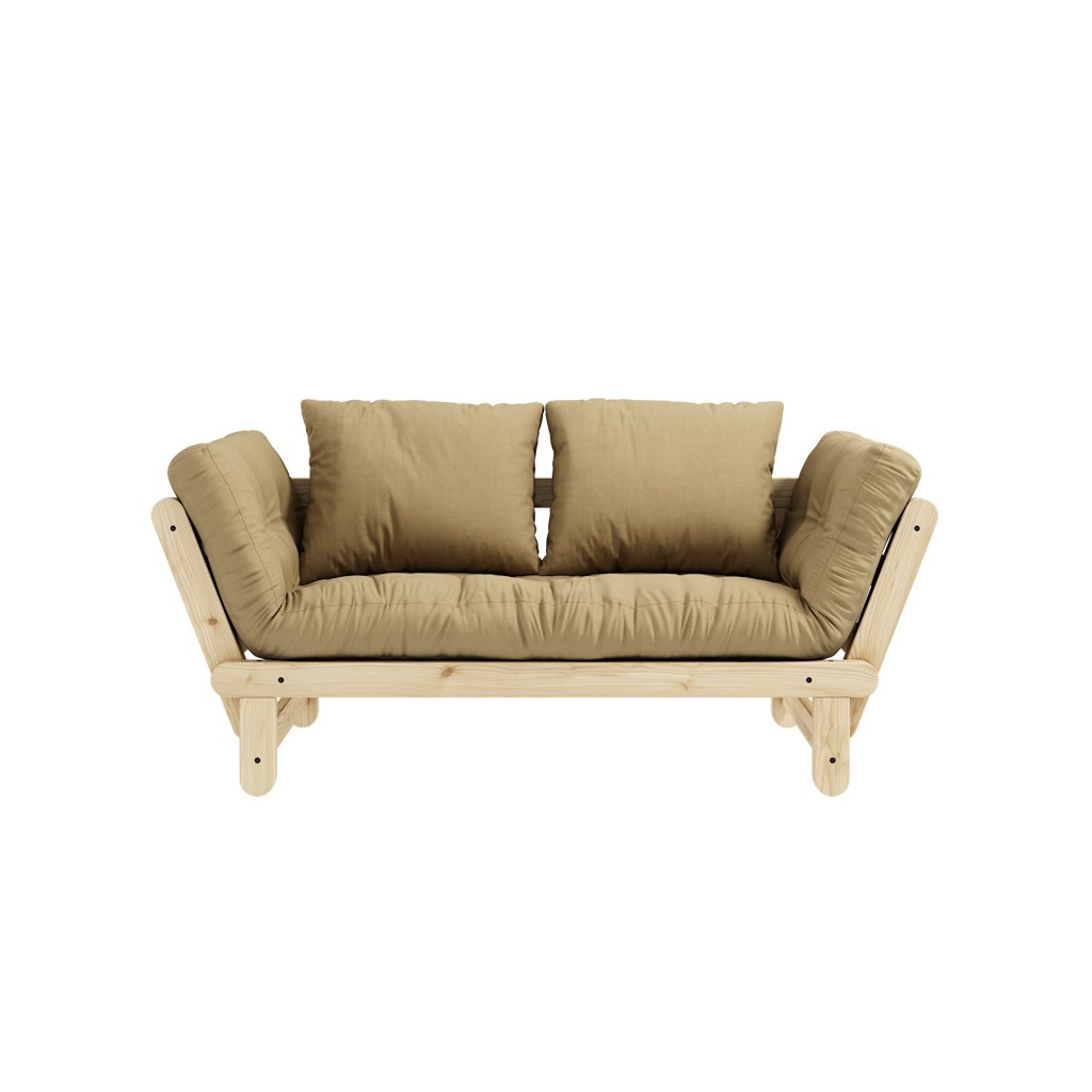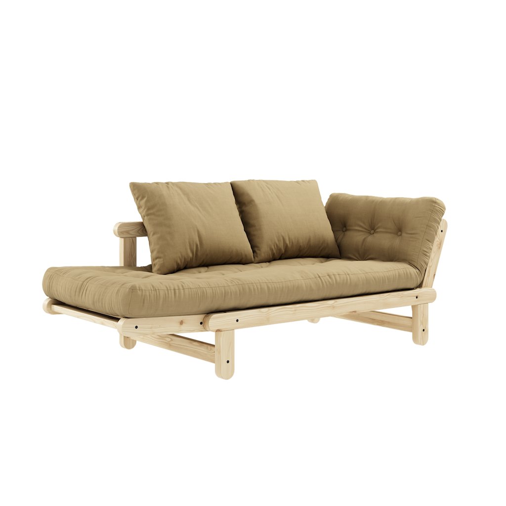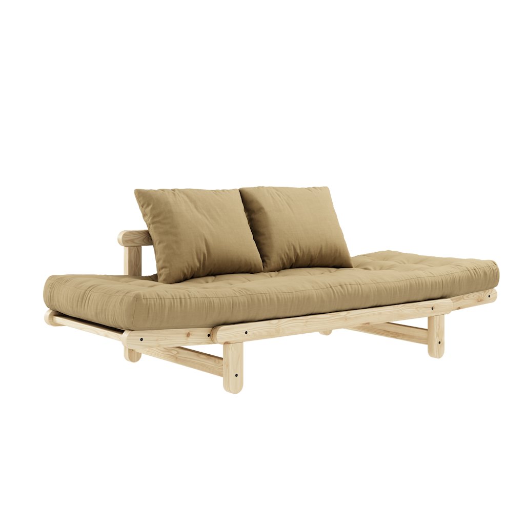 Dvoumístná rozkládací pohovka BEAT od stylového výrobce nábytku a pohovek KARUP DESIGN. Pohovka je vyrobena z vysoce kvalitního borovicového dřeva s certifikací FSC ve světlém provedení a futonové matrace s pěnovou výplní, kterou pokrývá bavlněný a lněný povlak v béžové barvě. Moderní vzhled, krásné provedení a elegantní nohy společně dodávají pohovce BEAT vše, co od rozkládací pohovky očekáváte. Díky délce 162 cm se na pohovku pohodlně vejdou 2 osoby. Při rozložení získáte místo na spaní s rozměry až 80x200 cm, což zajistí dostatečný prostor pro přespání vaší návštěvy. Jednoduchým rozložením jedné boční opěrky získáte stylovou zadní oporu.