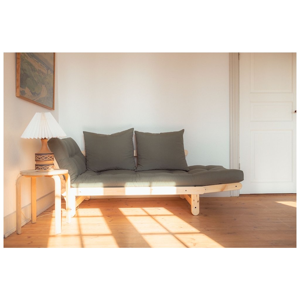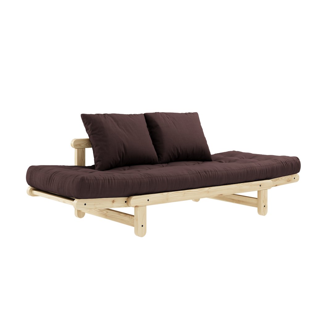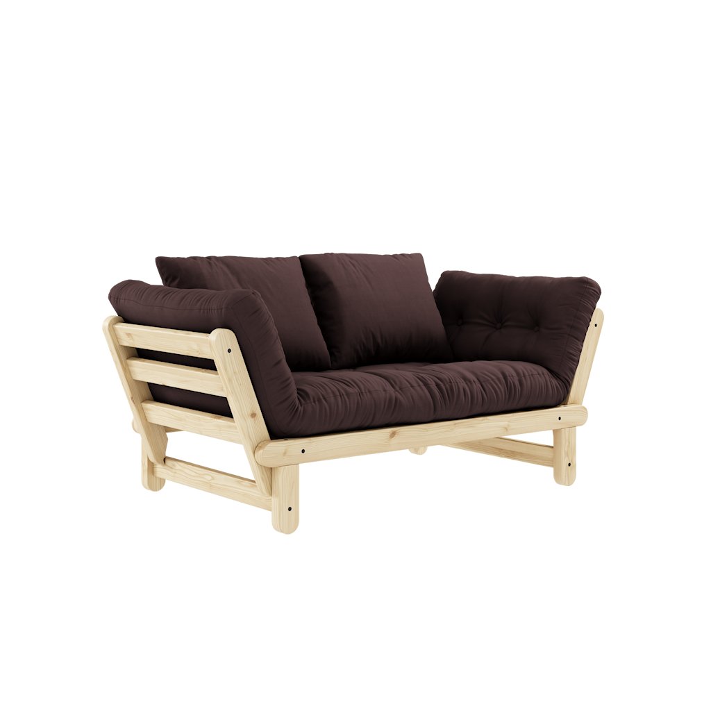 Dvoumístná rozkládací pohovka BEAT od stylového výrobce nábytku a pohovek KARUP DESIGN. Pohovka je vyrobena z vysoce kvalitního borovicového dřeva s certifikací FSC ve světlém provedení a futonové matrace s pěnovou výplní, kterou pokrývá bavlněný a lněný povlak ve tmavě hnědé barvě. Moderní vzhled, krásné provedení a elegantní nohy společně dodávají pohovce BEAT vše, co od rozkládací pohovky očekáváte. Díky délce 162 cm se na pohovku pohodlně vejdou 2 osoby. Při rozložení získáte místo na spaní s rozměry až 80x200 cm, což zajistí dostatečný prostor pro přespání vaší návštěvy. Jednoduchým rozložením jedné boční opěrky získáte stylovou zadní oporu.