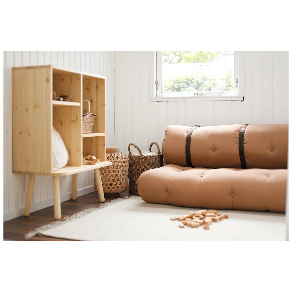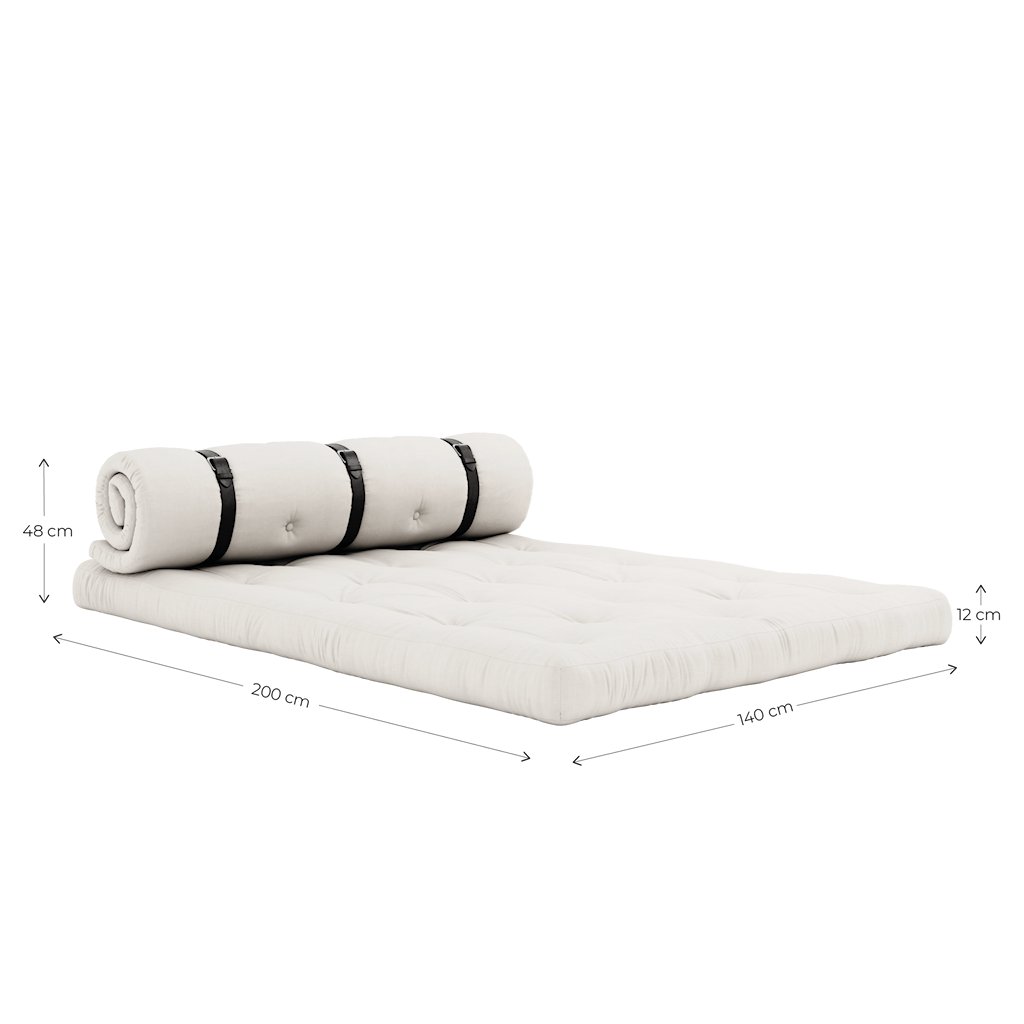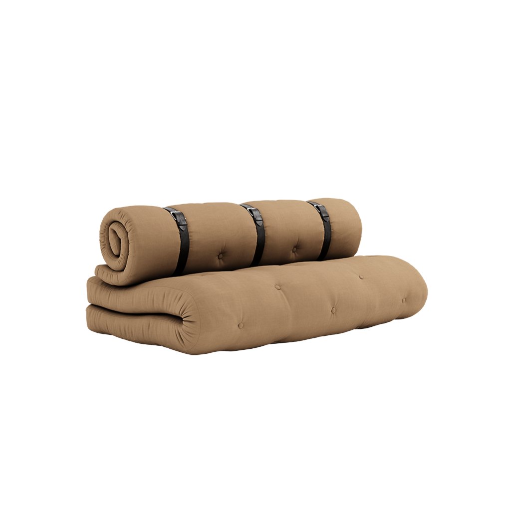 Rozkládací pohovka BUCKLE UP od dánského výrobce stylového nábytku KARUP DESIGN. Pohovka představuje multifunkční kus nábytku, který můžete využít jako pohovku s délkou 140 cm nebo jako postel s rozměry 140x200 cm. Futonová matrace s pěnovou výplní zajištuje pohodlné spaní i sezení. Buckle Up se skládá ze spodní a horní matrace, přičemž jejich spojení zajišťují elegantní kožené pásky. Matraci pokrývá bavlněný a polyesterový povlak v mocca barvě, příjemný na dotek a snadný na údržbu.