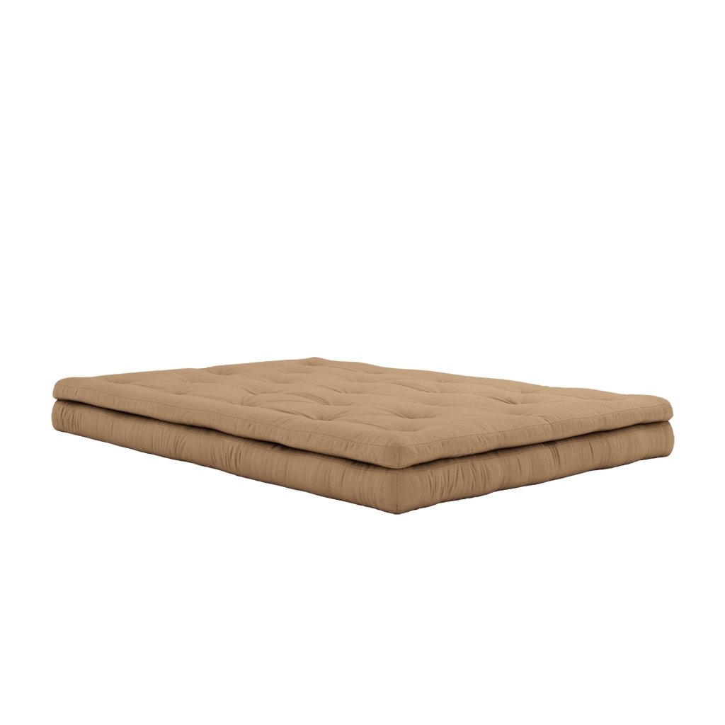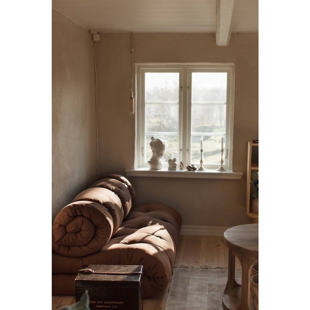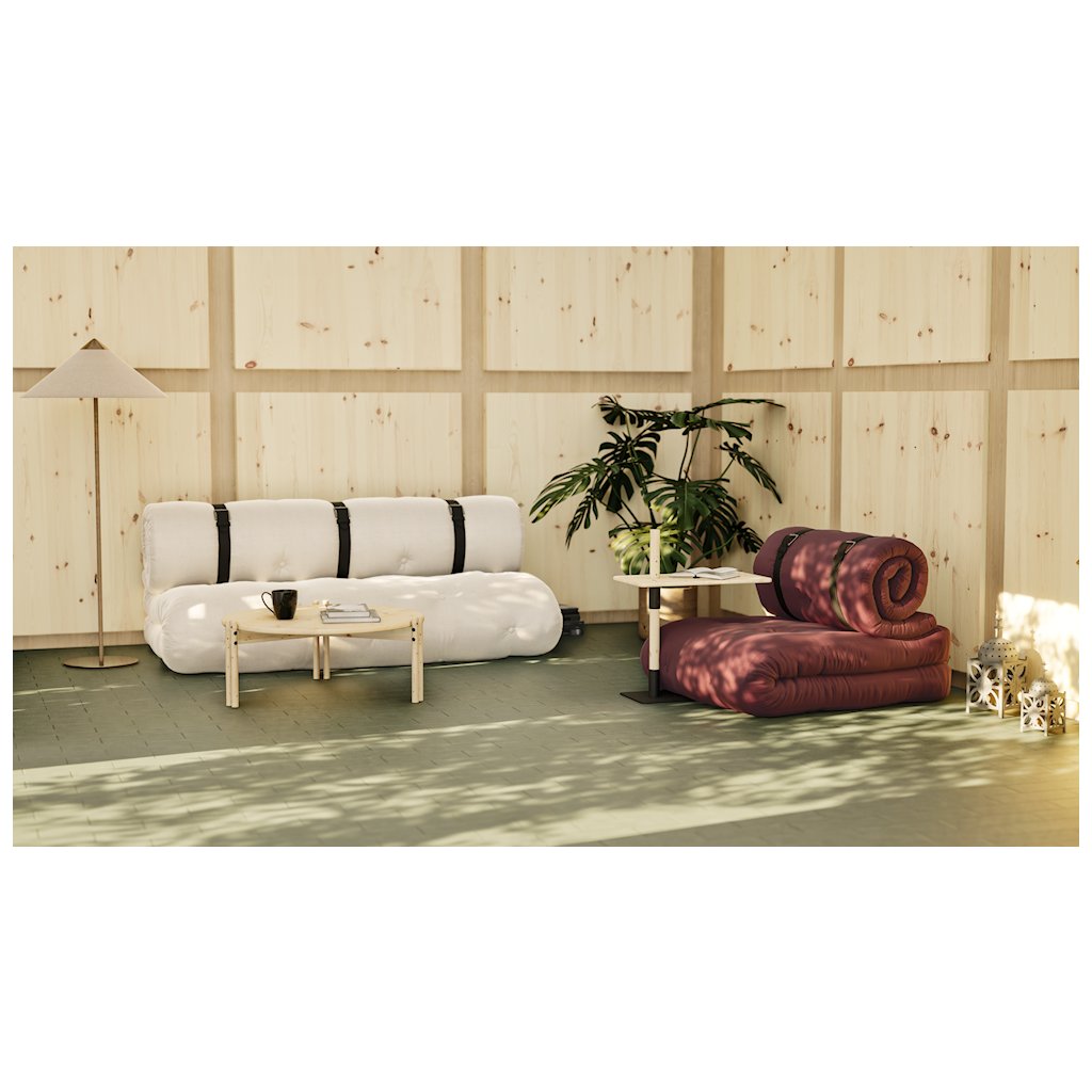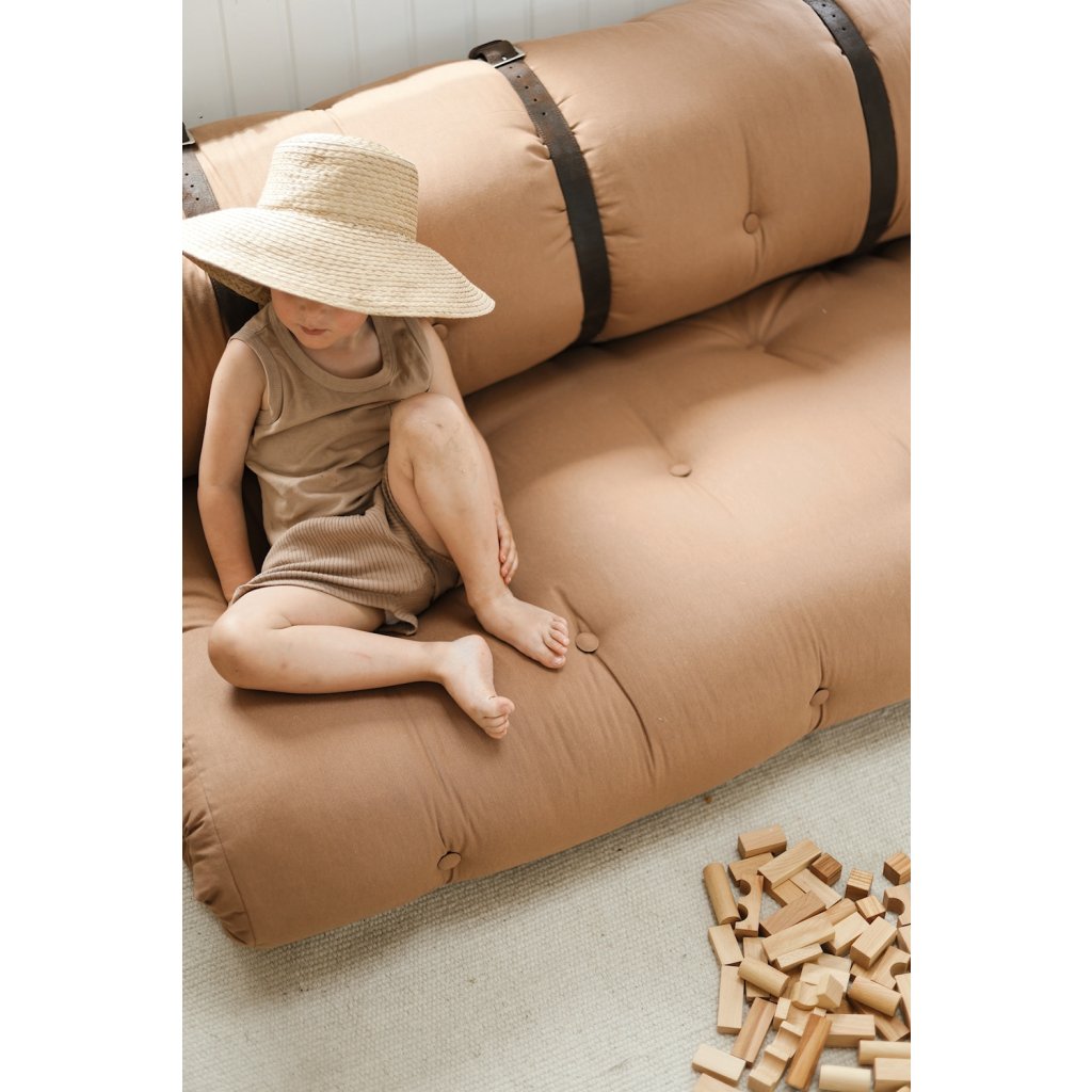 Rozkládací pohovka BUCKLE UP od dánského výrobce stylového nábytku KARUP DESIGN. Pohovka představuje multifunkční kus nábytku, který můžete využít jako pohovku s délkou 140 cm nebo jako postel s rozměry 140x200 cm. Futonová matrace s pěnovou výplní zajištuje pohodlné spaní i sezení. Buckle Up se skládá ze spodní a horní matrace, přičemž jejich spojení zajišťují elegantní kožené pásky. Matraci pokrývá bavlněný a polyesterový povlak v mocca barvě, příjemný na dotek a snadný na údržbu.