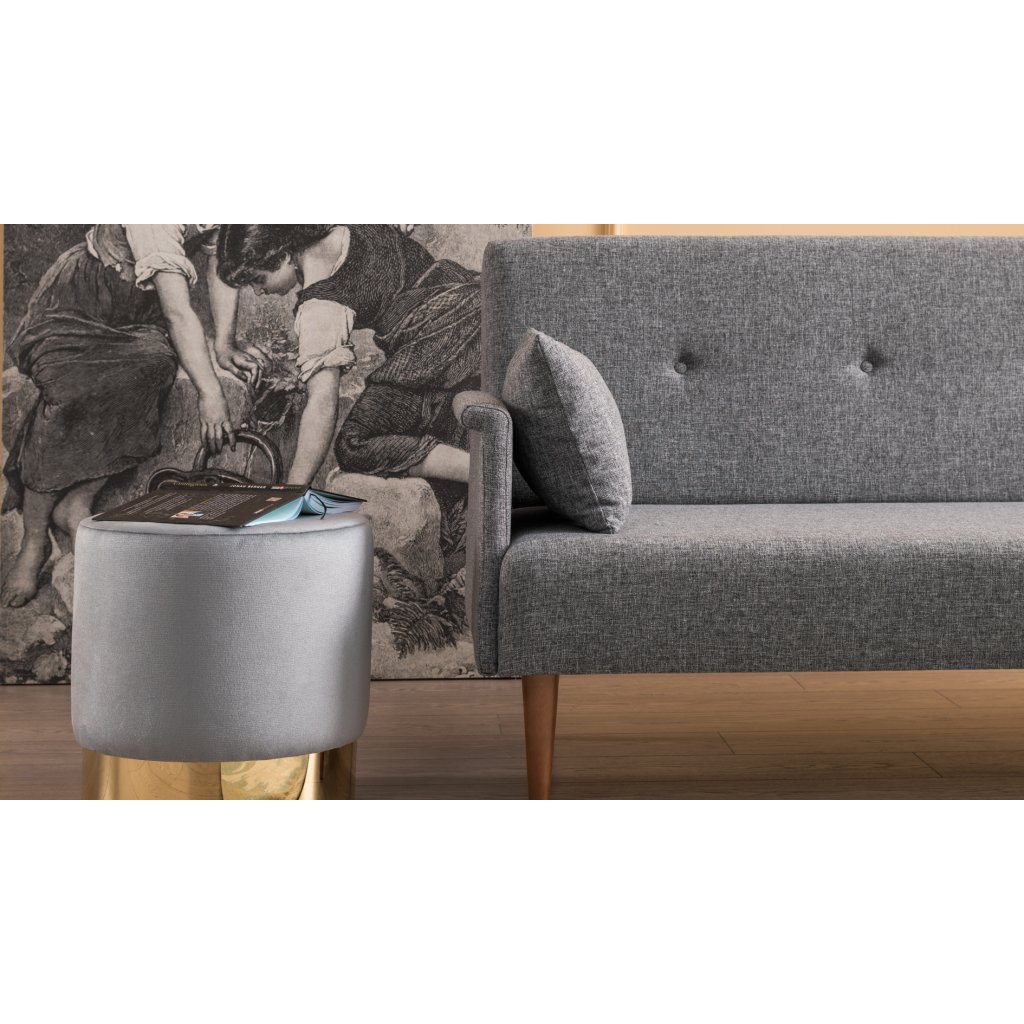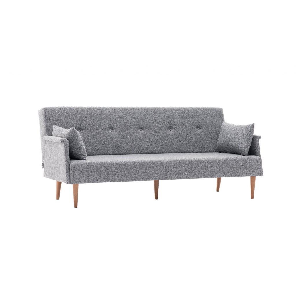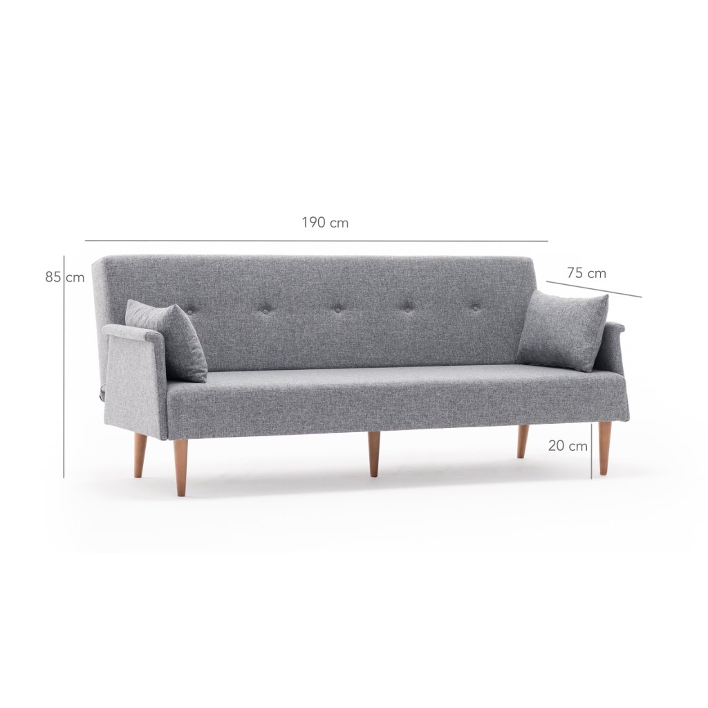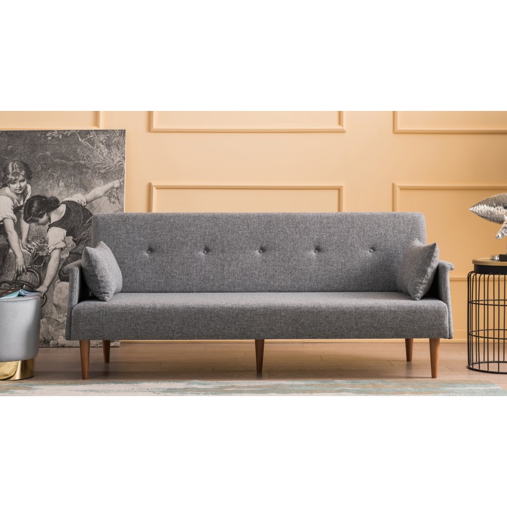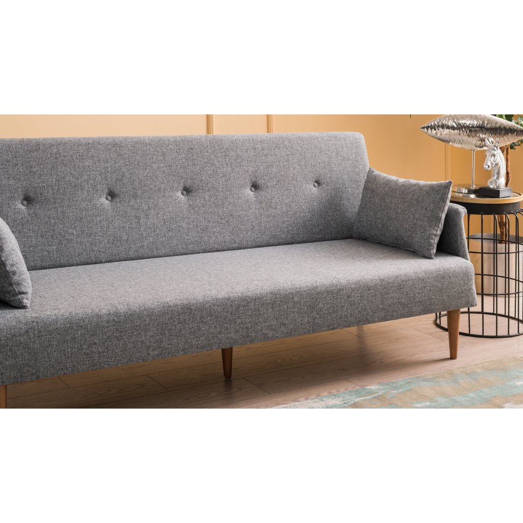 Krásná a stylová rozkládací pohovka NAVAN od výrobce nábytku a pohovek Hanah Home. Stylová pohovka NAVAN je tvořena nohami z ořechového dřeva, které dodávají maximální stabilitu, nosnost a pevnost. Nohy jsou připevněné k bukové konstrukci, na které je přidělaná pěna pro vaše maximální pohodlí. Vlastní pohovku pak tvoří příjemný kvalitní potah z polyesteru v šedé barvě. Pro ještě větší komfort vám poslouží dva velké volné polštářky pro opření. Pohovku můžete rozložit a vznikne vám tak místo na spaní s rozměry 110x190 cm.